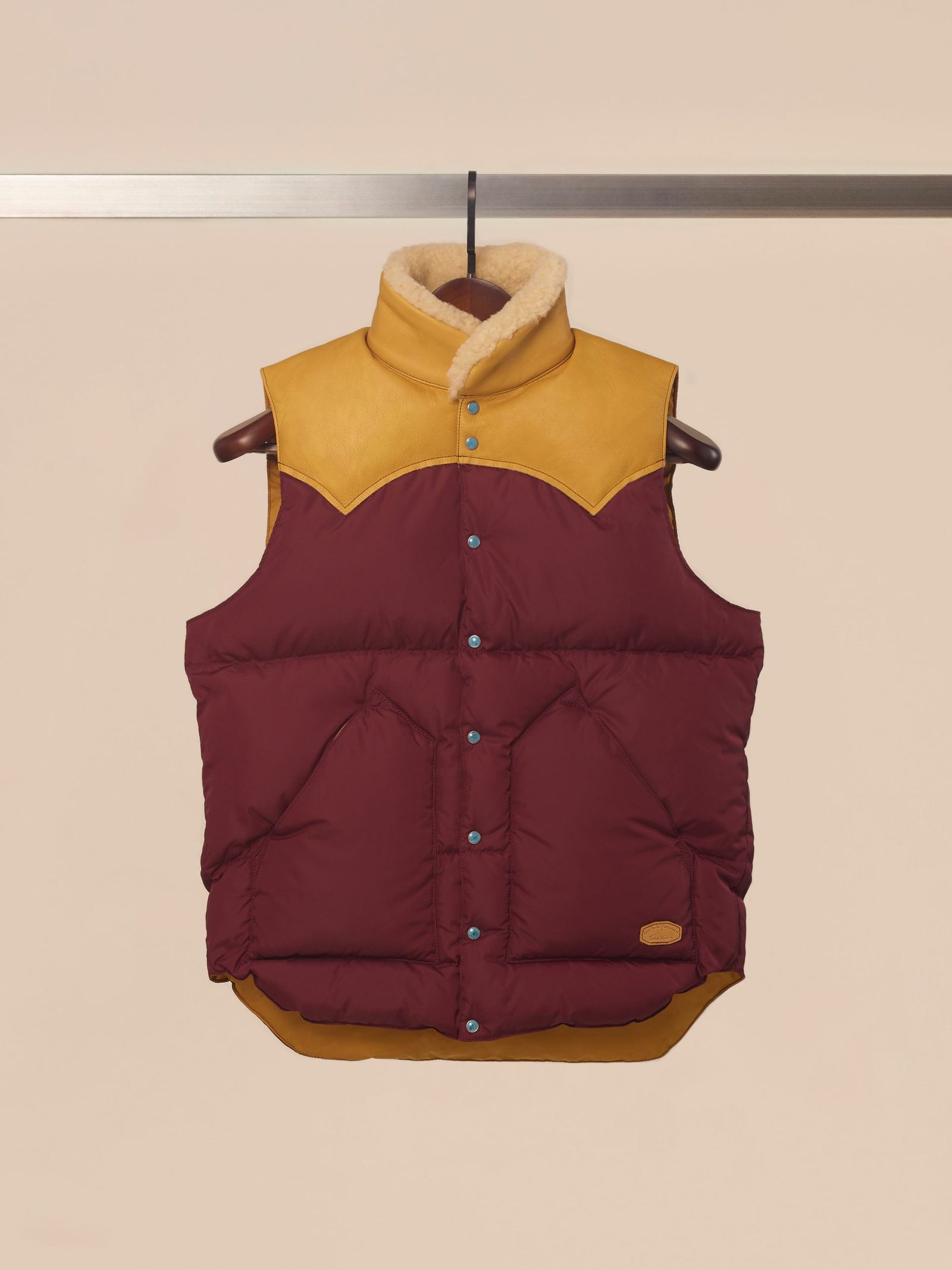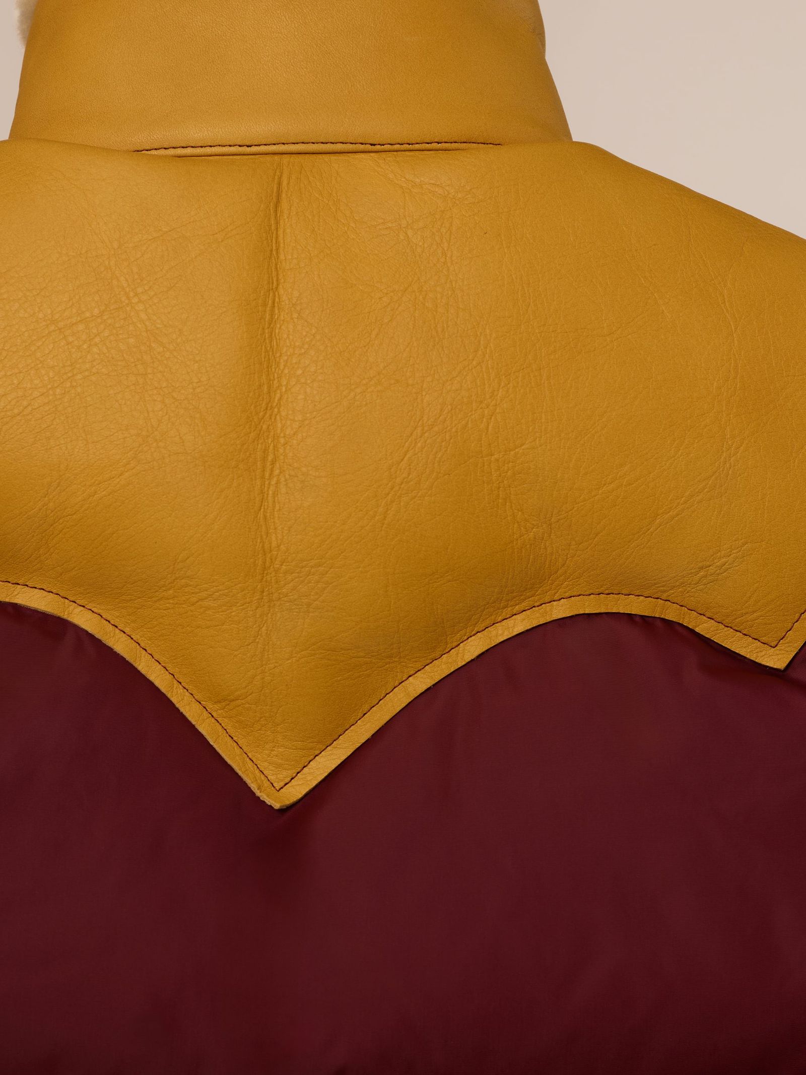 「ロッキーマウンテン フェザーベッド」は60年代後半にワイオミング州ジャクソンホールで誕生し、ネイティブアメリカンのレザーケープから着想を得たヨーク構造のダウンベストで知られる。一時休止を経て、日本人のコレクター、寺本欣児が復活させた。今回のコラボレーションでは、その歴史的背景と「ジャック マリー マージュ」の彫刻的なデザイン美学を掛け合わせた。