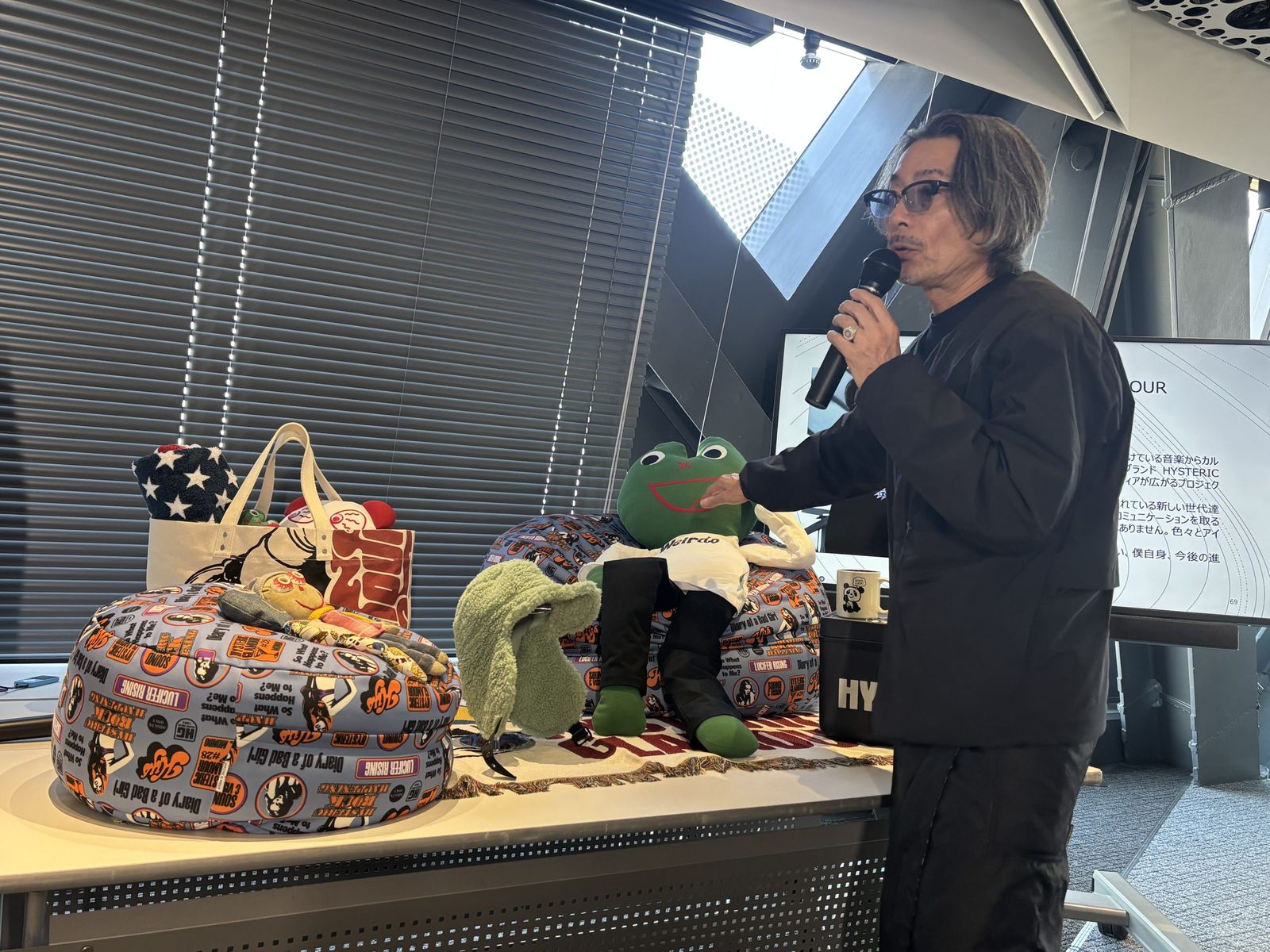 最後に「ヒステリックグラマー」を有するオゾンコミュニティの北村信彦氏が、素材提供、共同開発した試作品を発表。スピーカーが内蔵されたフライトキャップや、ピクニックなど行った先で音を流して楽しめるトートバッグ、音が流れる”WEIRD FROG”のぬいぐるみなどをラインアップした。このぬいぐるみが着用しているのは、阿波で裁縫、仕上げをおこなった「ヒステリックミニ(HYSTERIC MINI)」のTシャツだ。
