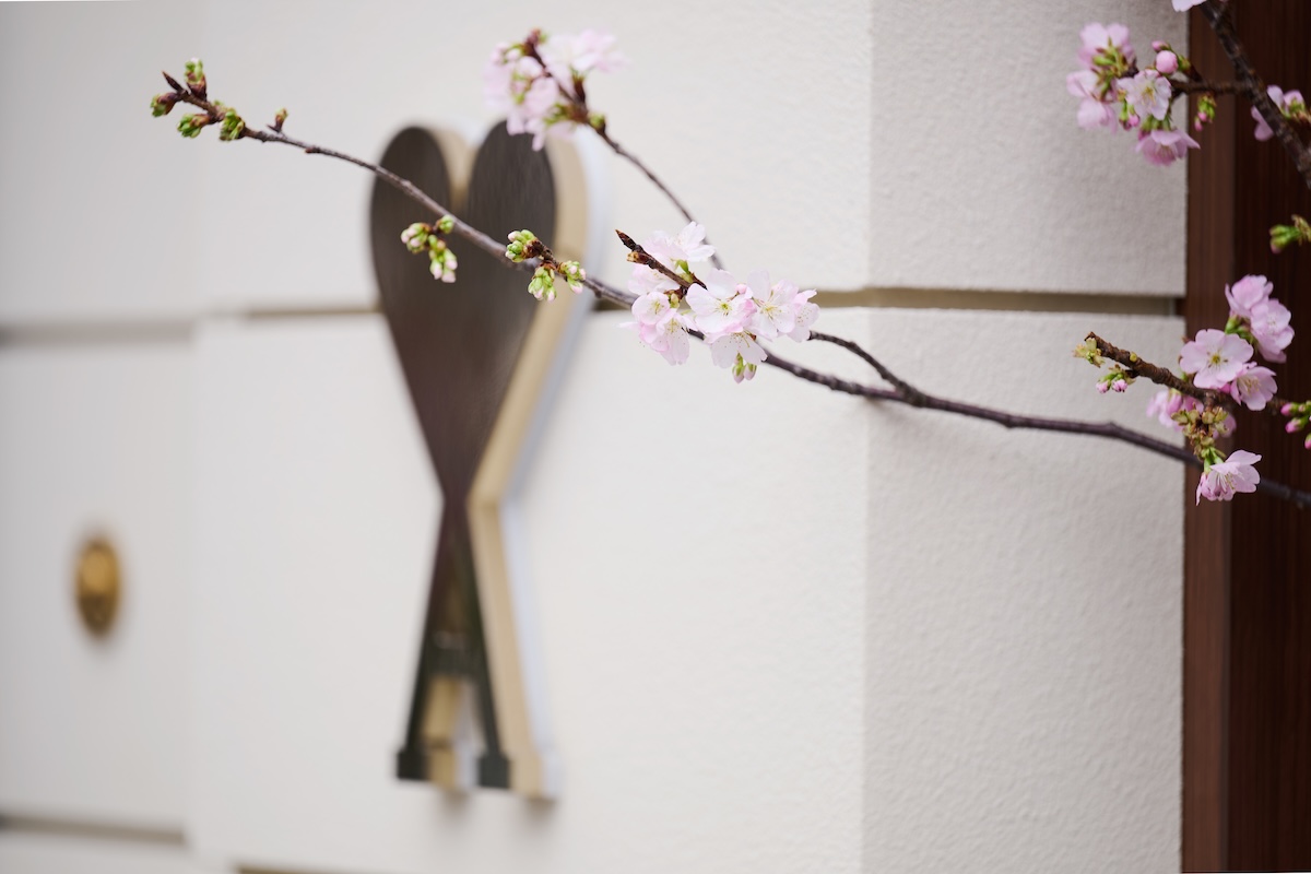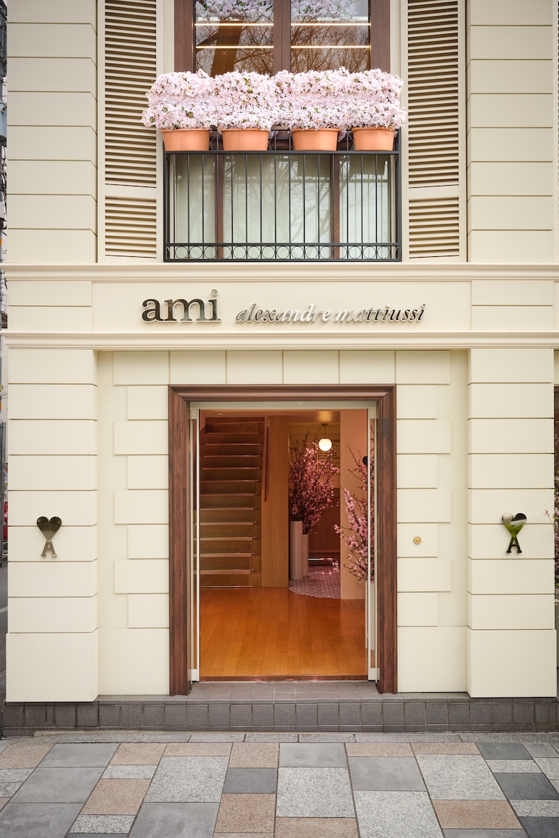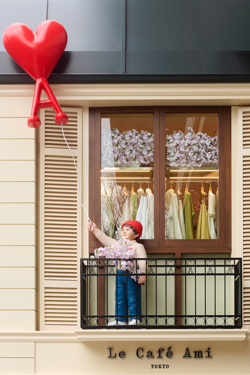 ブティックの象徴であるバルコニーに立つ少年の像は、トレードマークである“アミ ド クール”のバルーンとともに桜のブーケを手にし、フランス・パリの建築美と日本文化、美意識が融合した世界観を表現している。