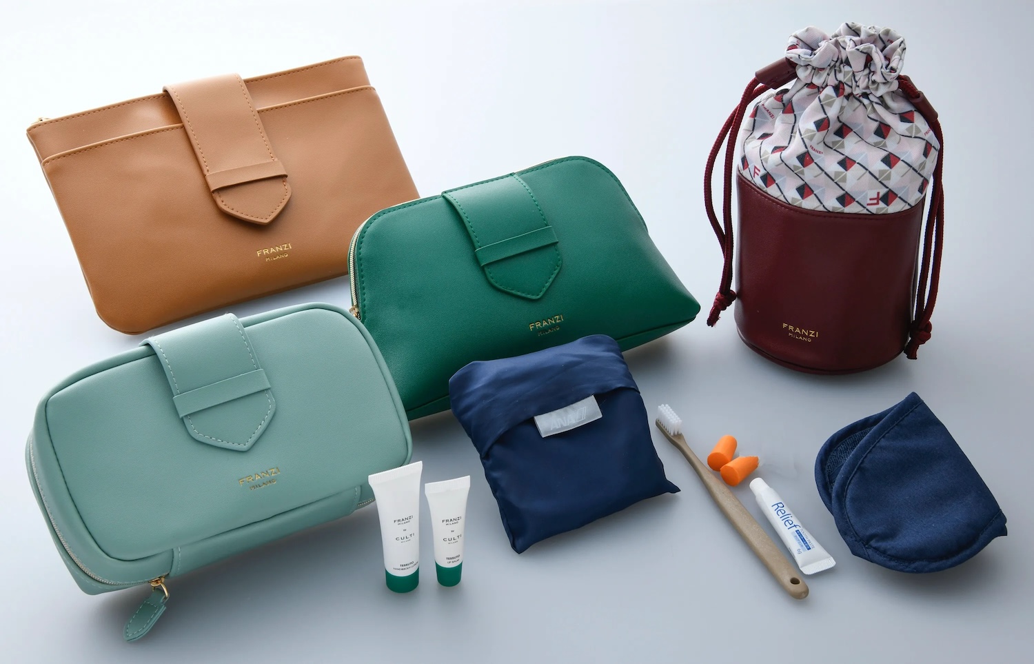 近年は、機内アメニティーとして初めてコラボするブランドを選んでいる。今回ポーチに採用した「フランツィ」は、160年の歴史を持つイタリアの名門。アイコンバッグ“マルゲリータ”や“カミラ”などの剣先のディテールはそのままに、今回のために独自開発したという環境配慮型素材“Fr-ECLAIM”で仕上げた。