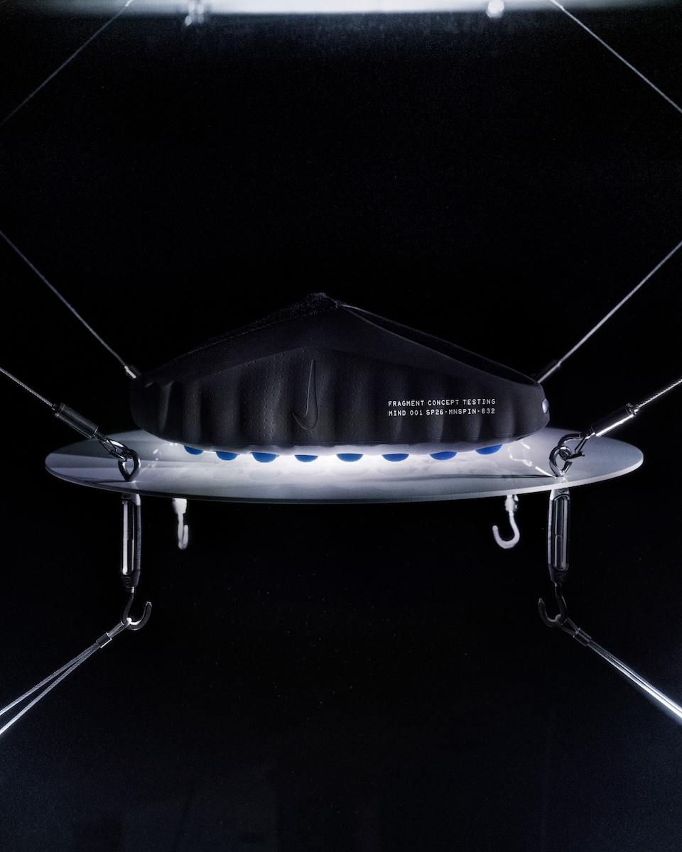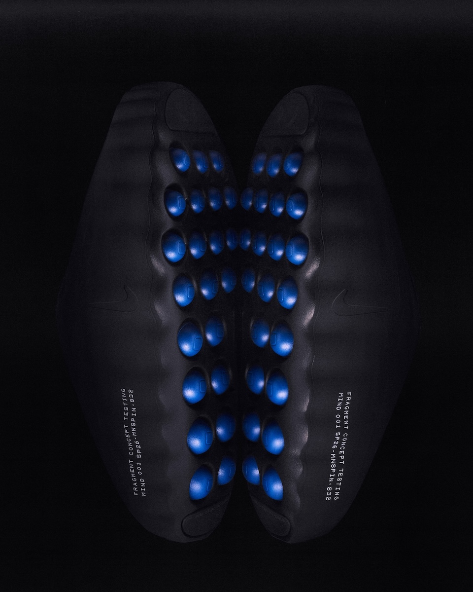 足元からマインドを呼び覚ますミュールの“ナイキ × フラグメント コンセプト テスティング マインド 001”も、同様のアプローチで本体のスマートなブラックに対し、フォームのノードには目をひくブルーを用い、個性的に仕上げた。神経科学をもとに開発した“マインド 002”をベースにした“ナイキ × フラグメント コンセプト テスティング マインド 002”は、新しいアッパー素材を採用しながら、ブラックとブルーの組み合わせを取り入れた。藤原は、同モデルについて、「“ナイキ マインド 002”には実験的な視点を取り入れて、全く異なる素材を組み合わせ、アッパーも違うものと取り替えてみました。その結果、夏に履きたいと思う全く異なるスニーカーになりました」と話す。
