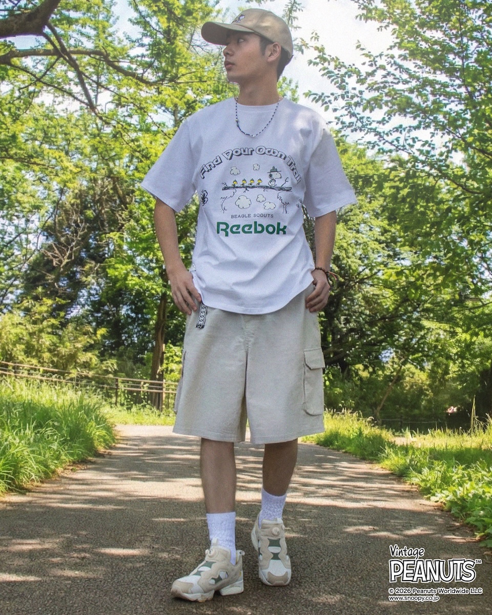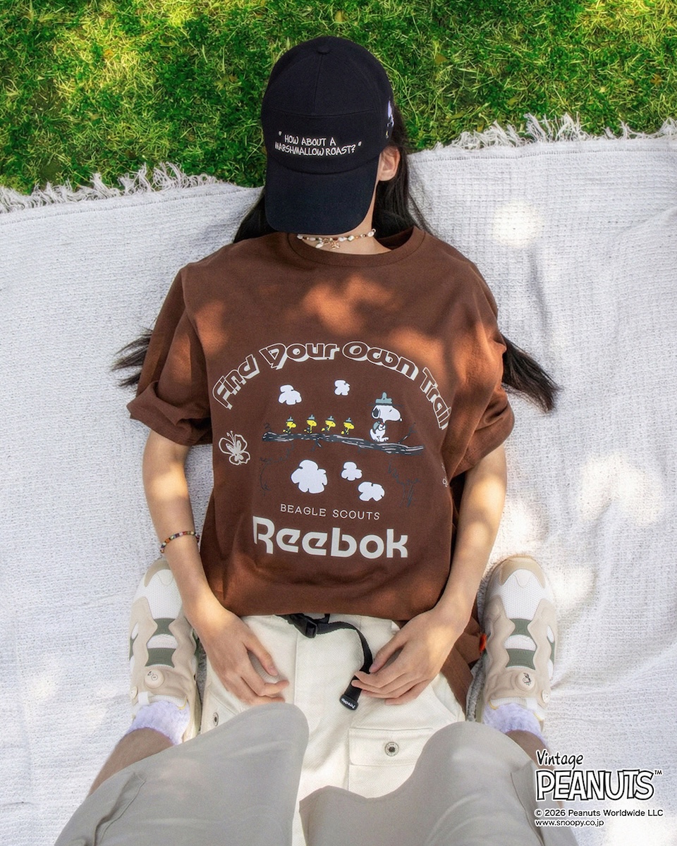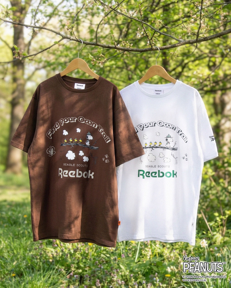 “ピーナッツ ビーグル スカウト ティー”(全2色、各6600円)は、「リーボック」の定番Tシャツで、ビーグルスカウトたちの冒険をハイライト。フロントにはビーグルスカウトのスヌーピー隊長に続く仲間たちの“丸太の橋”のシーンをプリントし、ホワイトとブラウンの2つのカラーで展開する。