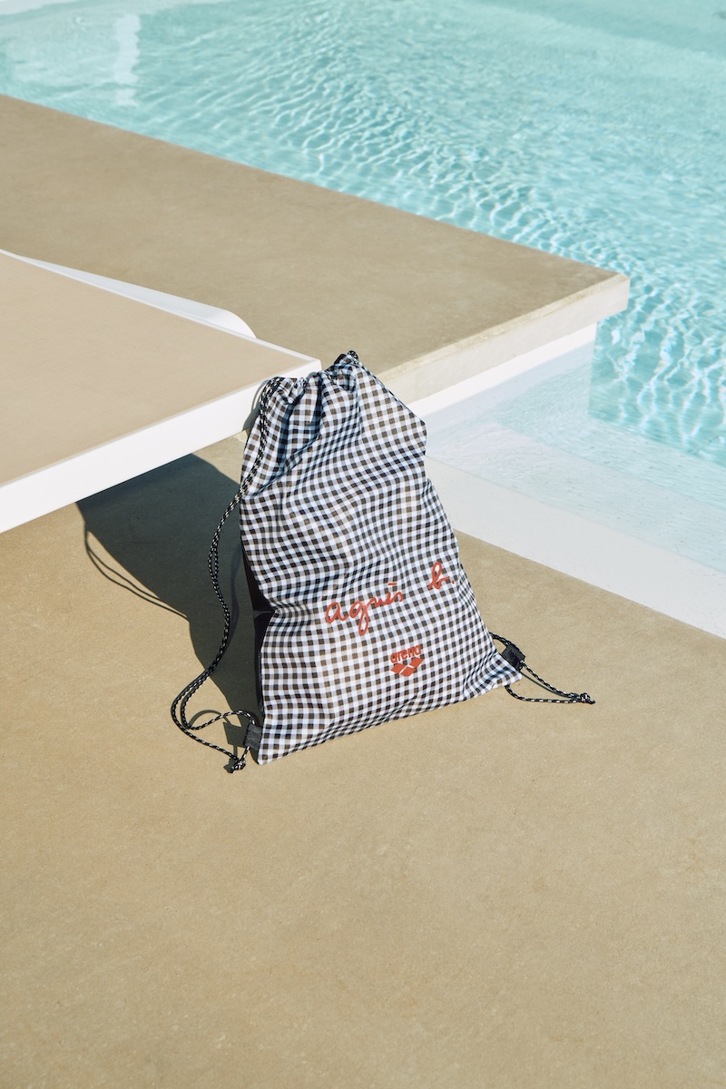 今回のコレクションでは、デザイナーのアニエス・トゥルブレ(Agnes Trouble)が好きなカラーで仕上げたギンガムチェックや、「アリーナ」と「アニエスベー」のロゴを散りばめたドット柄の水着が登場する。遊び心と上品さを兼ね備えたデザインでシンプルながらも存在感のあるアイテムをそろえる。