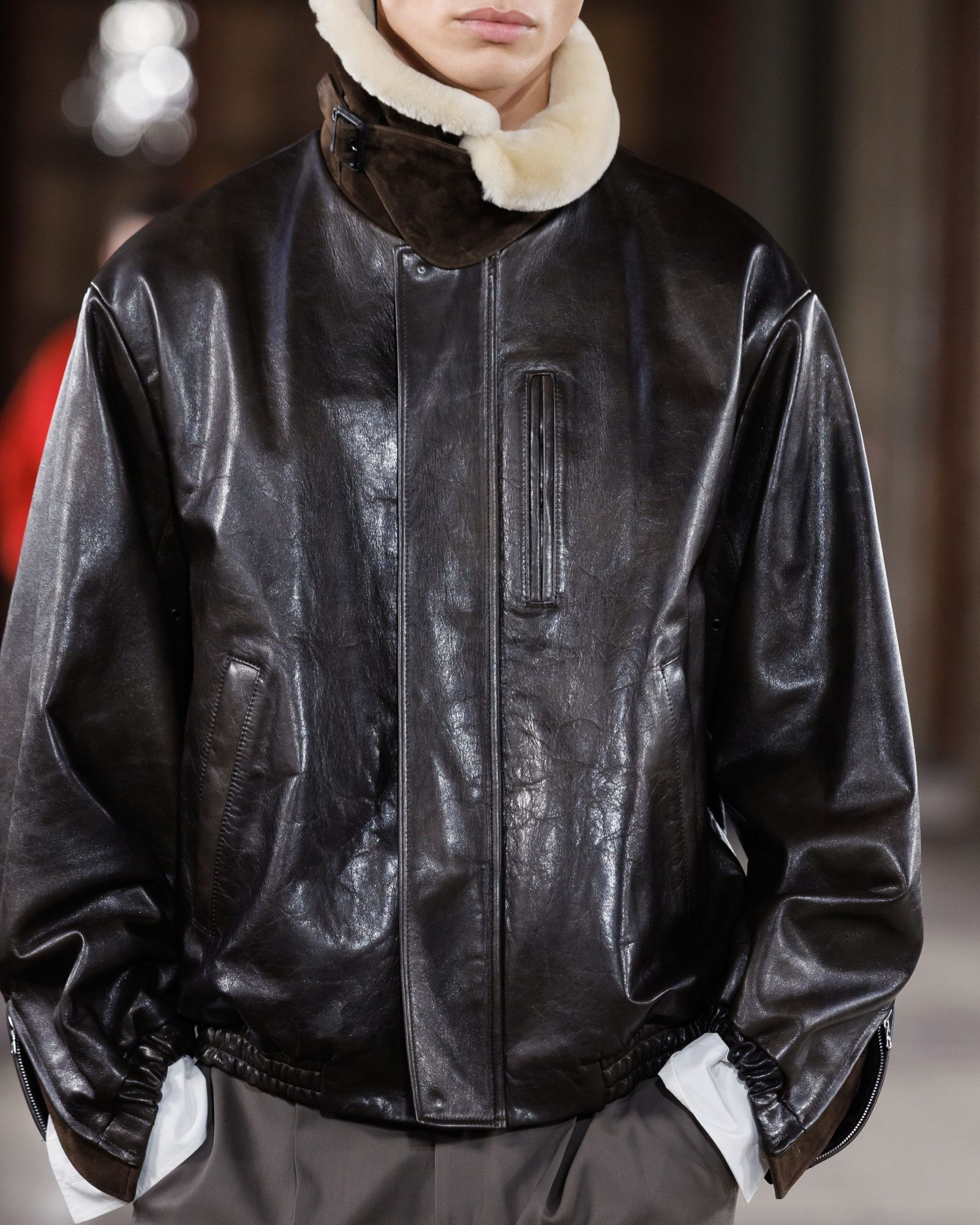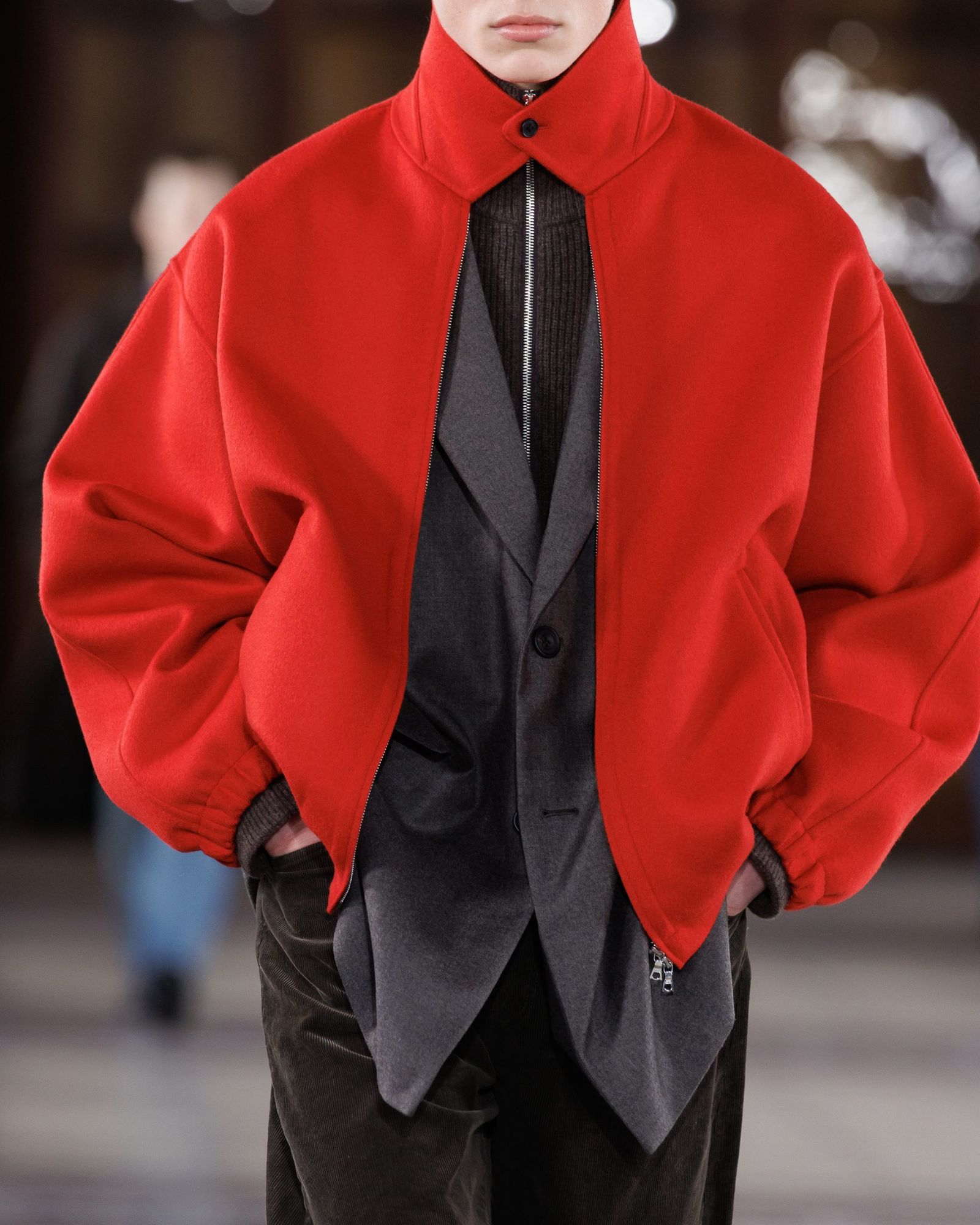 柔らかなフラノで仕立てられたラグランスリーブのコートは、ドレーピーなシルエットを首元で「締める」ため、襟の裏側にスエードやレザーを貼ることで緊張感を持たせている。ビビッドなレッドのウールダブルフェイスブルゾンには、内側から手縫いを施すことで、表からステッチを一切見せないようにした。