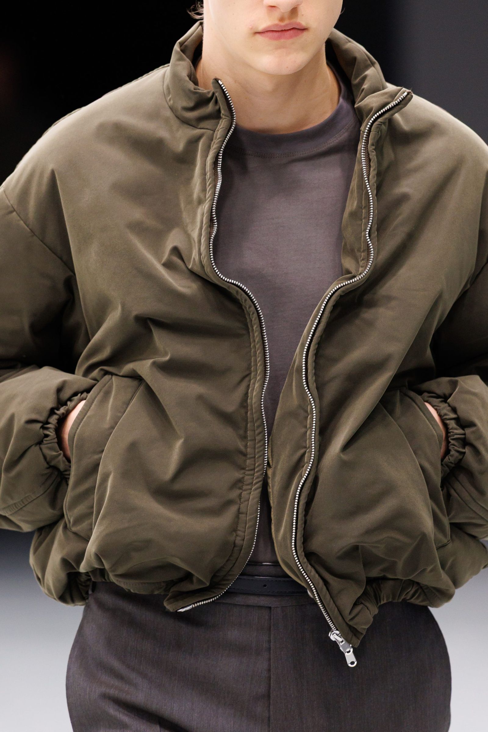 ブランドがこれまで得意としてきた、ボタンやファスナーで取り外したり、繋げたりして変形させる「機能的なギミック」は、ショーというフォーマットを通して、「アートの表現」へと進化を遂げつつある。パリでの初ランウェイとなったコレクションでは、彫刻家ジャン・アルプへのオマージュを捧げ、「自然界に直線は存在しない」という彼の思想を、意図的な「ねじれ」や「膨らみ」を持たせたパターンメイクで表現した。