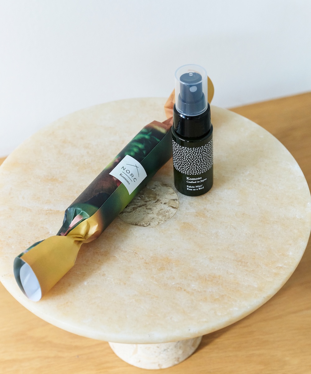 期間中、2万5000円以上購入すると、先着で天然精油の香りにこだわるホームケアブレンド「コモンズ(KOMONS)」とコラボレーションした「ノーク」別注ファブリックミストを数量限定でプレゼントする。ヒバ・ヒノキ・ホーリーフをベースにした香りをあしらい、持ち運びに便利なミニサイズで、外出先や旅先で気軽に使える。