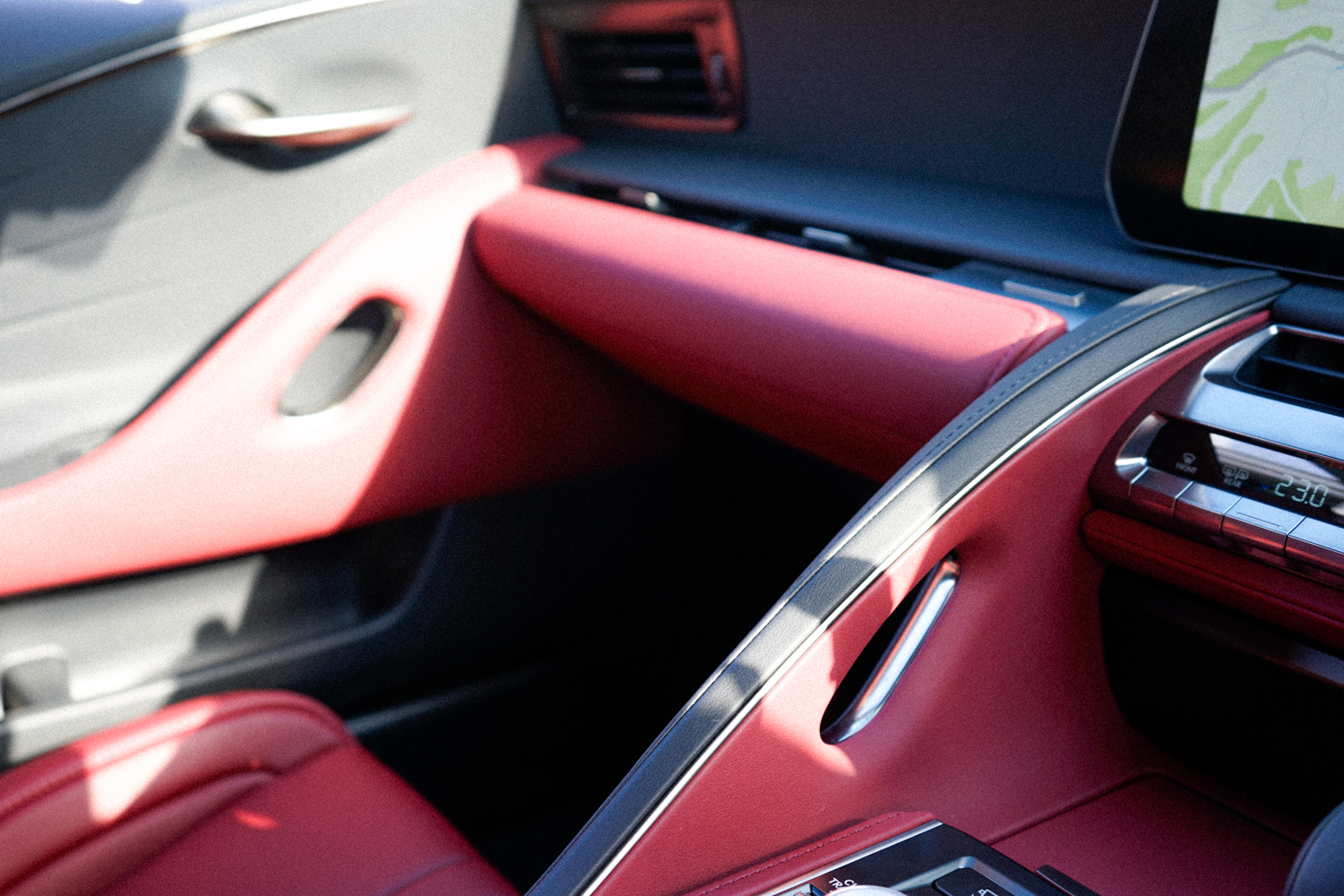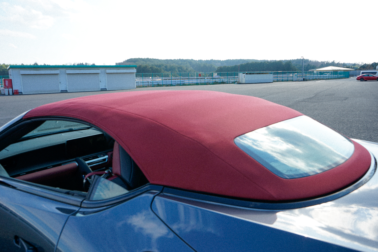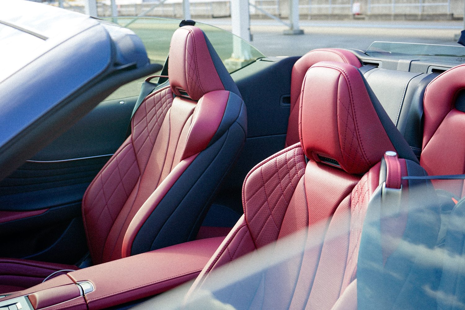 革の香りが心地よく広がるインテリアは、「豪華絢爛」よりも「優雅端麗」という言葉がよく似合う。見渡す限りを本革で覆い、上品な艶消しの金属パーツをアクセントに散りばめた落ち着きある空間に、枯山水を思わせるドアトリムのスリット造形や、端正なステッチワークなどの細部が主張しすぎることなく調和して、丁寧な仕立てが日本車らしいエレガンスを感じる。運転席を包み込むように仕切りを設けた左右非対称のレイアウトが、ドライバーの高揚感を引き立てる設計だ。ベルトガイドの加飾やヘッドレスト後ろに落とし込んだエンボスのロゴなどは、内装が露出するコンバーチブルのために仕込んだディテールで、オープン時にも品格を崩さない工夫がされている。