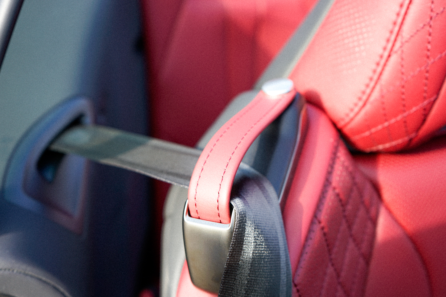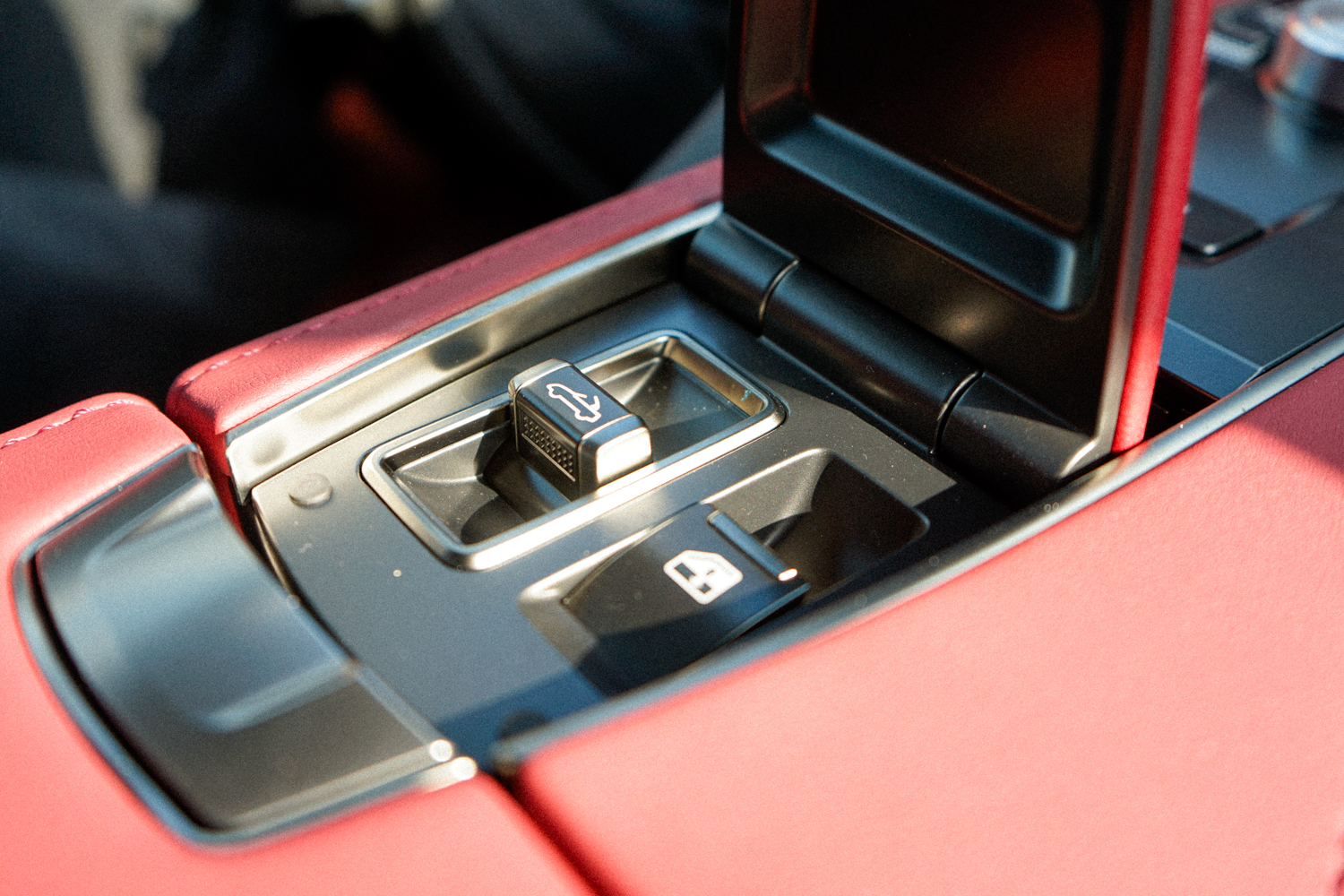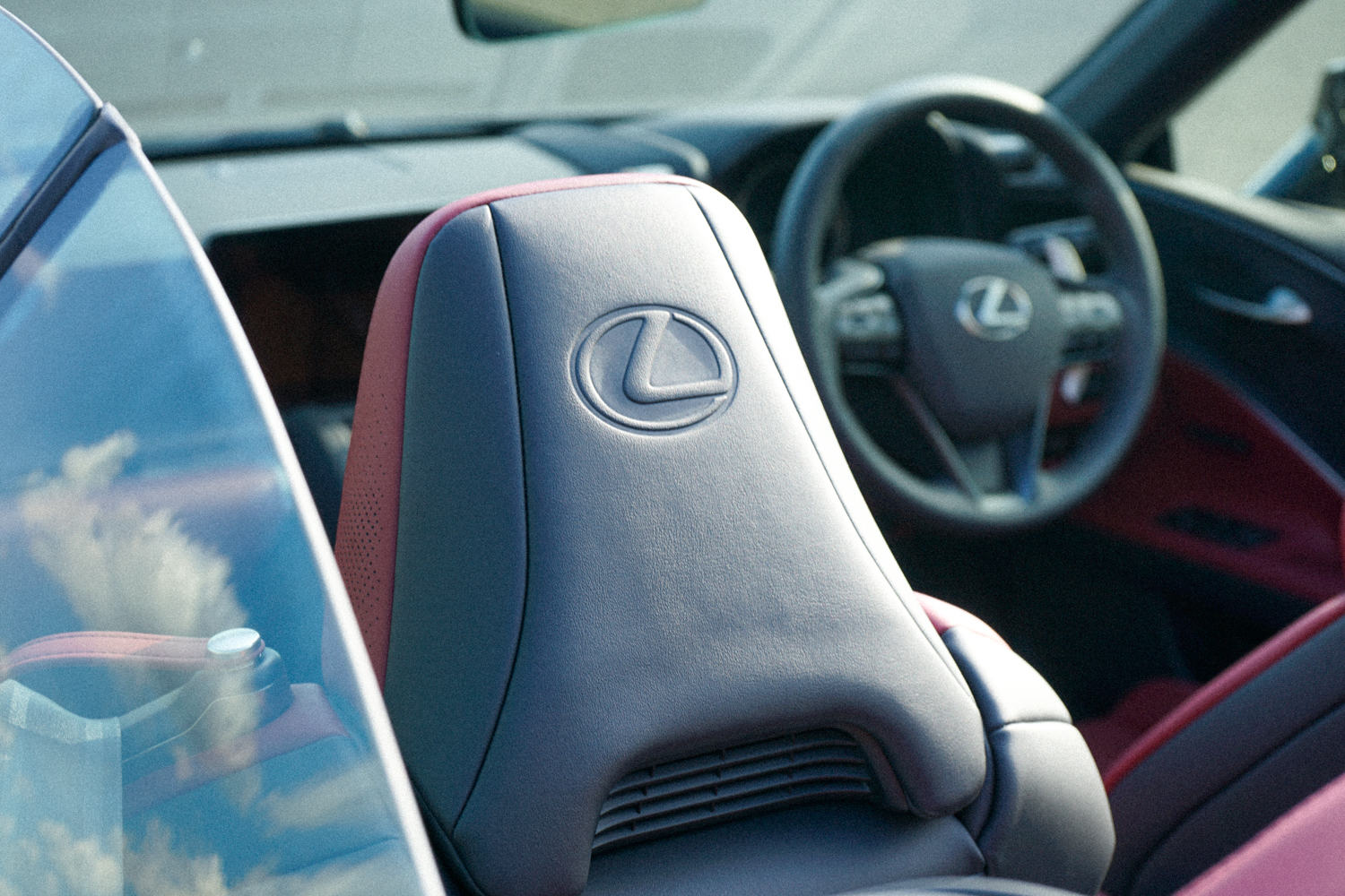 革の香りが心地よく広がるインテリアは、「豪華絢爛」よりも「優雅端麗」という言葉がよく似合う。見渡す限りを本革で覆い、上品な艶消しの金属パーツをアクセントに散りばめた落ち着きある空間に、枯山水を思わせるドアトリムのスリット造形や、端正なステッチワークなどの細部が主張しすぎることなく調和して、丁寧な仕立てが日本車らしいエレガンスを感じる。運転席を包み込むように仕切りを設けた左右非対称のレイアウトが、ドライバーの高揚感を引き立てる設計だ。ベルトガイドの加飾やヘッドレスト後ろに落とし込んだエンボスのロゴなどは、内装が露出するコンバーチブルのために仕込んだディテールで、オープン時にも品格を崩さない工夫がされている。