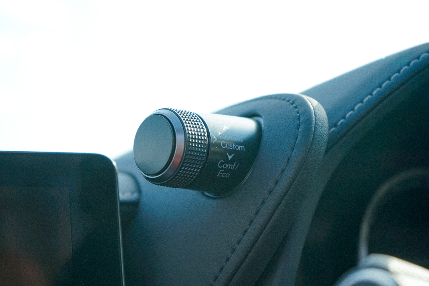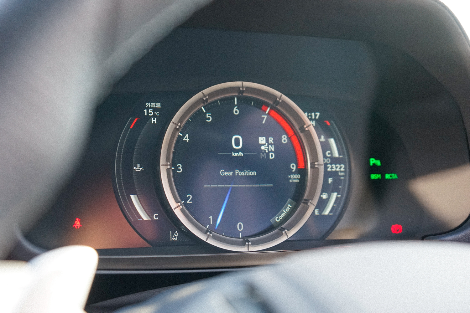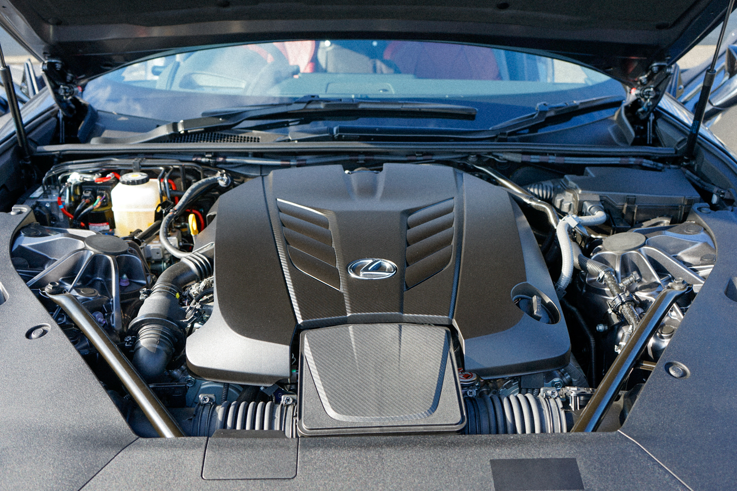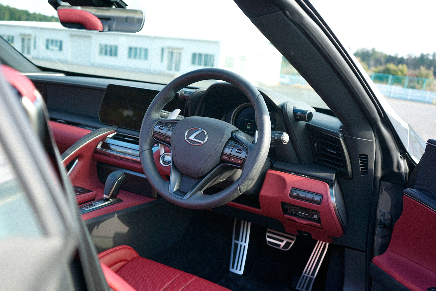 ドライバーズシートに乗り込むと、そのポジションは潜り込むように低い。しかし電動シートの調整幅も大きいので、そのままコックピット感を味わうようにスポーティーに座り込んだり、見晴らしを優先して座面を高めに設定したりするのも自由が効く。エンジンスタートボタンを押せば、5.0L の大排気量V8エンジンが回転数を上げながら、ゴロゴロと乾いた音を響かせる。走り出しから高速域まで終始スムーズな加速で、突き上げも少ないが「レクサス」にしては全体的にやや硬めの設定。ステアフィールも舵角に対して素直で、タイトなカーブでも低重心のワイドボディーが踏ん張り、高速域でも不安は一切ない。体を包み込むようにサイドが巻き上がったシートが体をガッチリと支え、ノーズがスイスイと入っていく感覚は快感だ。