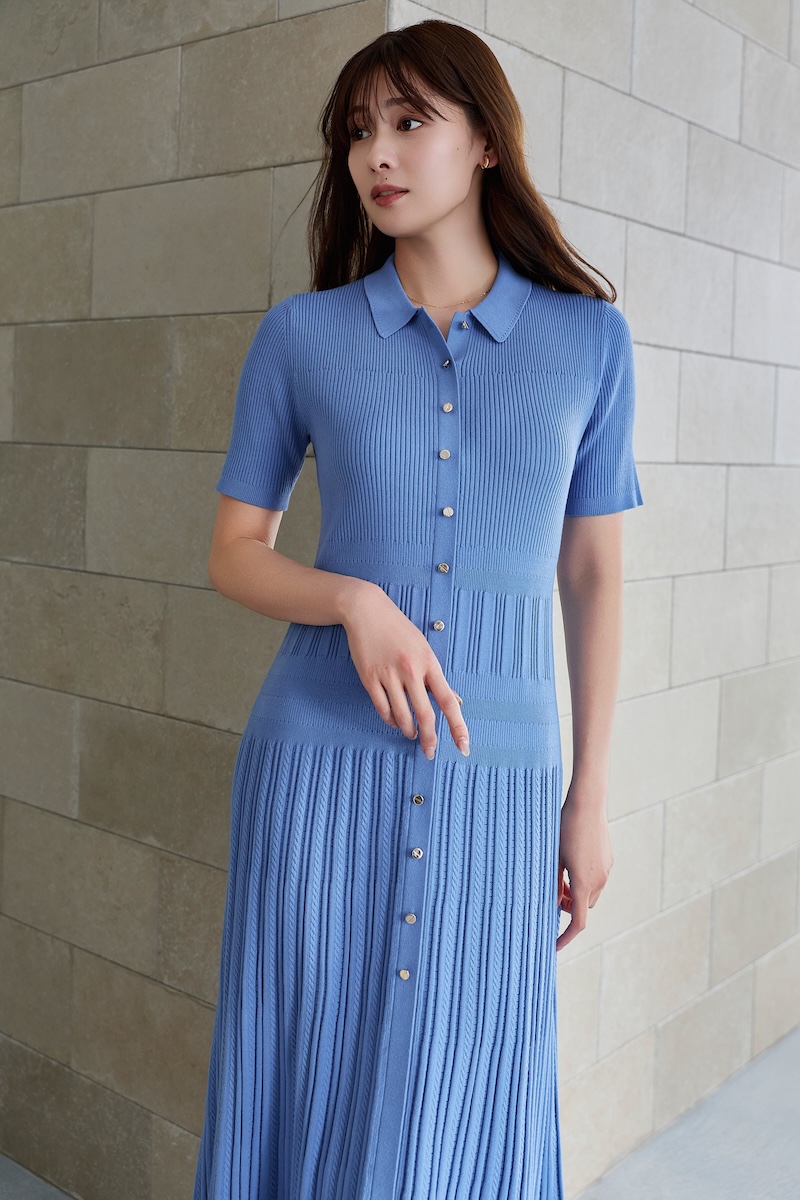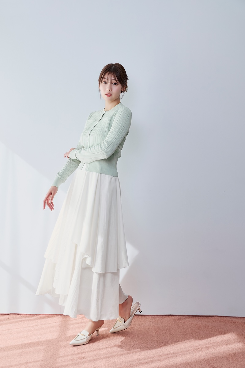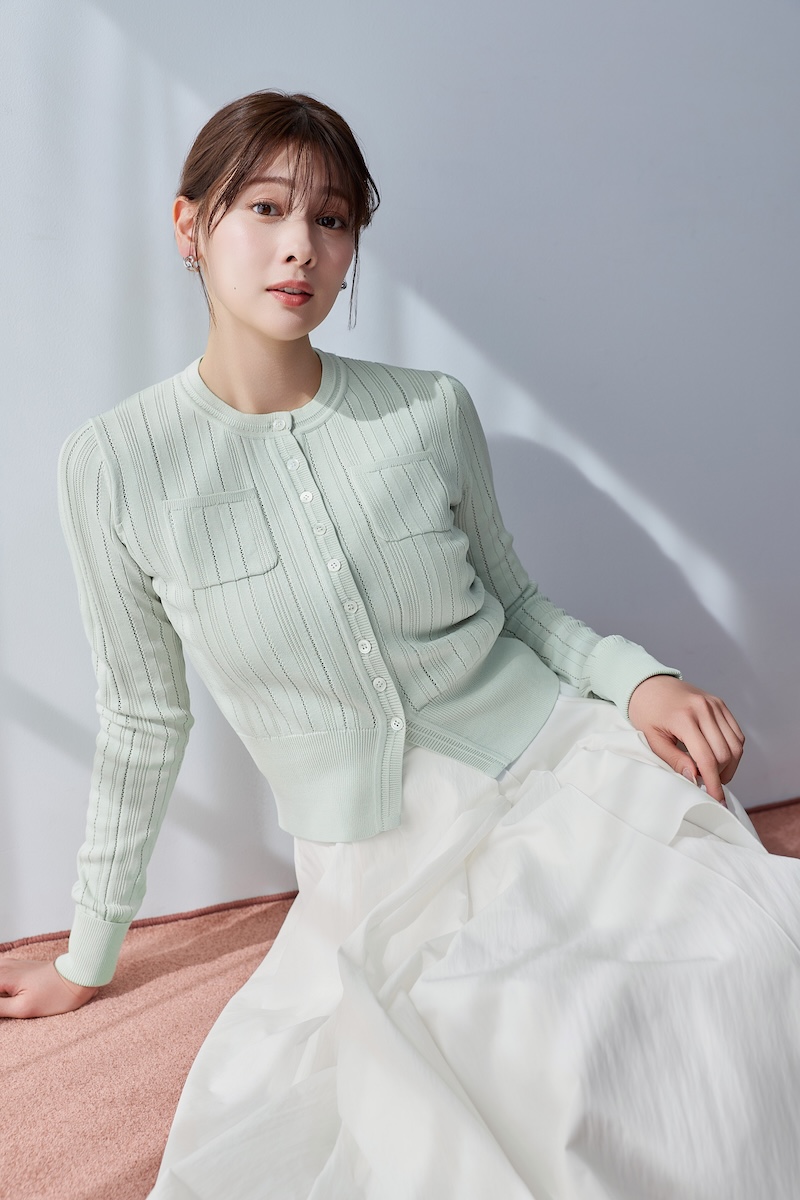 ロング タイ スリット ブラウス(1万4000円)、タックド ツイル バミューダ ショーツ(1万6500円)、アイレット ポロ ニット ドレス(2万1000円)、アイレット ニット カーディガン(1万3000円)、アシンメトリック ティアード スカート(1万8000円)、ギャザード スリーブ ドレス(2万3000円)、スプリング ツイード ドレス セット(2万6000円)など、シーンレスなアイテムを多数ラインアップする。色、サイズ展開はアイテムによって異なる。