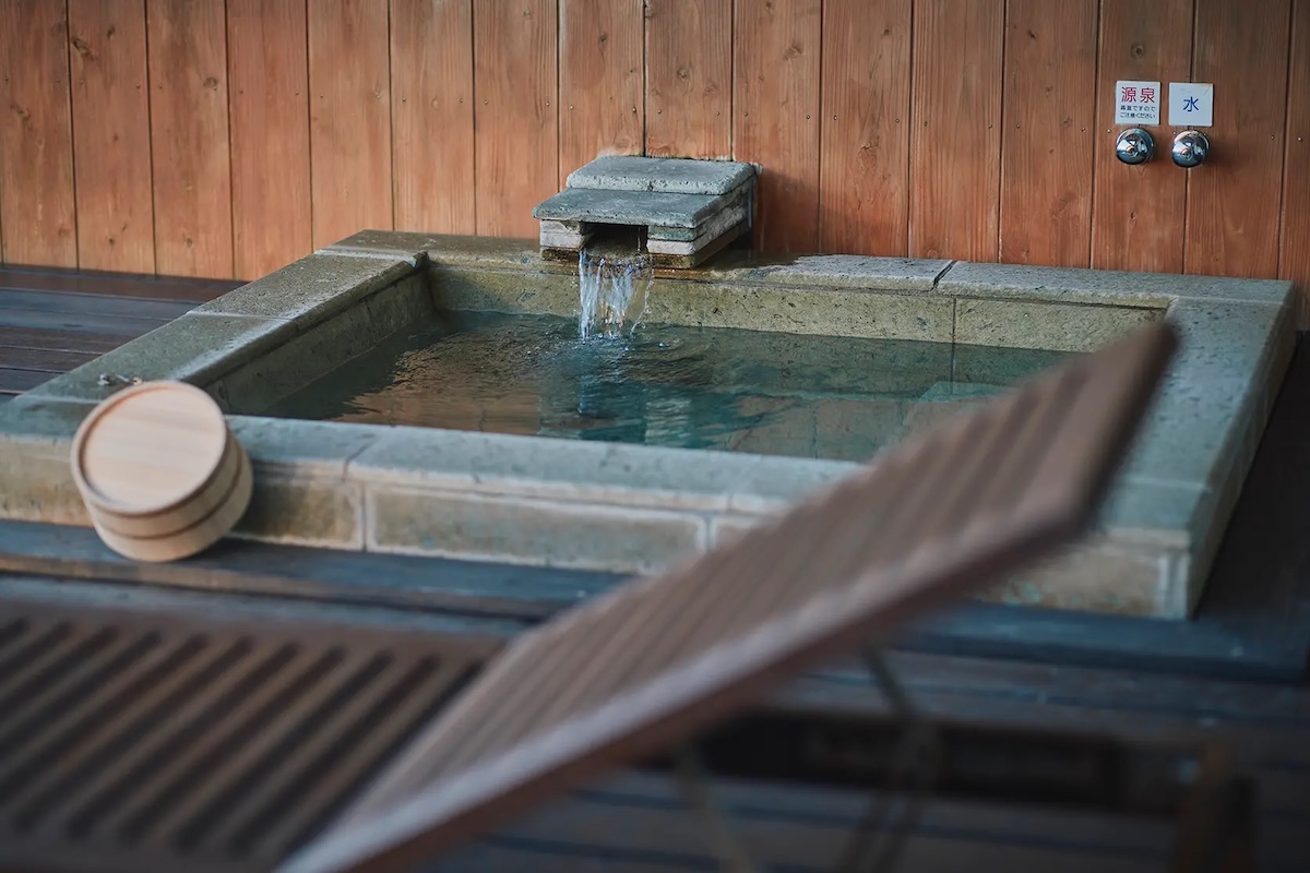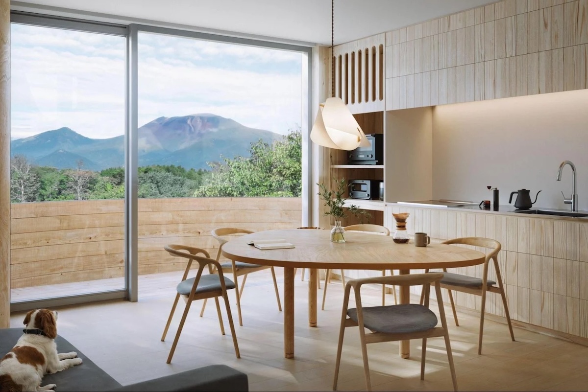建築的にはスクエアな長方形のほうが施工しやすいところを、あえて扇状の形状を選択。北側の浅間山にむかって開いていくような開放感を演出した。朝のきらめきや雲の流れ、柔らかな夕暮れなど、時の移り変わりを大開口や出窓から体感できる。全7室のうち3室は愛犬とともに滞在できるドッグフレンドリーな客室。最大6人まで宿泊でき、中にはサウナや水風呂があり、バルコニーで整うようなこともできる。木のぬくもりを感じる空間で、外装にも長野県産の杉材を使用。風雨や光を受けて色味が深まり、味が出る経年変化を楽しめそうだ。