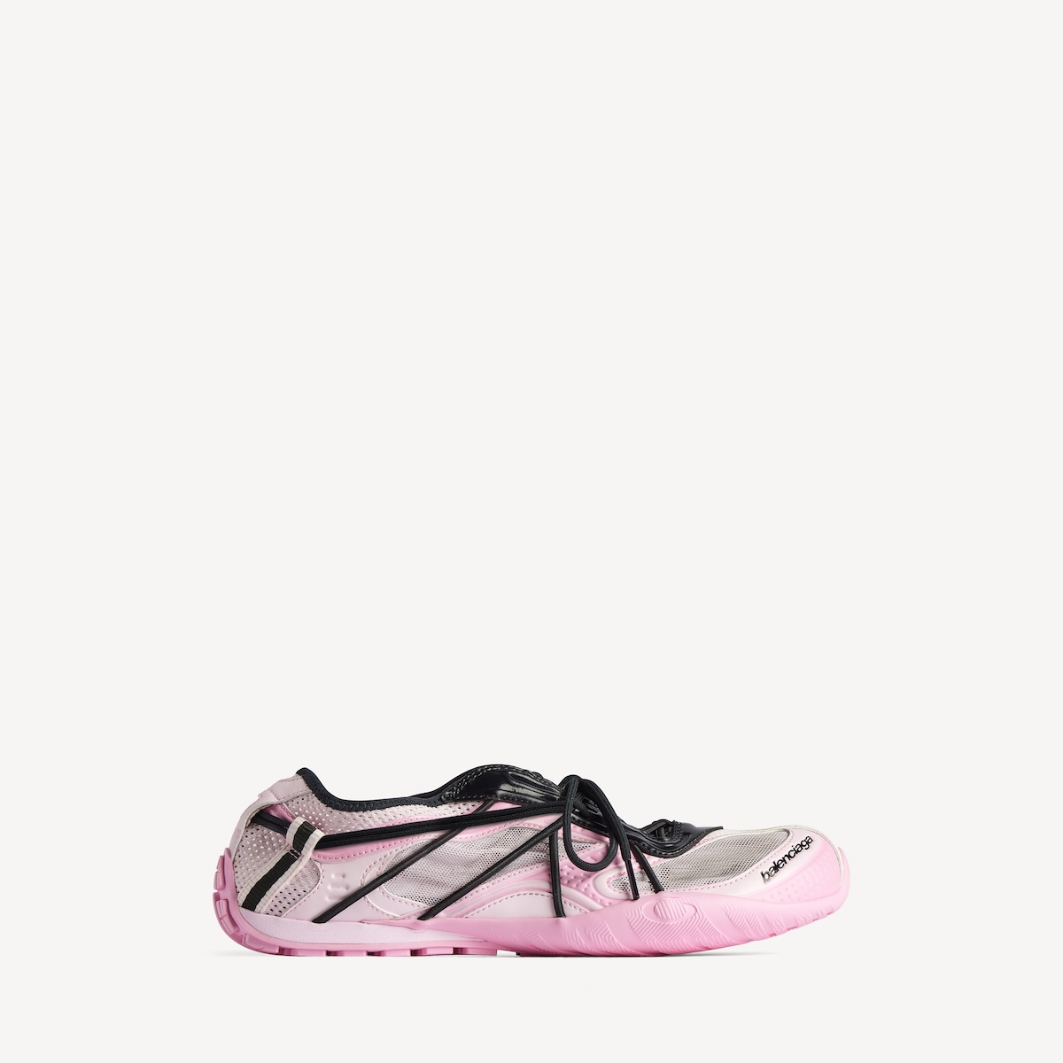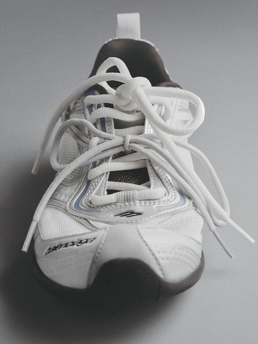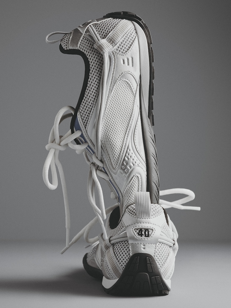 本商品名の"レーダー(Radar)"は、潜在的トラッキングテクノロジーに由来し、伝統への敬意と加速する現代性を名前に込めた。電波探知の俊敏性に着想した超軽量で流線型のデザインは、人間の直感や探知能力を象徴的に表現する。二重シューレース構造やグリップが足との一体感を生み、パーツにはアイコニックな露出したサイズ表記がデボス加工で施されている。バレリーナバ―ジョンではスニーカーの要素を再解釈し、スリムでローカットなシルエットに仕上げた。