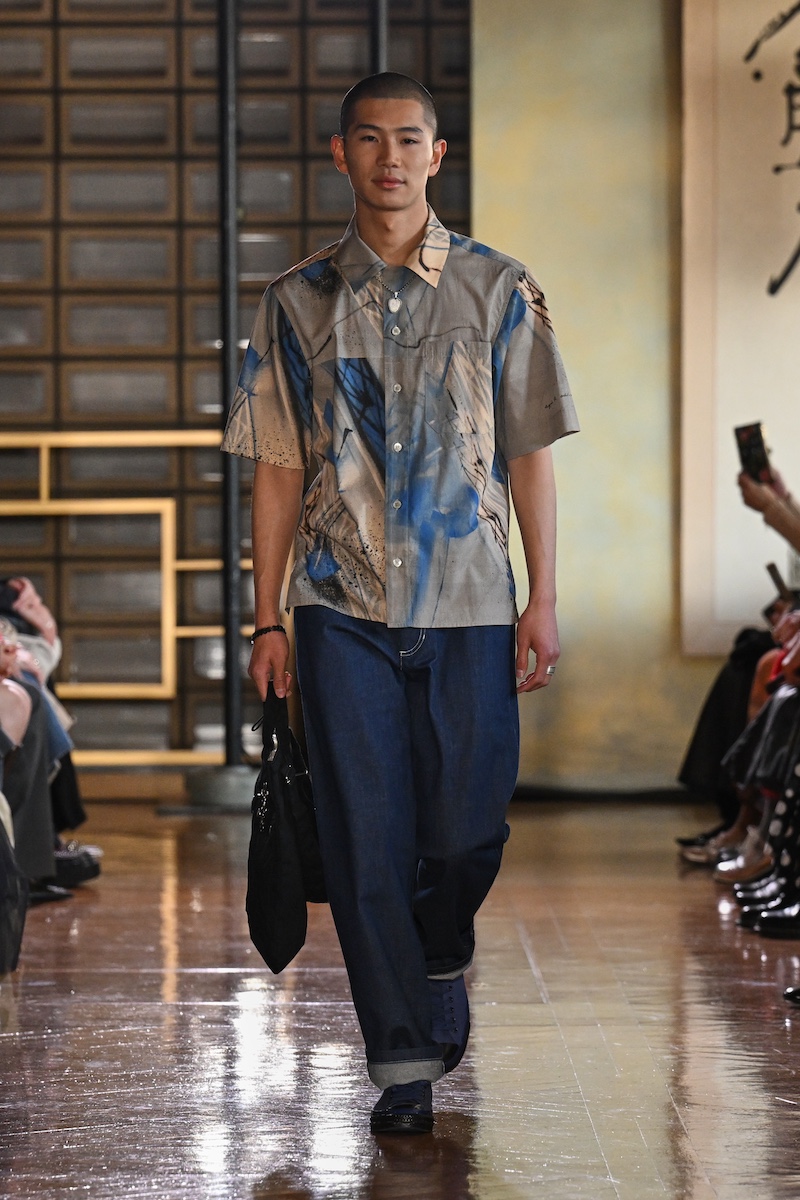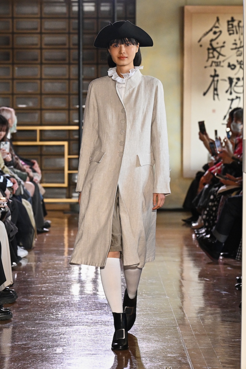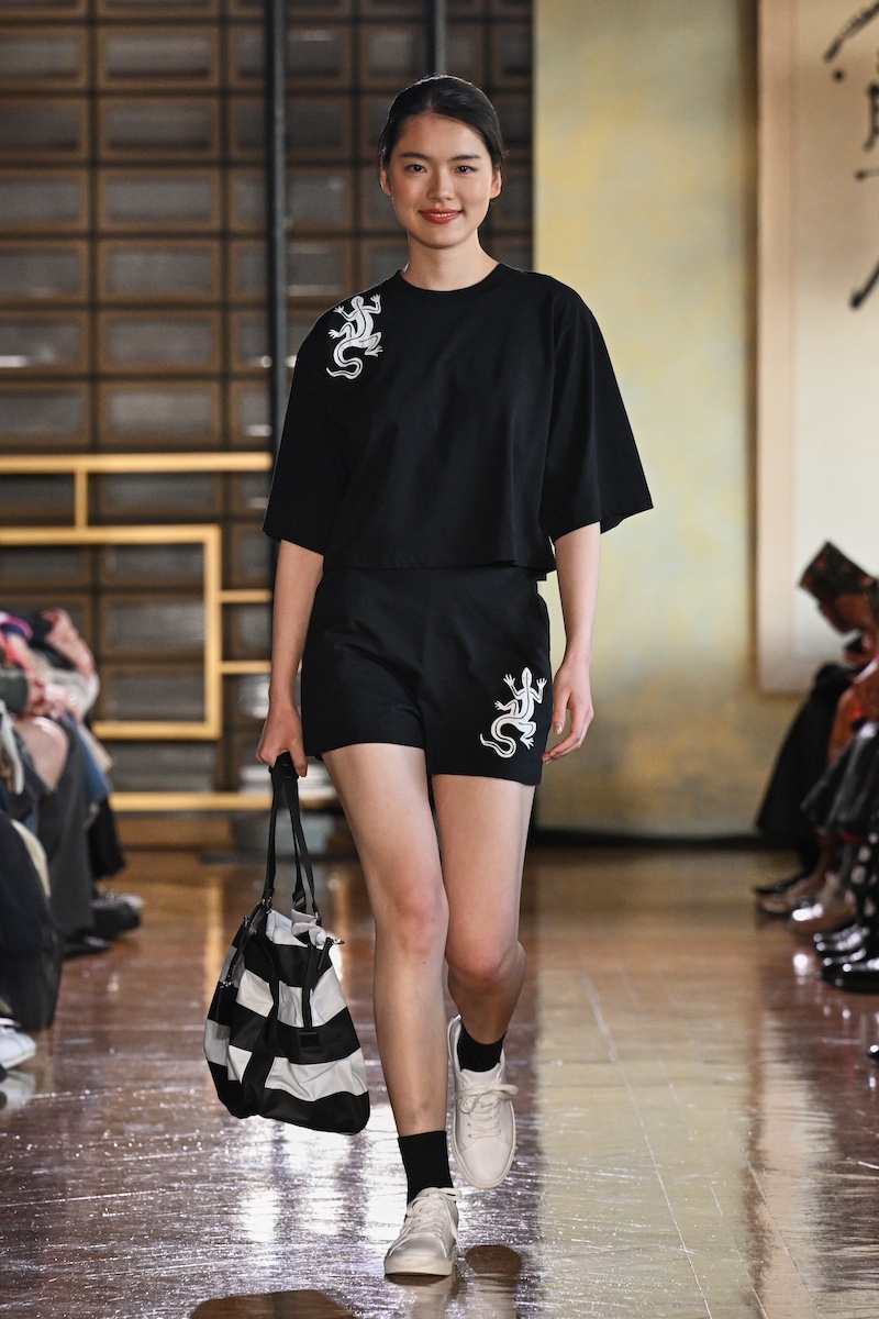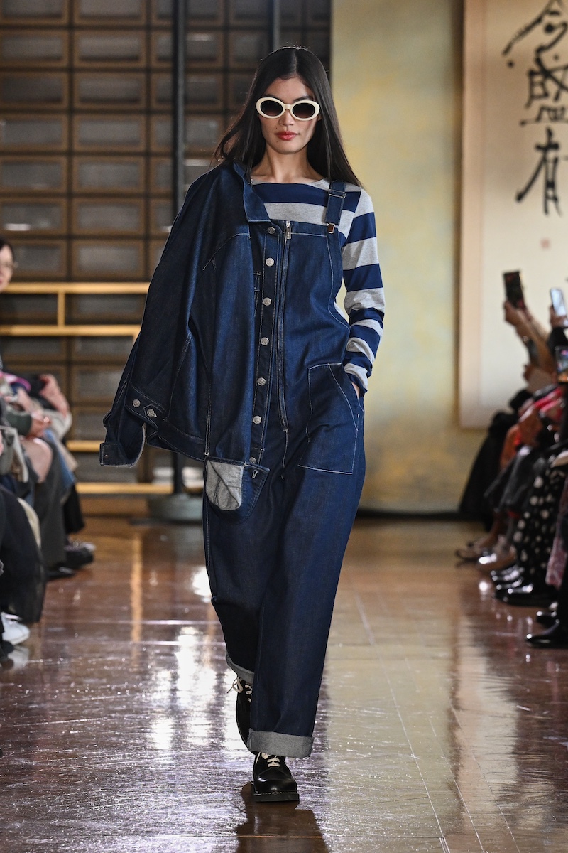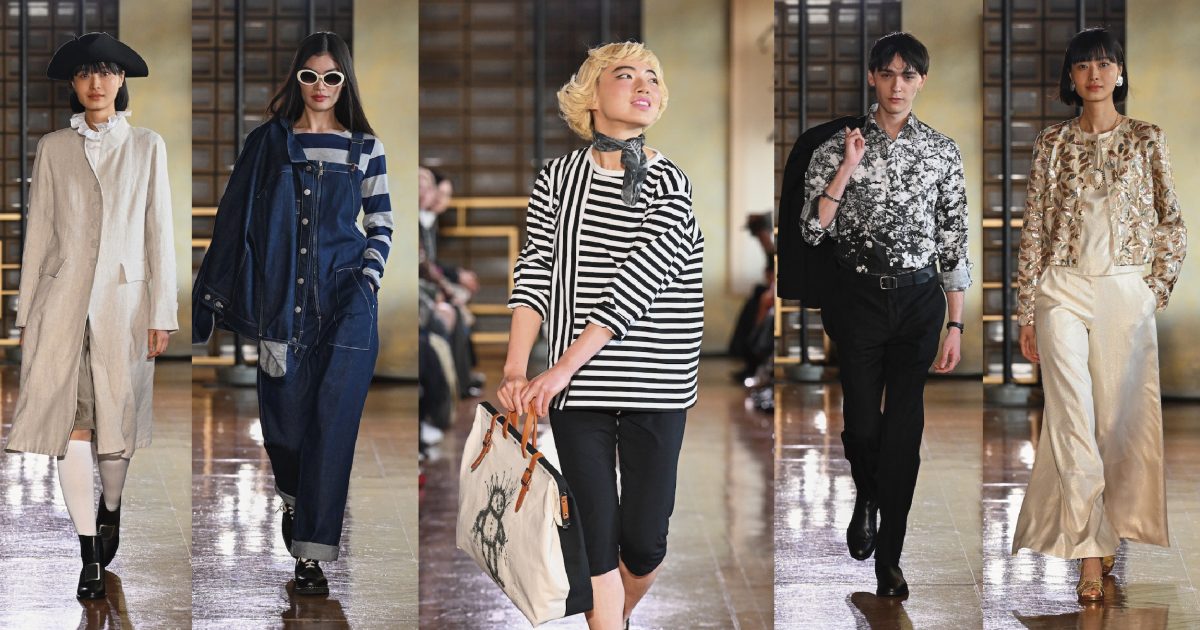 ファーストルックを飾ったのは、首元からフリルカラーをのぞかせたリネンのフロックコート。それに続き、レザール(トカゲ)ロゴを配したカジュアルなセットアップや、グラフィティアーティストのフューチュラの作品を施したシャツ、ボーダーTシャツに合わせたデニムのジャンプスーツなどの「アニエスベー」らしいシグネチャーアイテムを織り交ぜたスタイリングが後を追う。これらは26年春夏シーズンにパリで6年ぶりに披露したランウエイ・コレクションのルックたちだ。