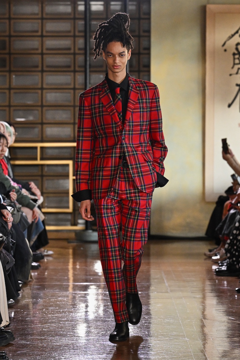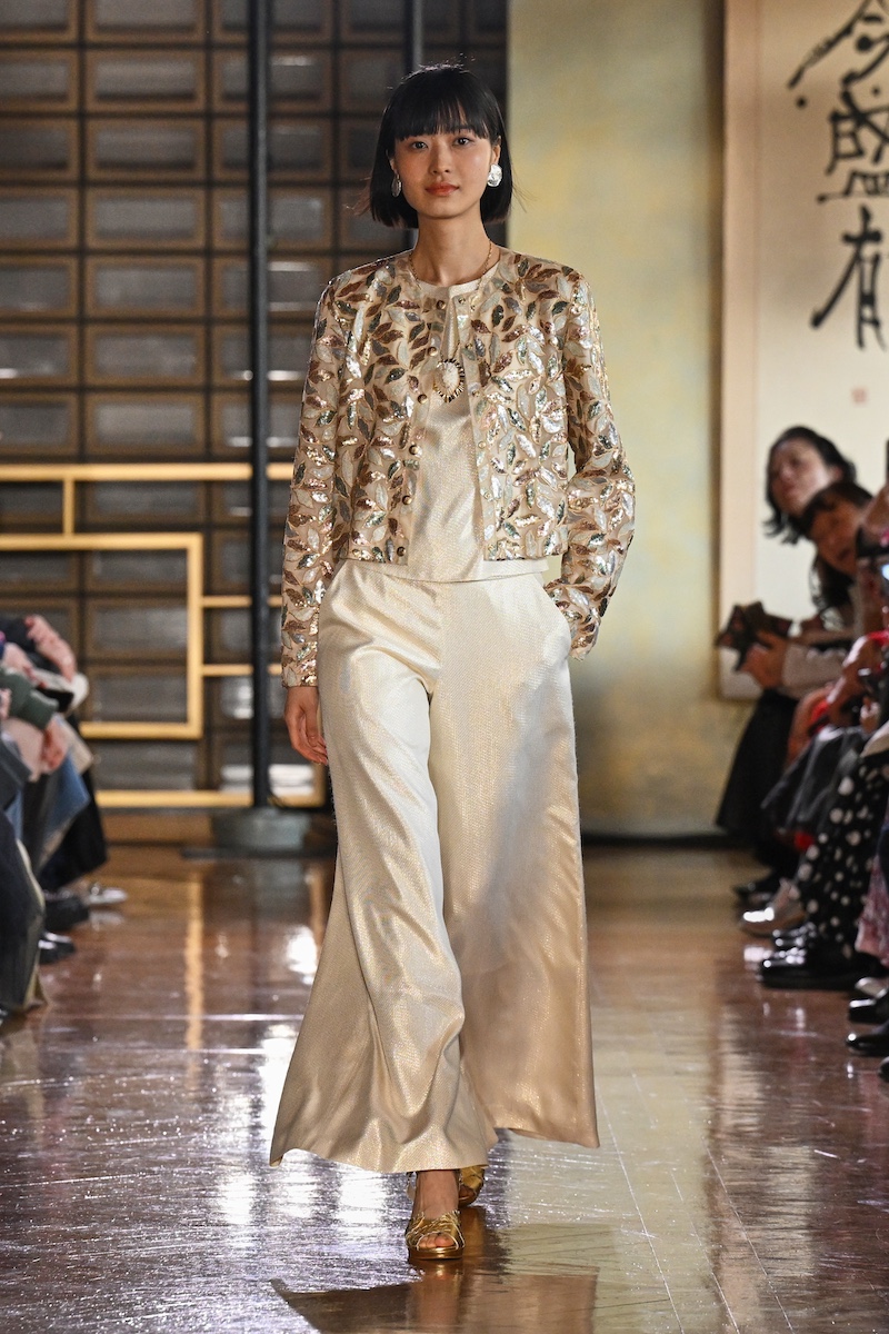 先日披露したばかりの26-27年秋冬パリ・コレクションのルックも多数登場。パリジャンらしいシックなブラック&ホワイトのイブニングスタイルをちりばめながら、くすんだグリーンのジャンプスーツのペアルックや、鮮烈なレッドのフード付きジャケット、タータンチェックのセットアップ、きらびやかなリーフ柄を落とし込んだ“カーディガンプレッション”など、色柄豊かな装いも印象深い。