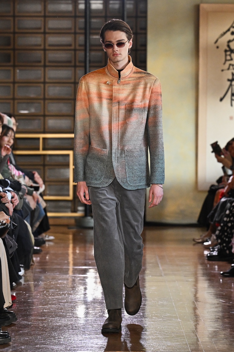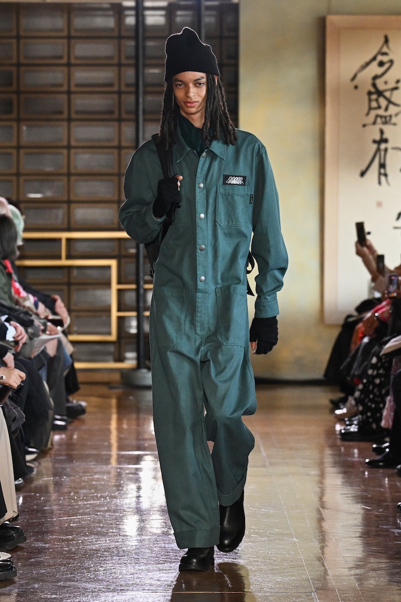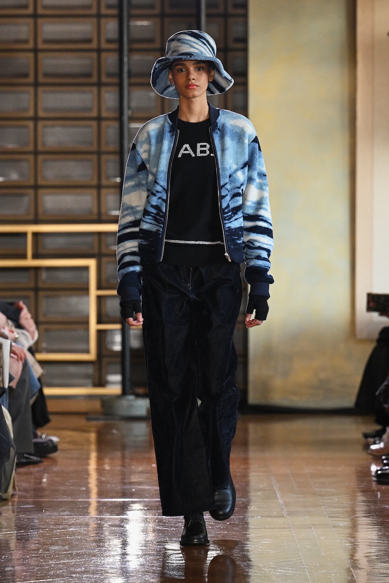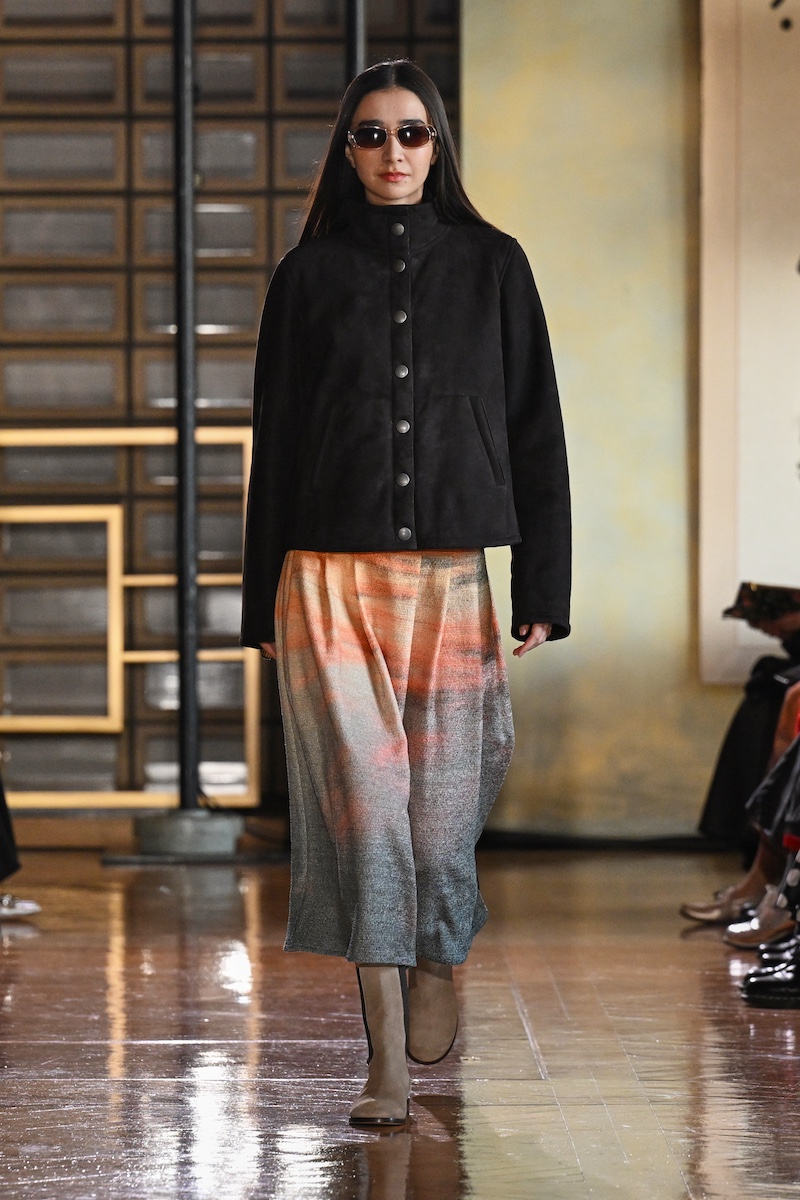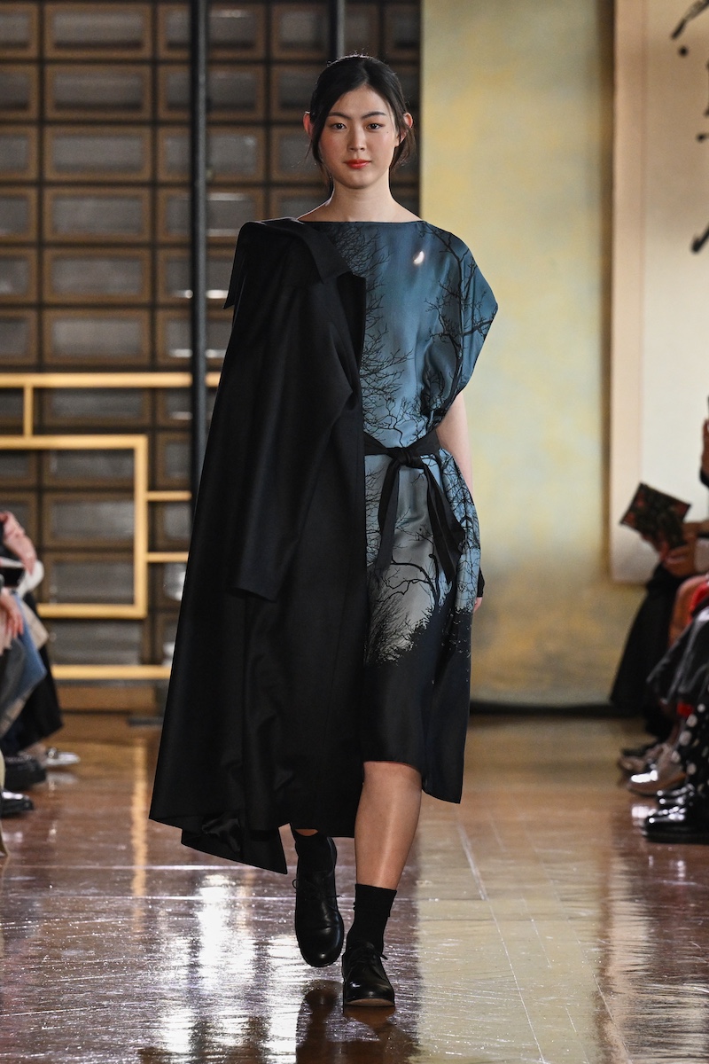 太陽の光できらめく水面を落とし込んだかのようなハットとボアジャケットや、サンセットを思わせる色合いのジャケットとスカート、それに対比するように夜明け空の冬枯れた木々を捉えたフォトプリントワンピースなどの装いには、いつ何時も変わらない自然への敬愛がにじむ。「by R」参加を記念した、桜を収めたノワール調のフォトプリントアイテムも織り交ぜ、本コレクションならではのルックで日本らしい情景も加えた。