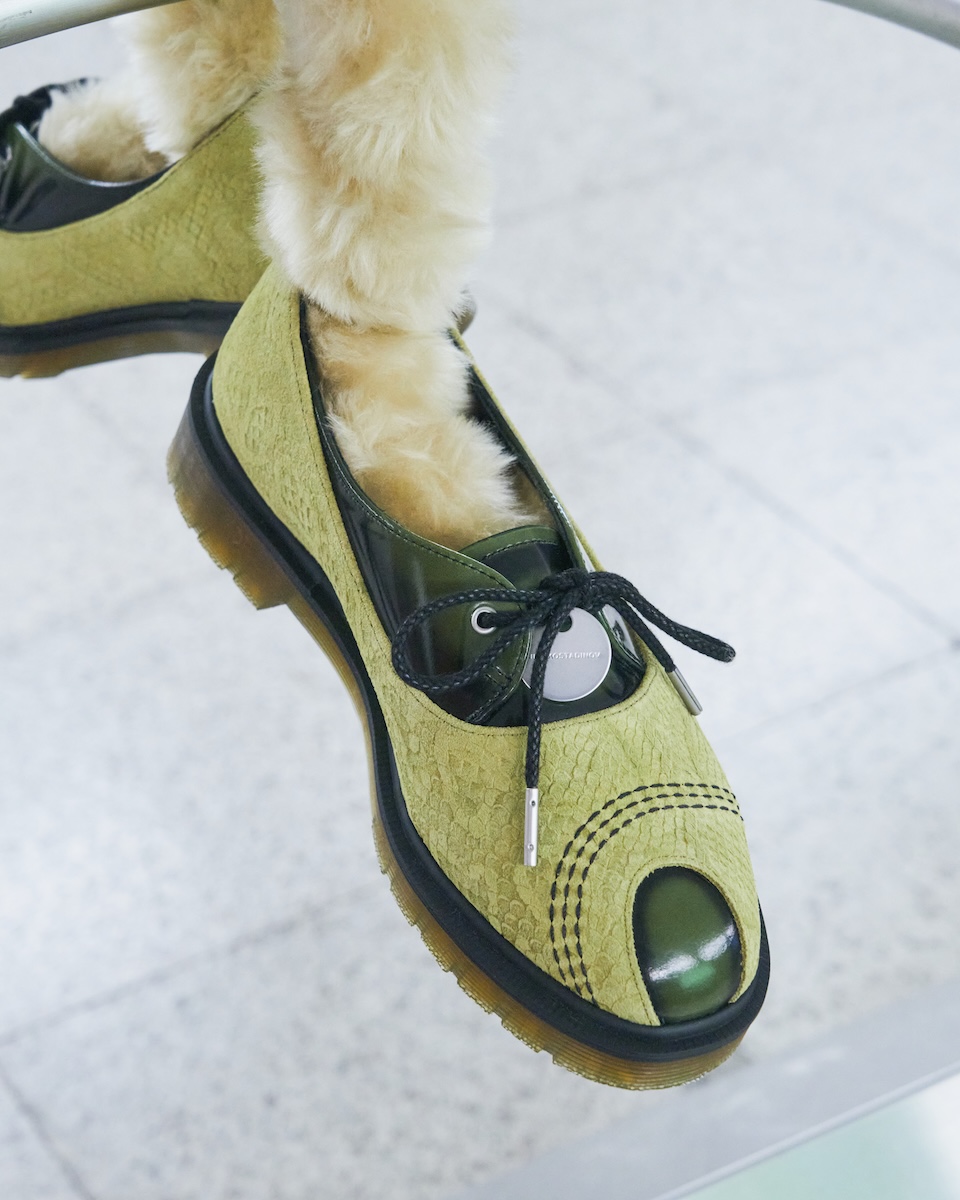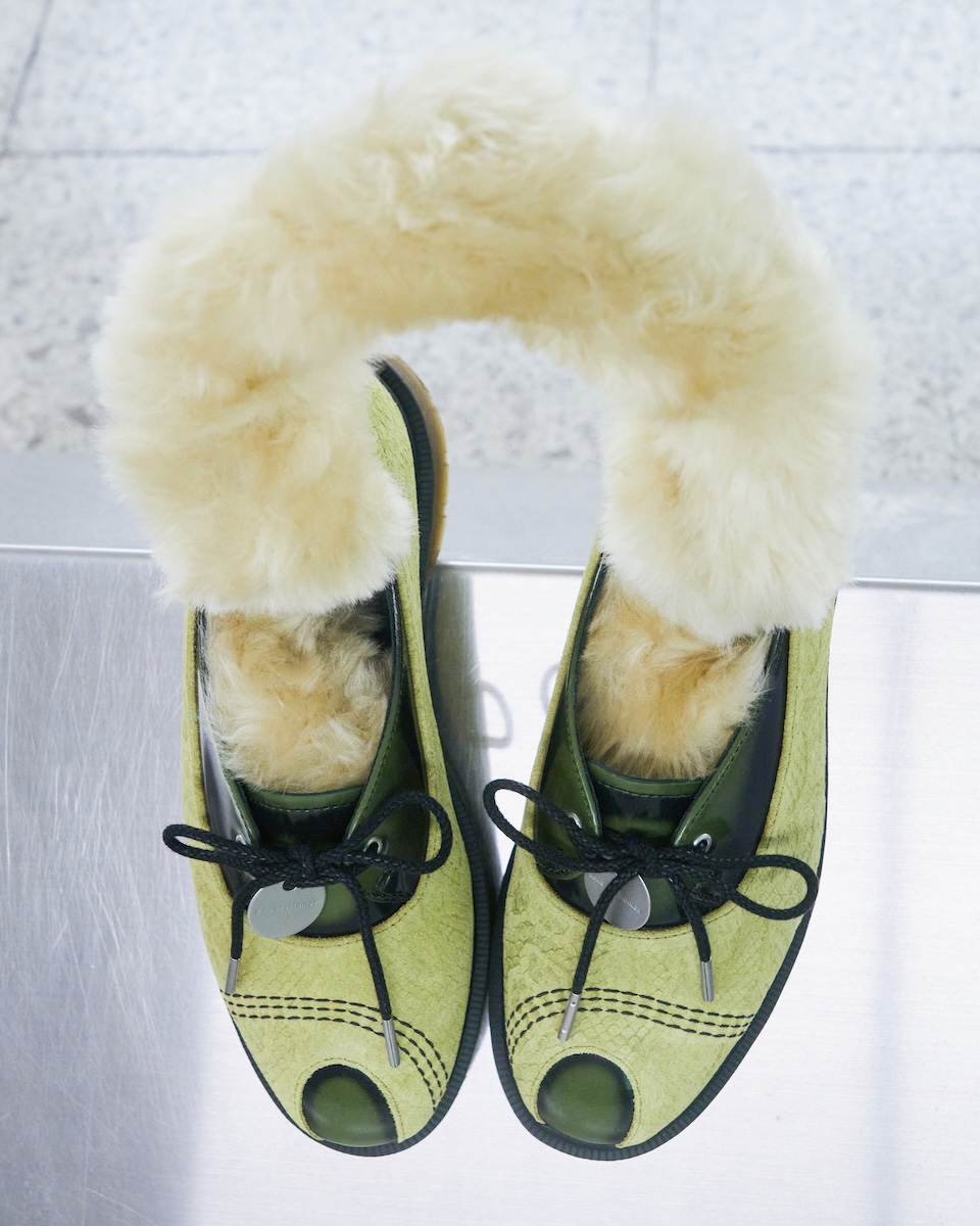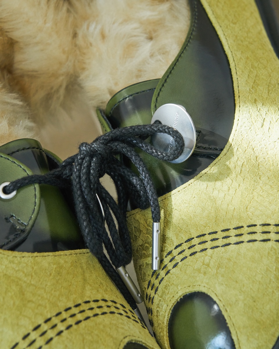 “トー ボックス シューズ”は、シングルアイレットのレースアップ仕様で、アッパーにはエンボス加工を施したシャトルリューズカラーのスエードと、2トーンのグリーンレザーを採用した。クラシックなオックスフォードシューズにメリージェーンのプロファイルを組み合わせたハイブリッドシルエットで、カットアウト構造、トリプルのコントラストステッチ、「キコ コスタディノフ」ウィメンズのドッグタグが特徴だ。