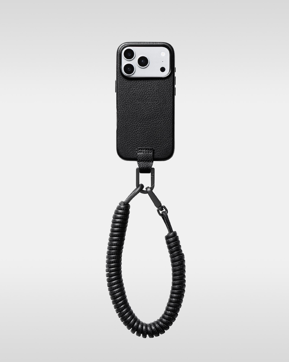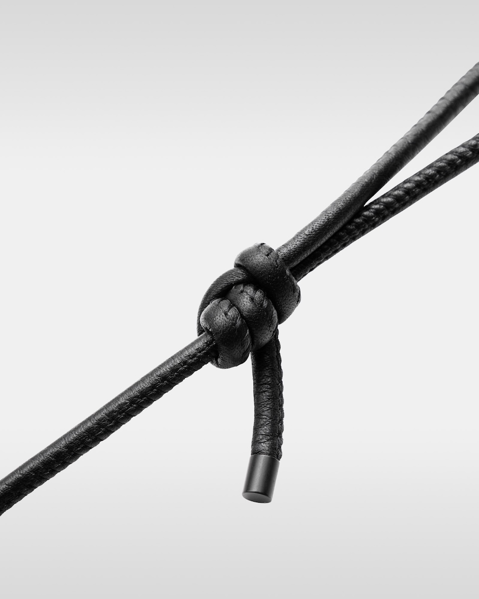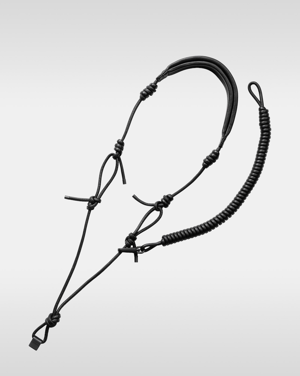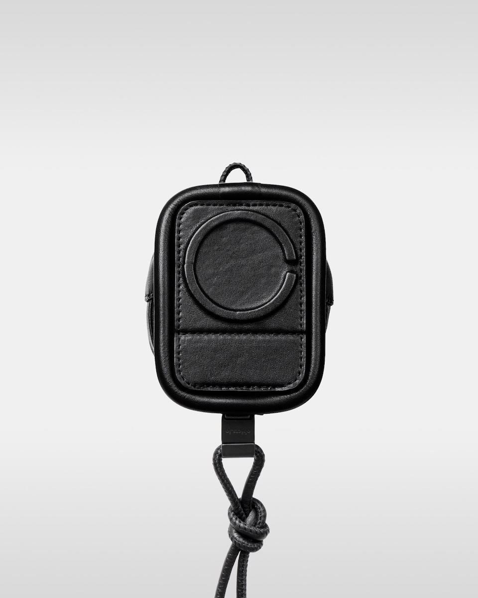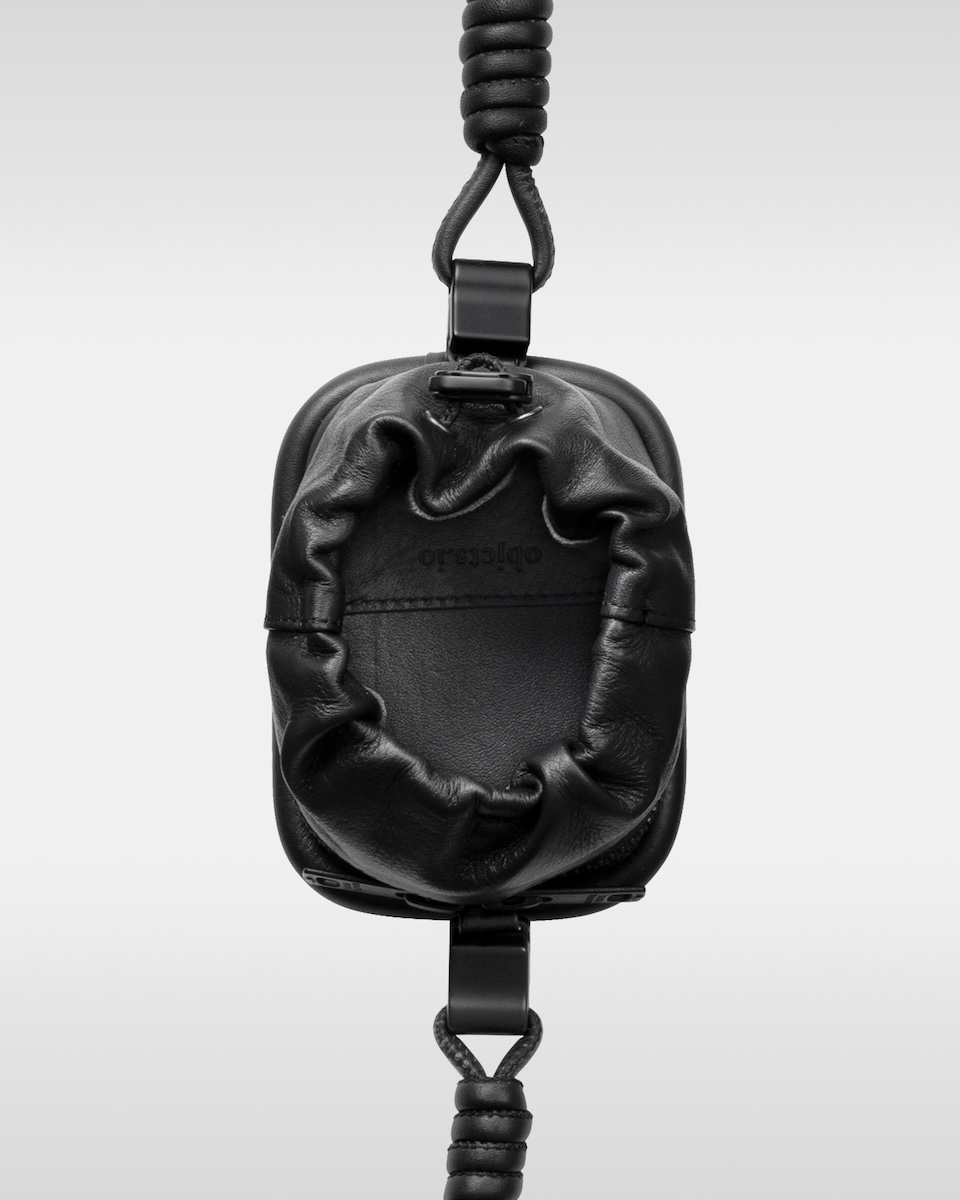 “オーバー エンジニアリング マグウエア レザーパース”(単体、3万9600円/アイフォンケースセット、4万9500円)は、マグネットの付け根部分に結び目を配することで、長さ調節が可能だ。コイル巻きのレザーストラップは、カラビナに通すことでハンドストラップとしても使用でき、ジップとドローコードで開閉するパースには、小物を収納できる。