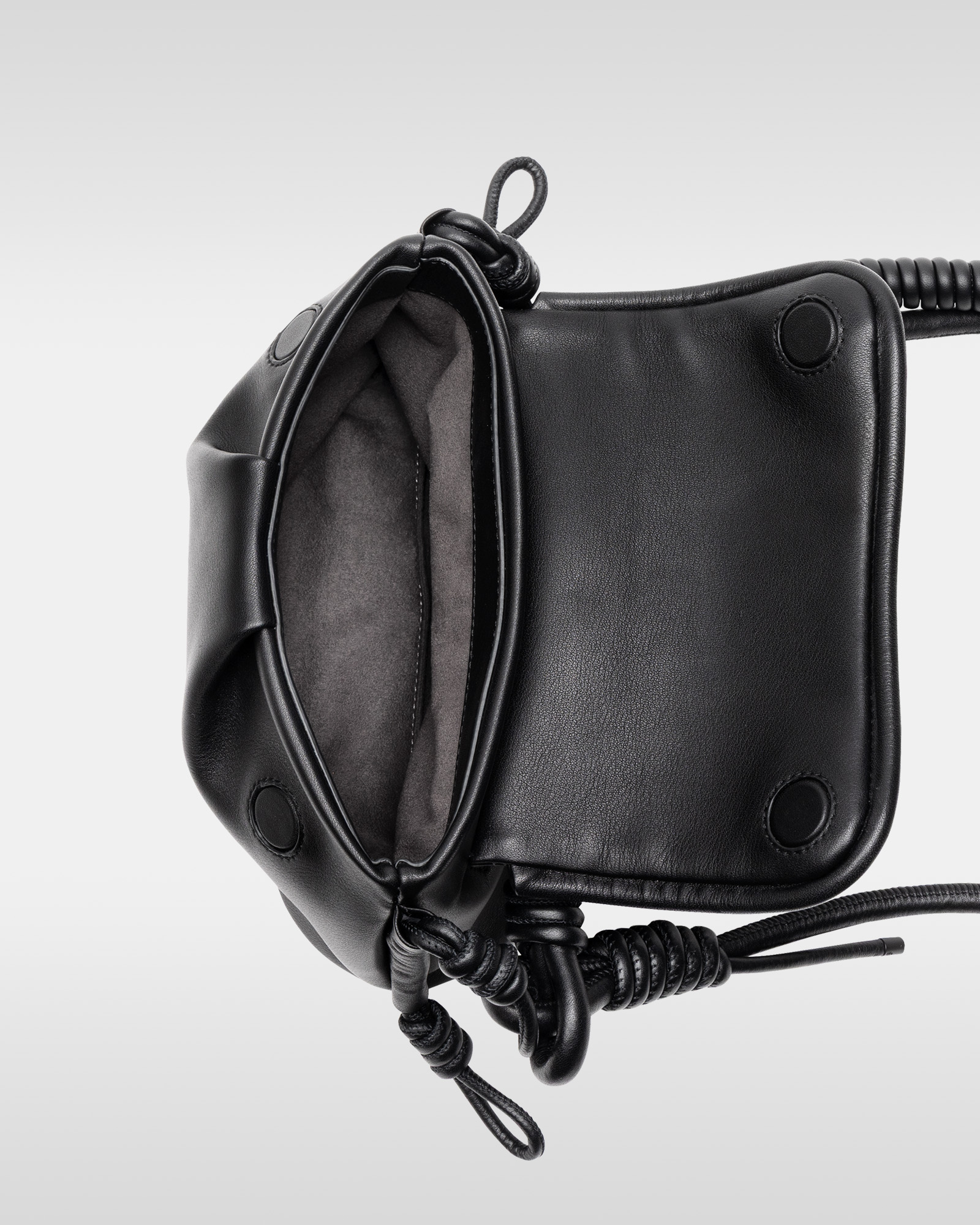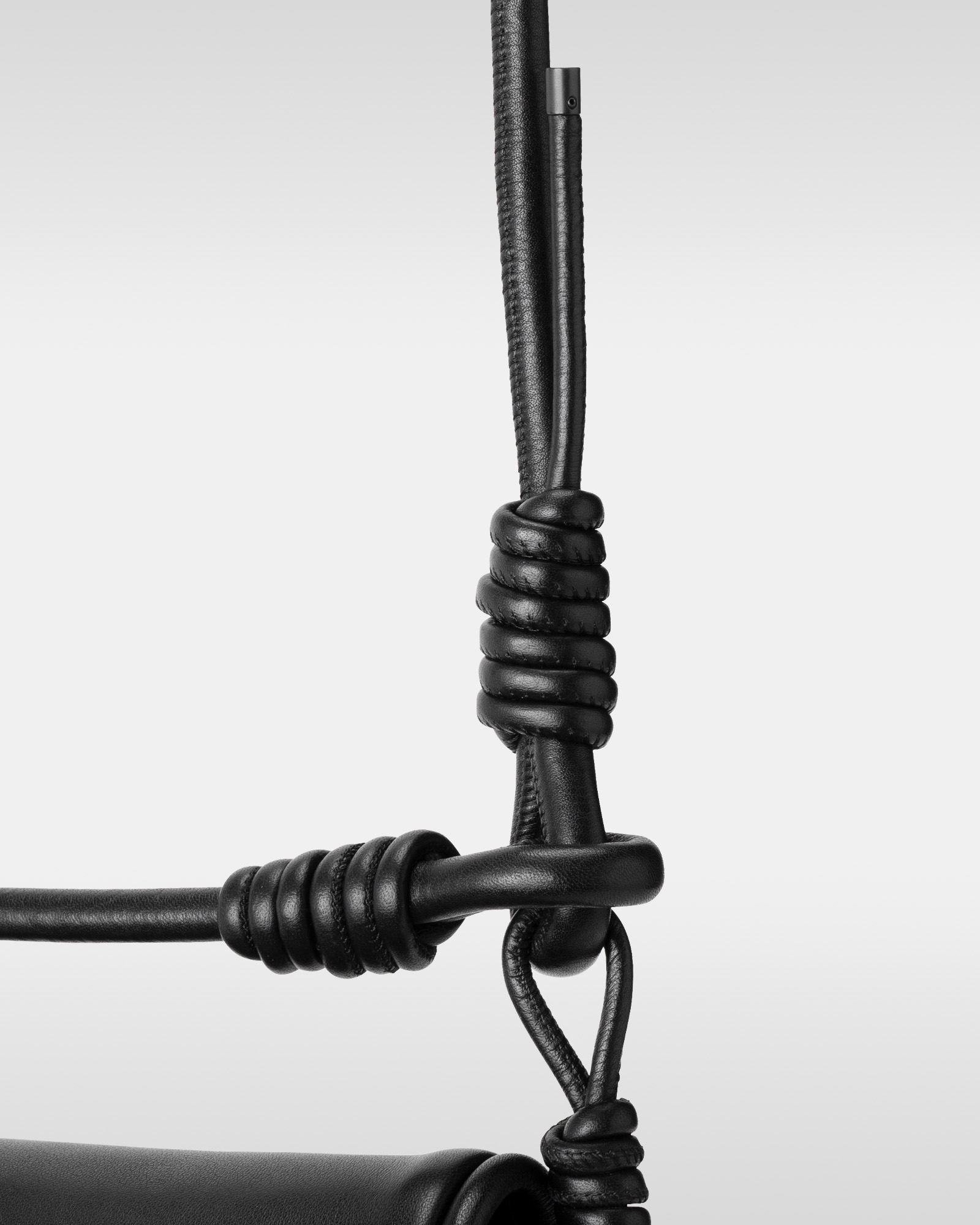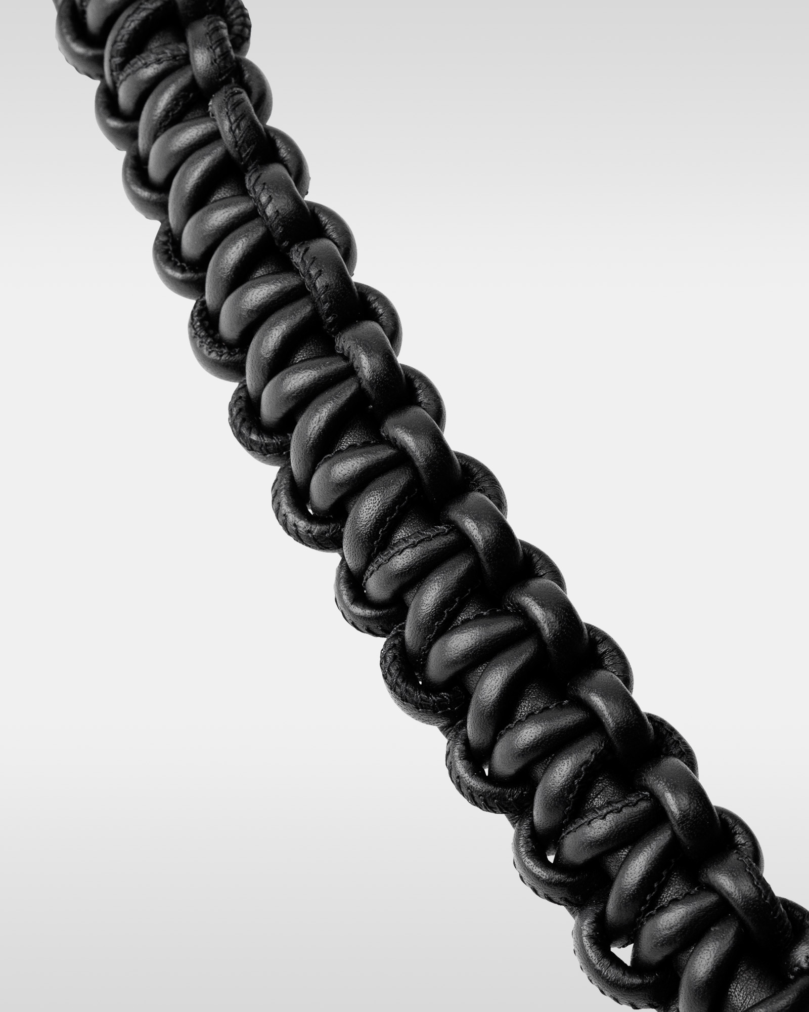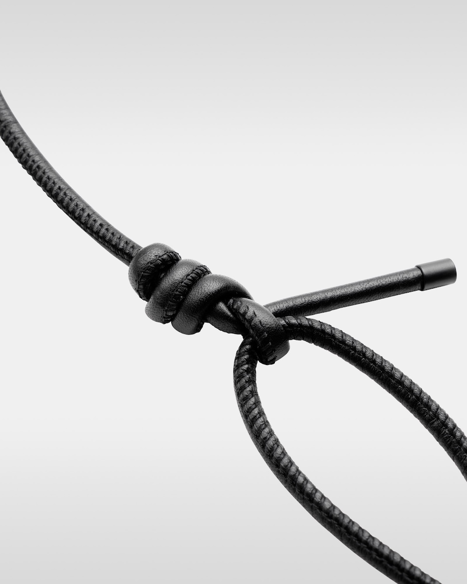 “オーバー エンジニアリング マグウエア レザーパース”(単体、3万9600円/アイフォンケースセット、4万9500円)は、マグネットの付け根部分に結び目を配することで、長さ調節が可能だ。コイル巻きのレザーストラップは、カラビナに通すことでハンドストラップとしても使用でき、ジップとドローコードで開閉するパースには、小物を収納できる。