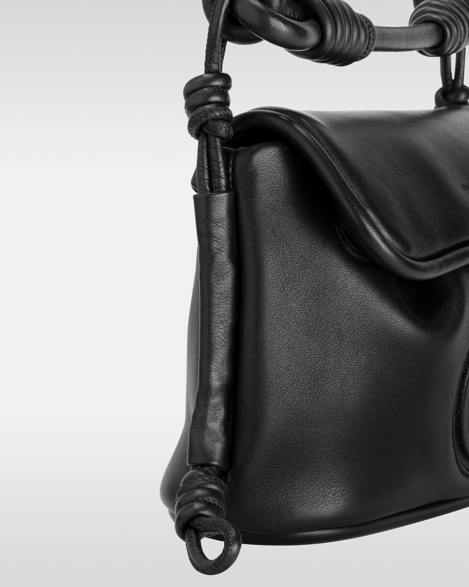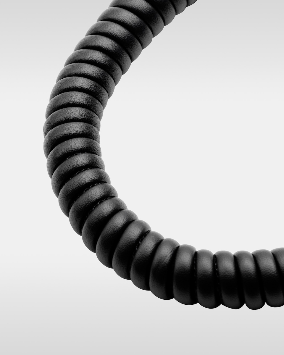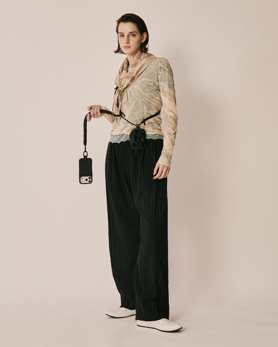 “デンワ レザー バッグ”(単体、9万9000円/アイフォンケースセット、10万8900円)は、黒電話を彷ふつとさせるふっくらとした立体的なボディーと、受話器を模したフラップのデザインが特徴だ。電話コードをオマージュしたコイル巻きの革紐や、肩当て部分のコブラステッチなどを配した。また、バッグ底面には黒電話のゴム足を想起させるラバー性の底鋲を採用している。ボディー前面には、マグセーフ(MAGSAFE)を活用してアイフォン(iPhone)ケースをカラビナで連結し、マグセーフでバッグ本体に固定することで、デバイスとの一体感を生み出す。ストラップはハンドルの使い分けにより、3通りのスタイルが楽しめる。