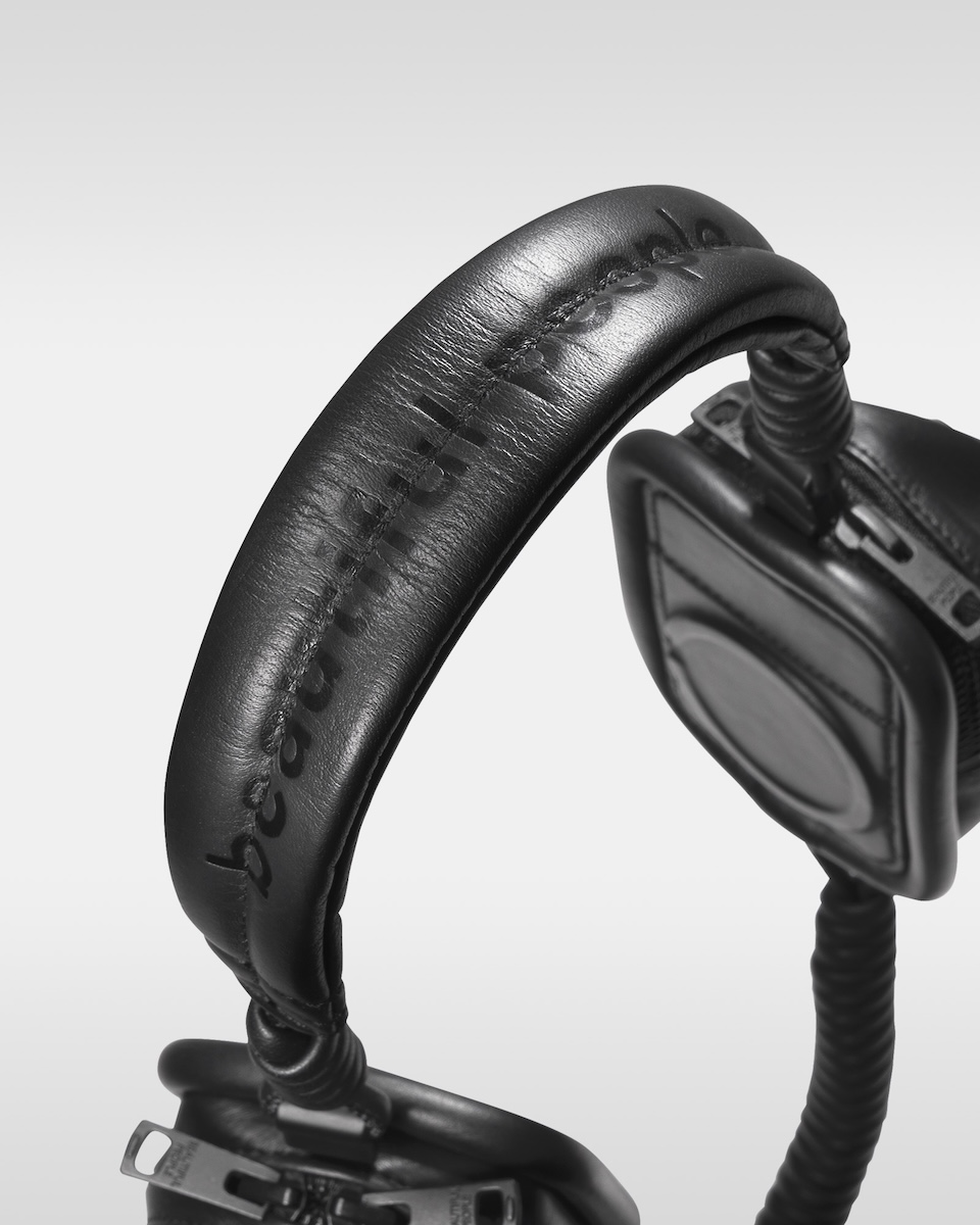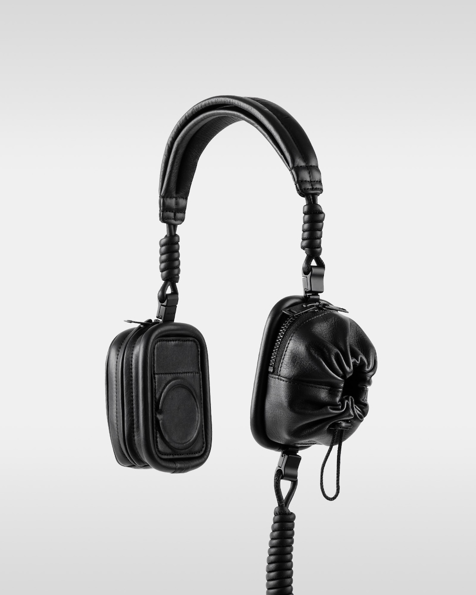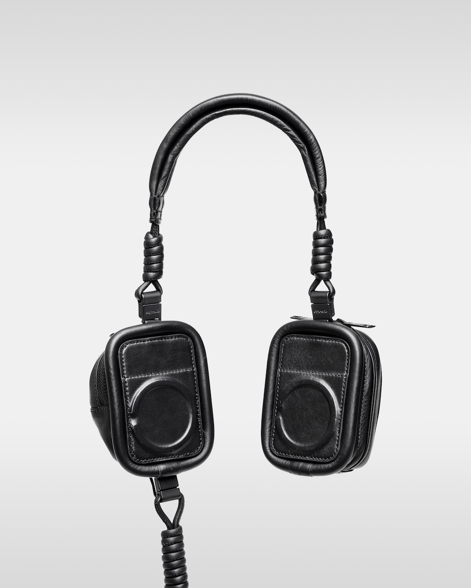 ヘッドホンのフォームをまとったマグウエアアクセサリー(単体、8万6900円/アイフォンケースセット、9万6800円)は、「ビューティフルピープル」のロゴを素押ししたヘッドバンドに「オブジェクツオーツー」のアイテム“レザーパース”と“ソフトバックパックベビーサイズ”を左右非対称に配した。有線ケーブルを思わせるコイル状のレザーストラップを搭載し、カラビナ付きアイフォンケースと連結することで新たなスタイルを提案する。レザーパースとベビーサイズを縁取るパイピングには、ヘッドホンのイヤーパッドをイメージした厚みのあるデザインを採用。パースやベビーバックパック内には、ワイヤレスイヤホンやリップなどの小物を収納できる。