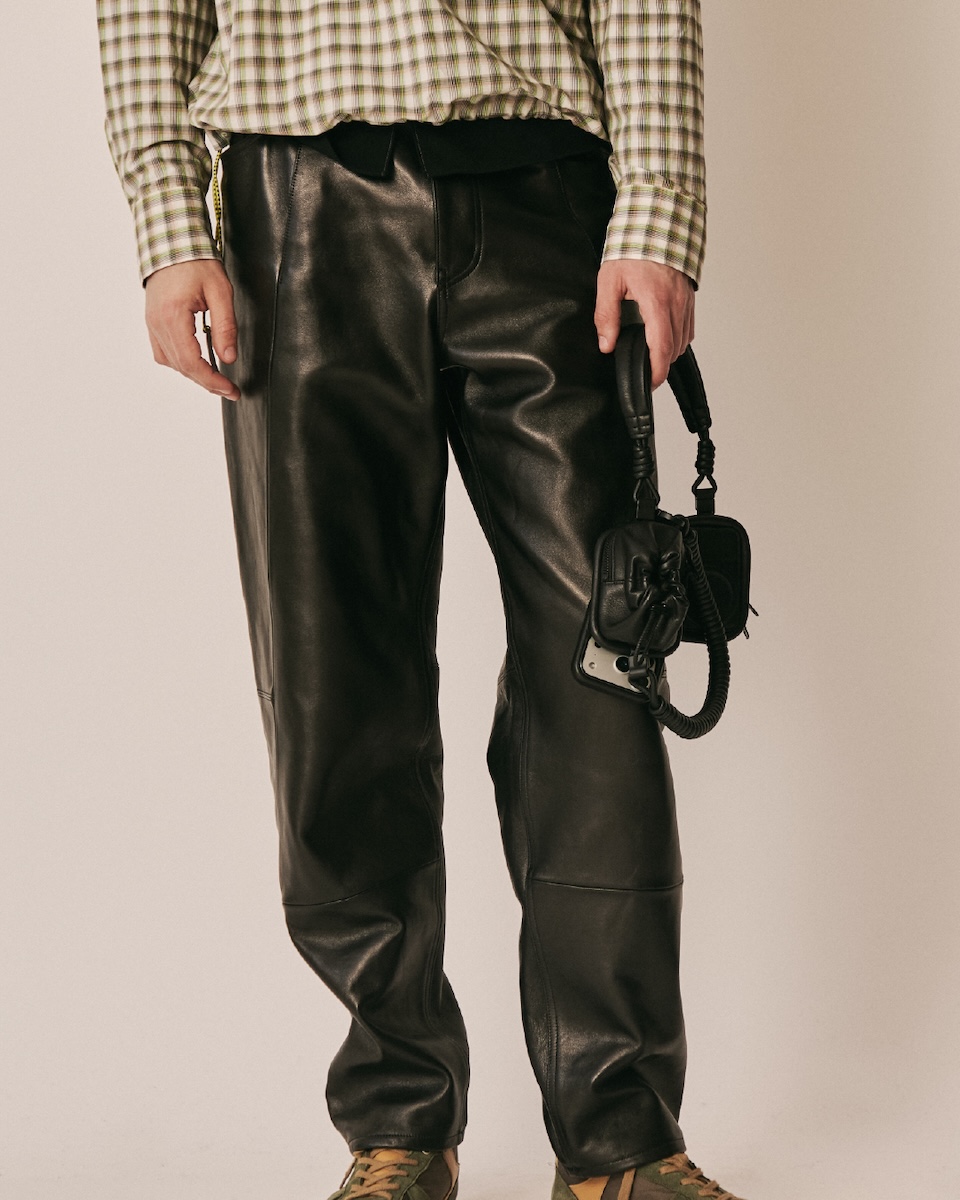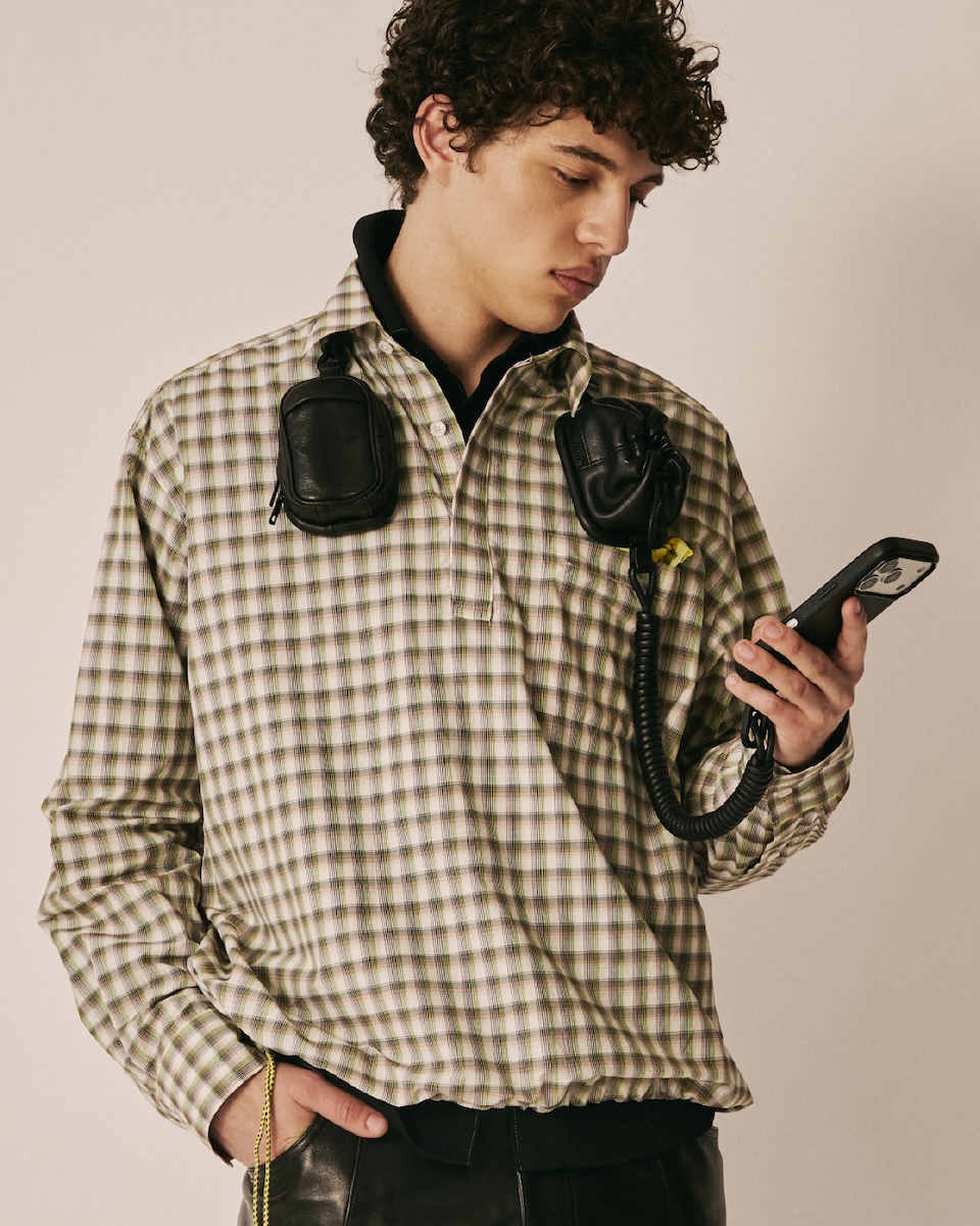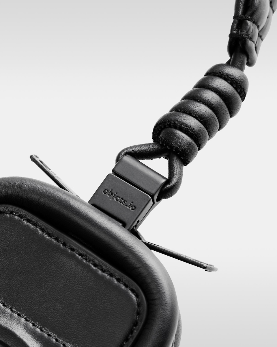 ヘッドホンのフォームをまとったマグウエアアクセサリー(単体、8万6900円/アイフォンケースセット、9万6800円)は、「ビューティフルピープル」のロゴを素押ししたヘッドバンドに「オブジェクツオーツー」のアイテム“レザーパース”と“ソフトバックパックベビーサイズ”を左右非対称に配した。有線ケーブルを思わせるコイル状のレザーストラップを搭載し、カラビナ付きアイフォンケースと連結することで新たなスタイルを提案する。レザーパースとベビーサイズを縁取るパイピングには、ヘッドホンのイヤーパッドをイメージした厚みのあるデザインを採用。パースやベビーバックパック内には、ワイヤレスイヤホンやリップなどの小物を収納できる。