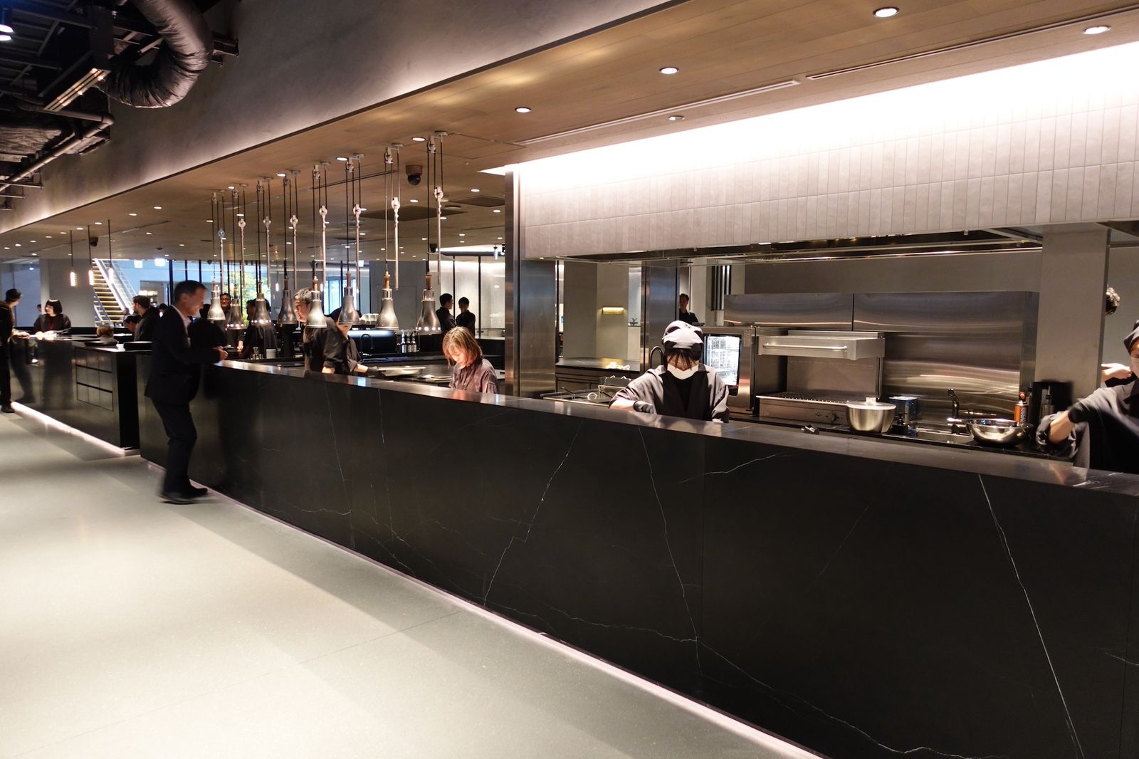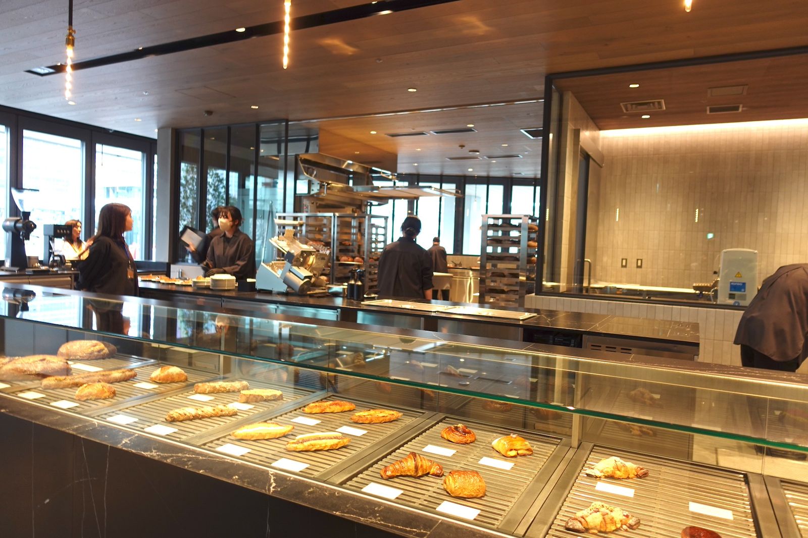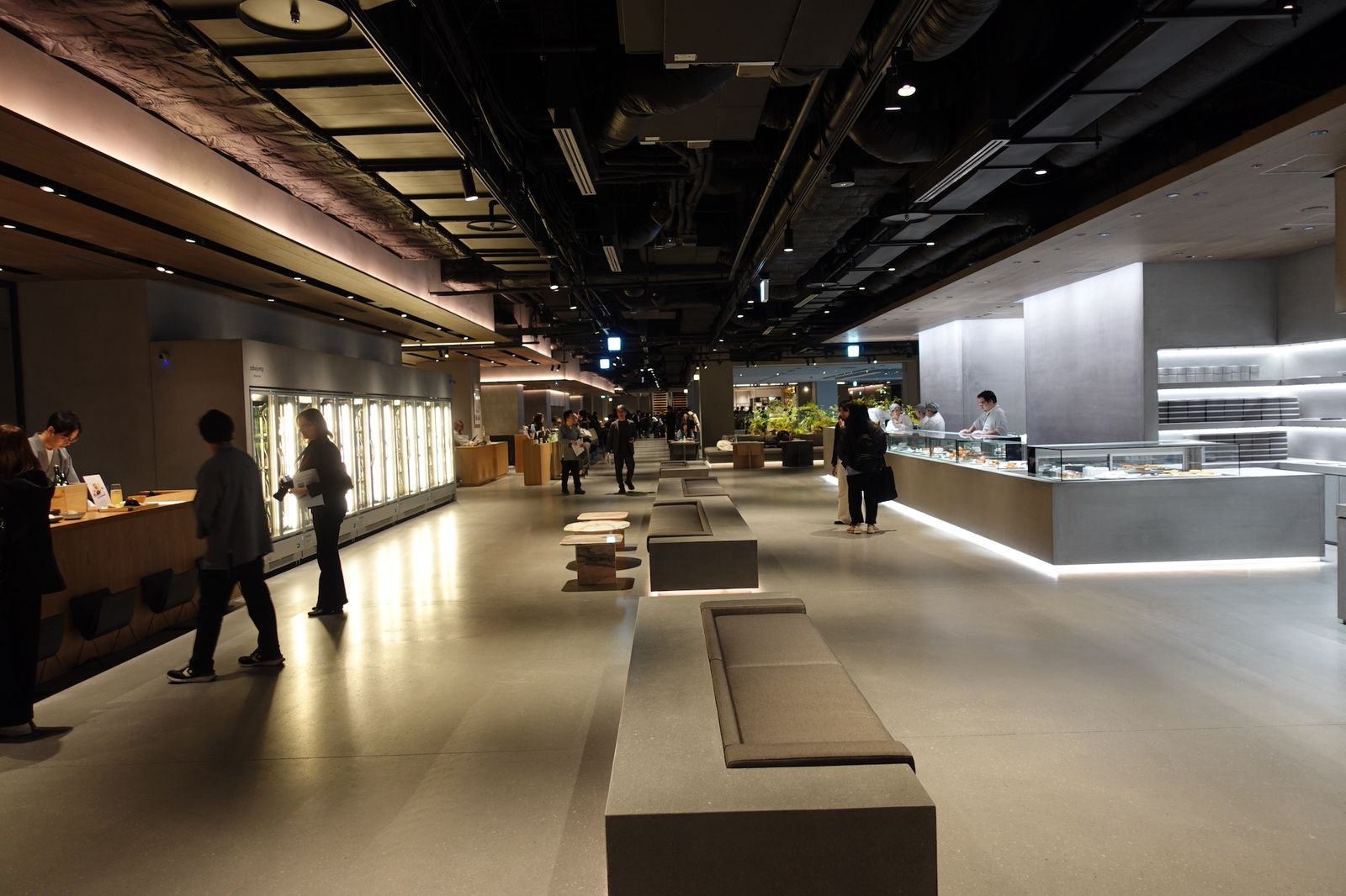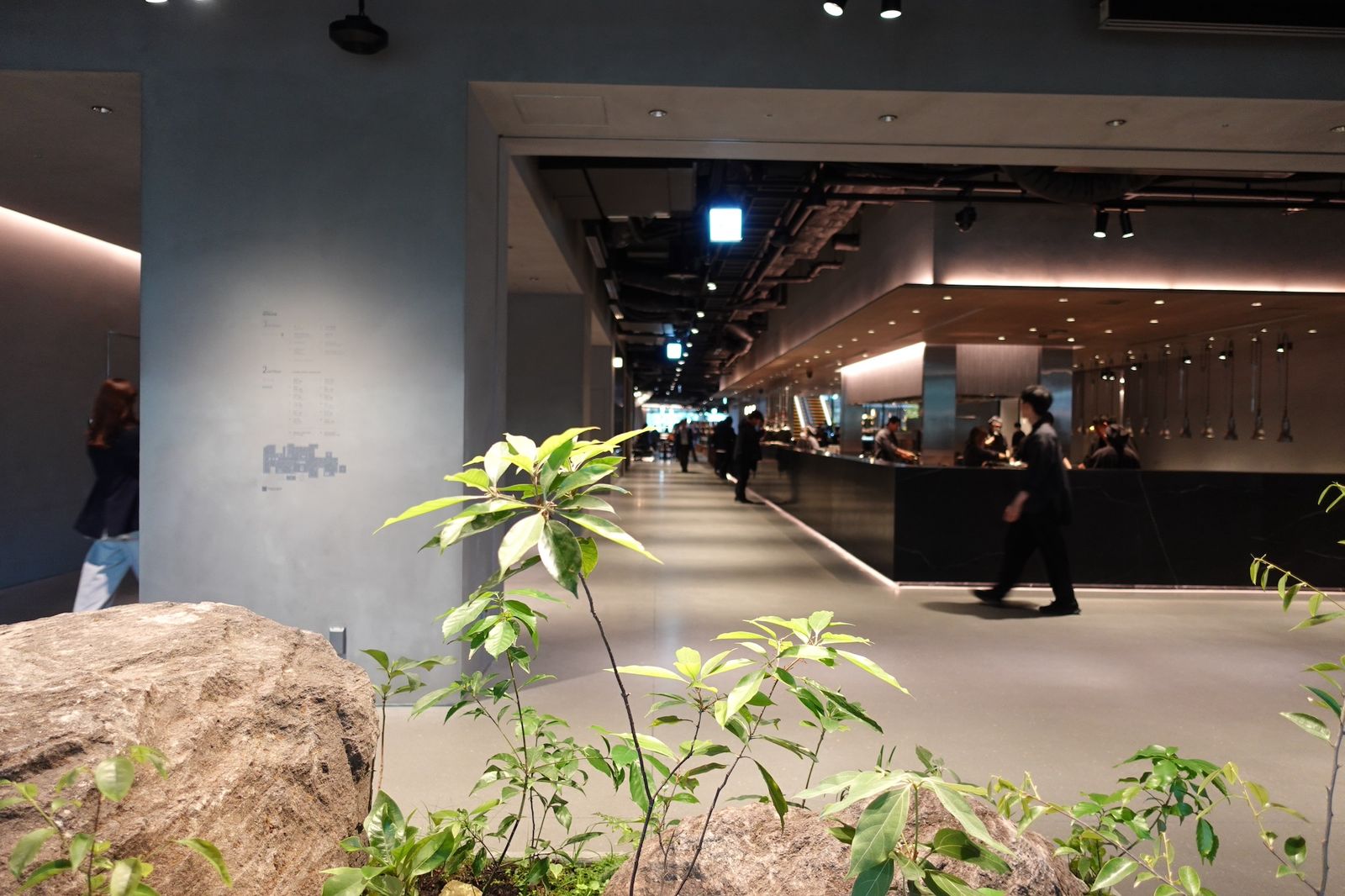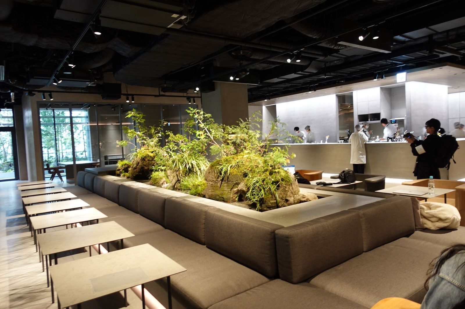そうしてでき上がったのが、4000㎡に達する1フロア全体のデザインを統一し、かつ「ラボラトリー」と呼称するスイーツやベーカリー、カフェ、チョコなど12の”飲食ラボ”をそれぞれクロスオペレーションさせる、という前代未聞の大型飲食テナント「小川珈琲ラボラトリー 高輪」を作り上げた。同フロアの中央には全長5m、重量13トンの植栽した岩石を配置。一定時間で雨を降らせるような仕掛けも施した。