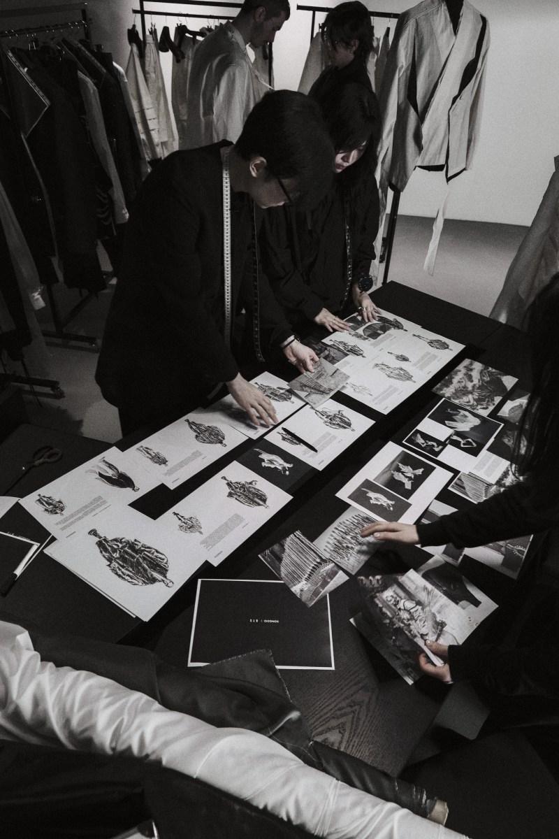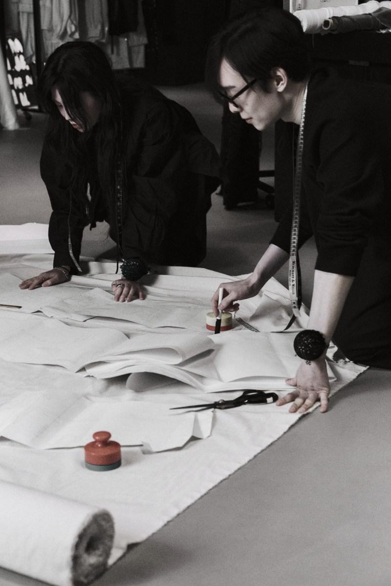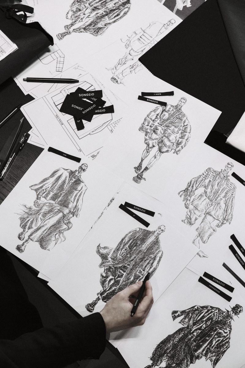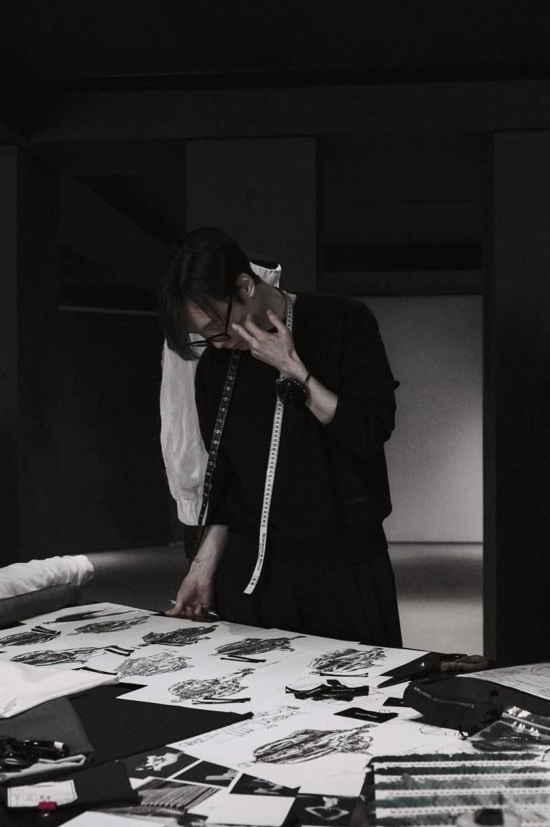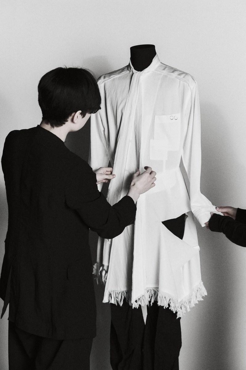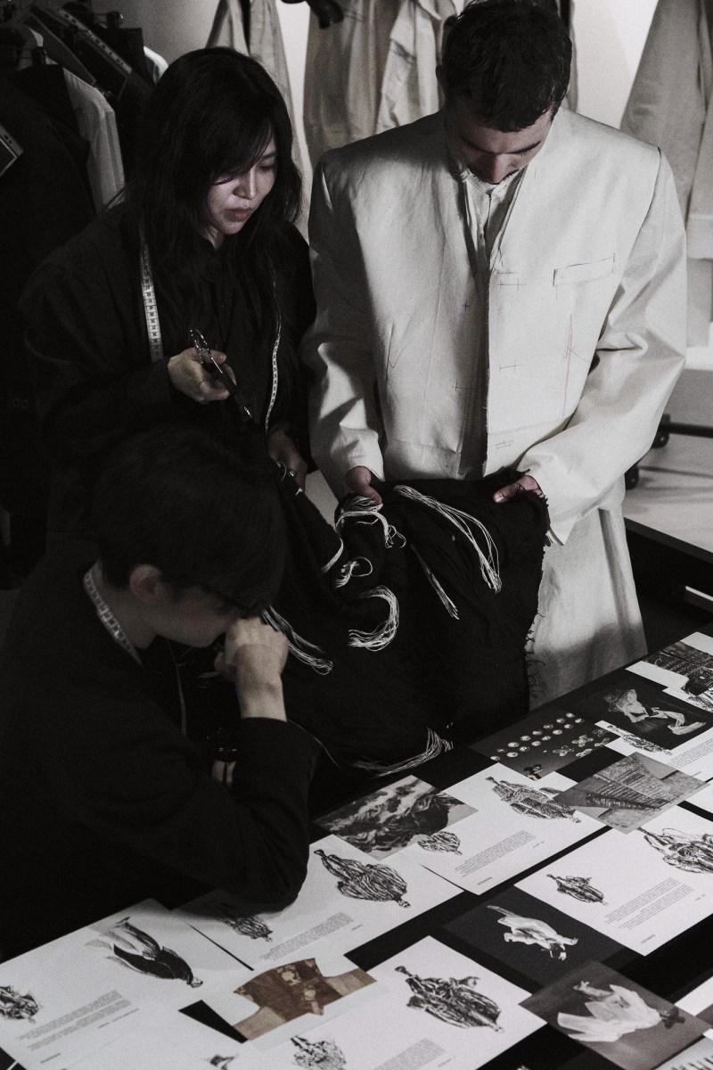 昨夜は、ジョングクが自分の白シャツに韓国の山水画をイメージしてラフにペイントしてほしいと言ったので、急遽その加工を施しました。山水画を提案したのは、今回のコレクションのために特別に開発した生地に合うと思ったからです。コットンとリネンで作った手織りの生地で、ダメージ加工を加えたことで糸が滝のように連なって垂れ下がり、自然で有機的な感覚を表現しました。