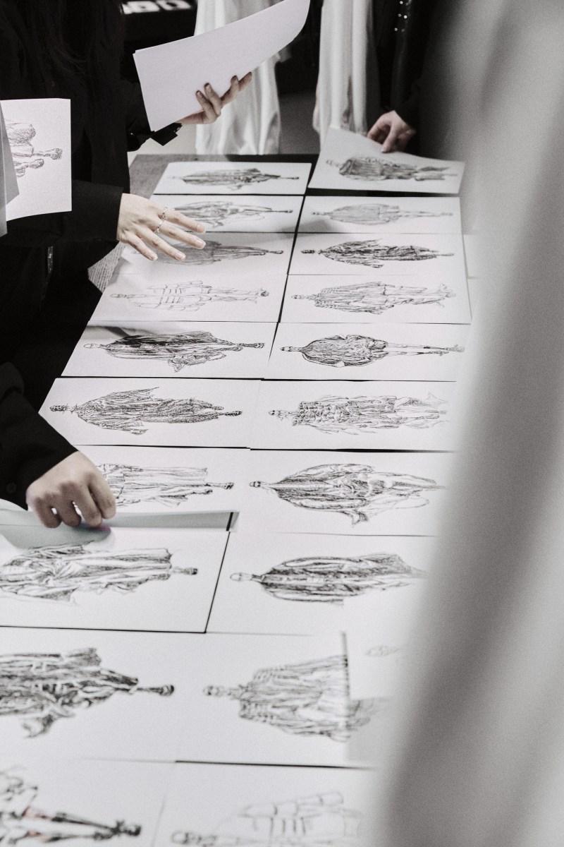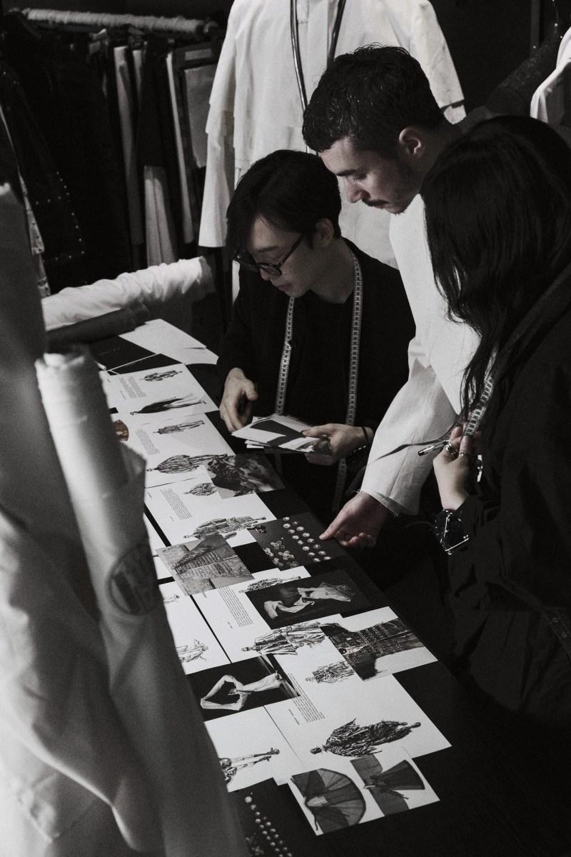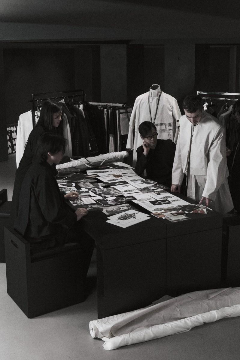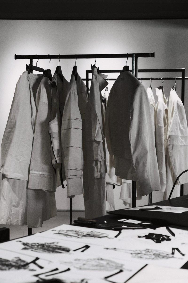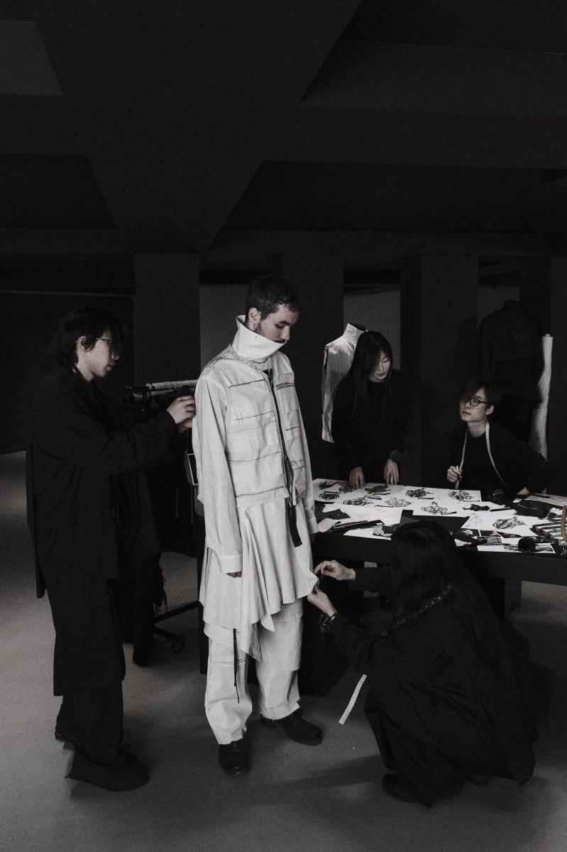昨夜は、ジョングクが自分の白シャツに韓国の山水画をイメージしてラフにペイントしてほしいと言ったので、急遽その加工を施しました。山水画を提案したのは、今回のコレクションのために特別に開発した生地に合うと思ったからです。コットンとリネンで作った手織りの生地で、ダメージ加工を加えたことで糸が滝のように連なって垂れ下がり、自然で有機的な感覚を表現しました。