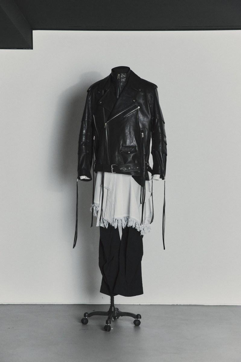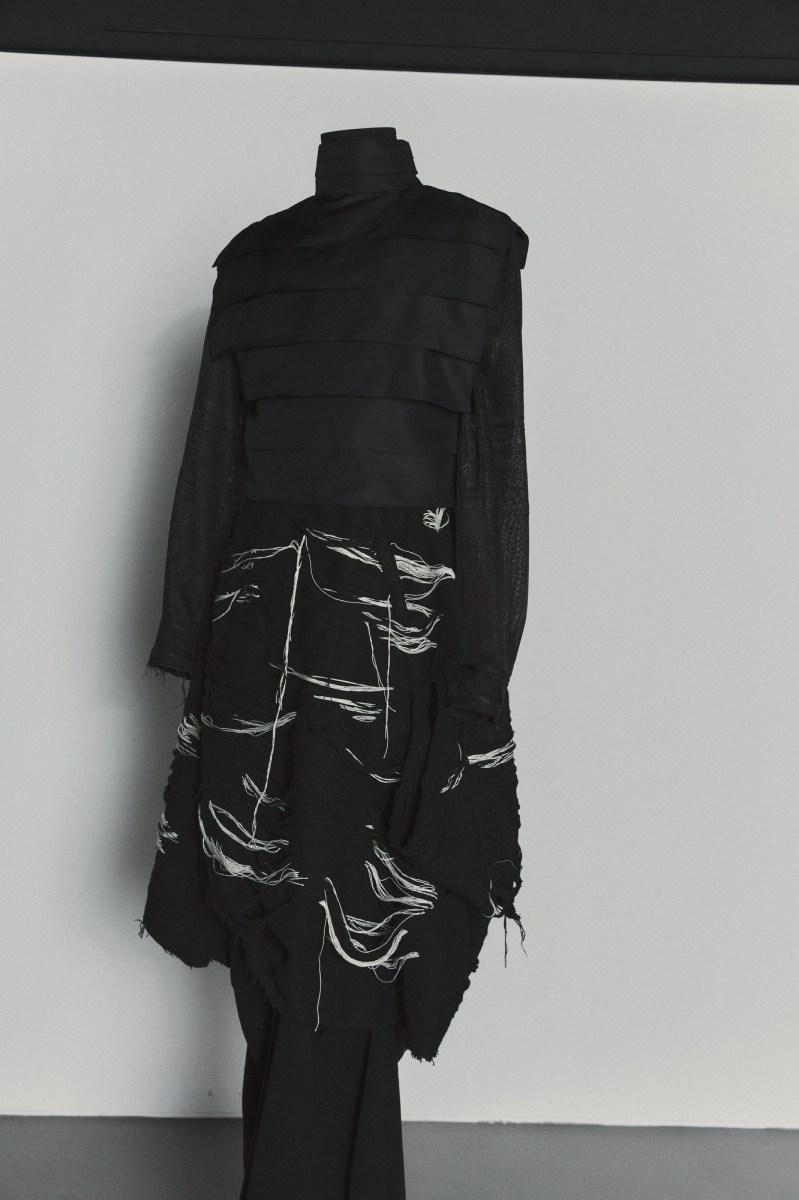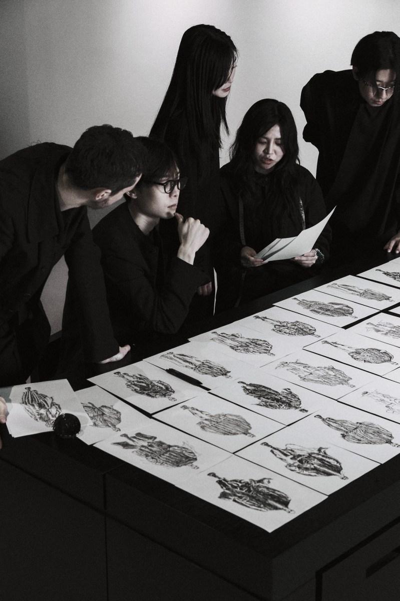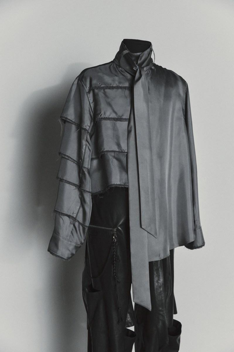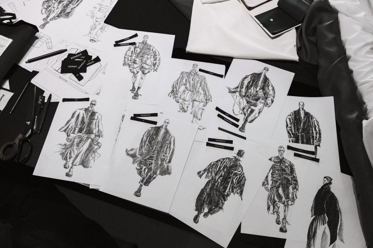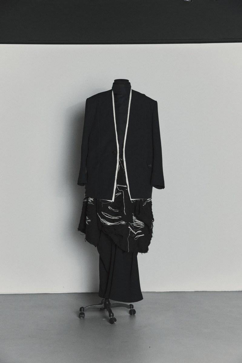 昨夜は、ジョングクが自分の白シャツに韓国の山水画をイメージしてラフにペイントしてほしいと言ったので、急遽その加工を施しました。山水画を提案したのは、今回のコレクションのために特別に開発した生地に合うと思ったからです。コットンとリネンで作った手織りの生地で、ダメージ加工を加えたことで糸が滝のように連なって垂れ下がり、自然で有機的な感覚を表現しました。