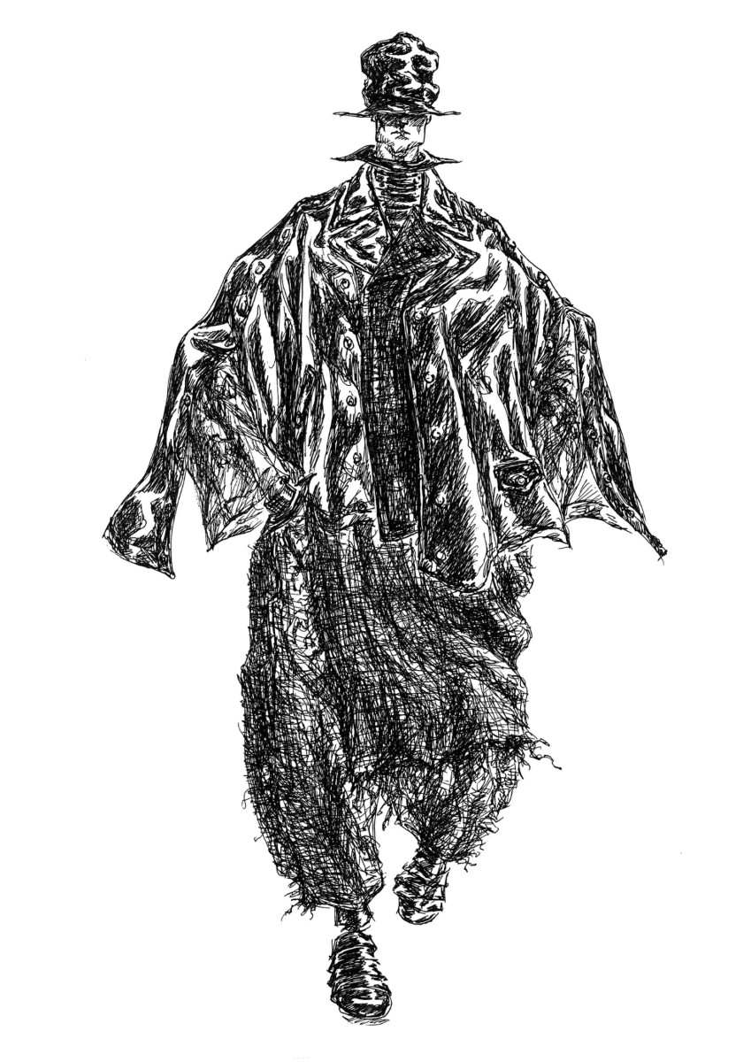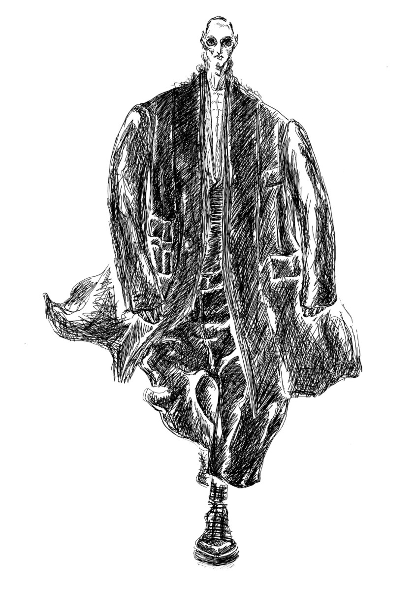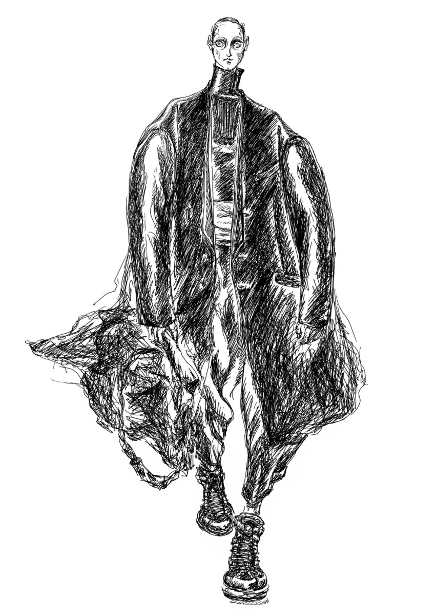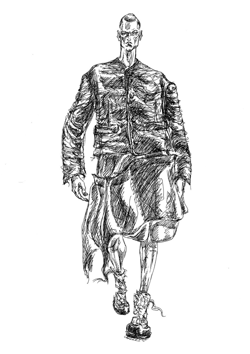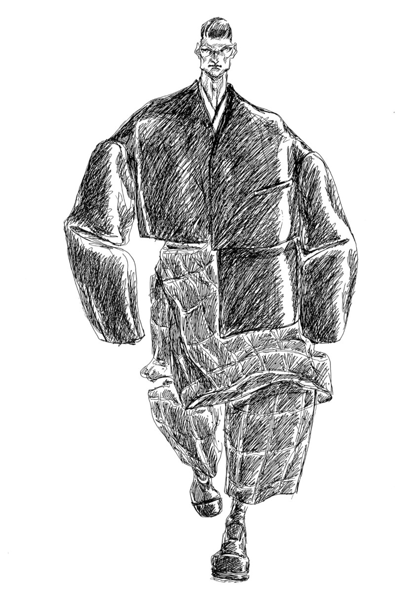 昨夜は、ジョングクが自分の白シャツに韓国の山水画をイメージしてラフにペイントしてほしいと言ったので、急遽その加工を施しました。山水画を提案したのは、今回のコレクションのために特別に開発した生地に合うと思ったからです。コットンとリネンで作った手織りの生地で、ダメージ加工を加えたことで糸が滝のように連なって垂れ下がり、自然で有機的な感覚を表現しました。