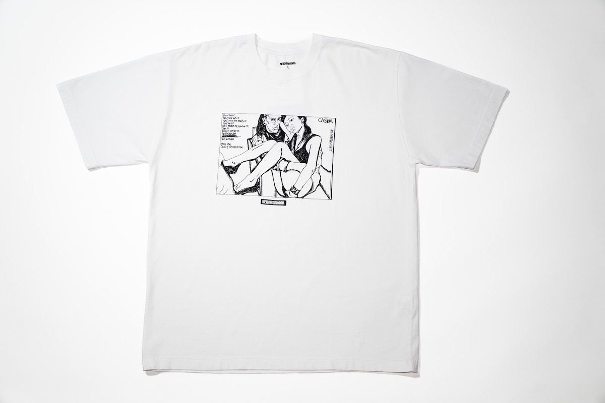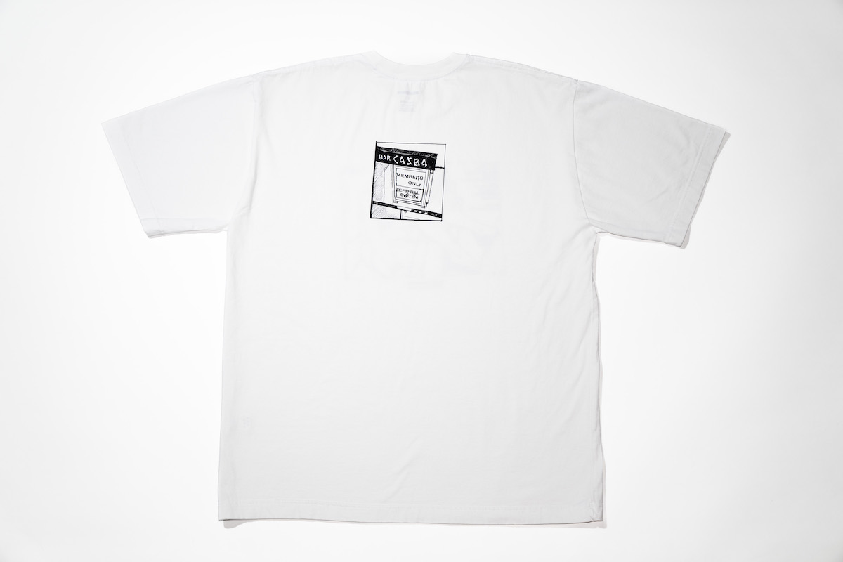 「ネイバーフッド × カスバ」のTシャツは1万1000円。毎夜の「カスバ」での時間の一コマと象徴的なエントランスの写真のアーカイブから、滝沢伸介「ネイバーフッド」デザイナーがセレクトし、自らドローイングした作品をグラフィックに用いた。会話の断片のようなテキストも添えている。
