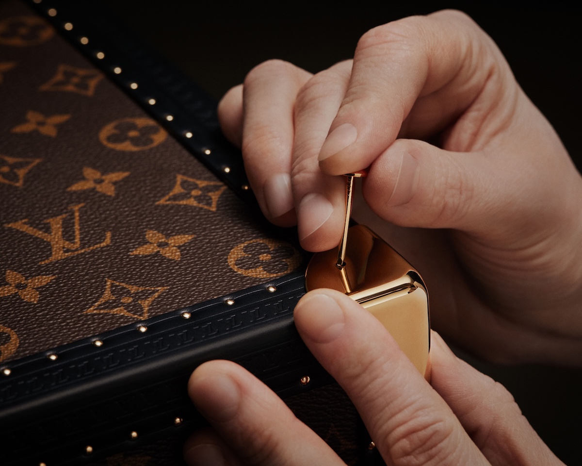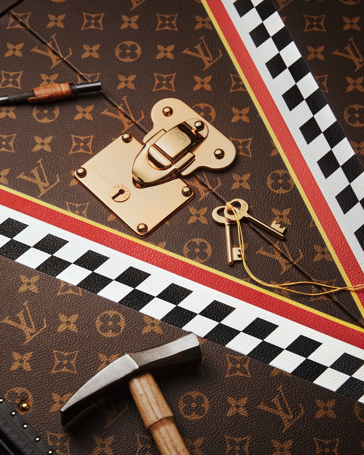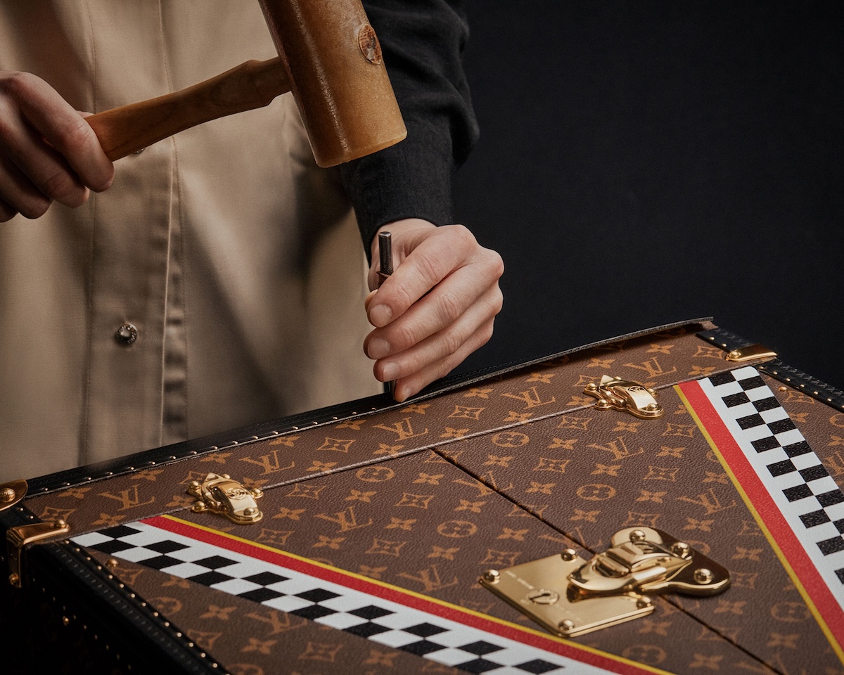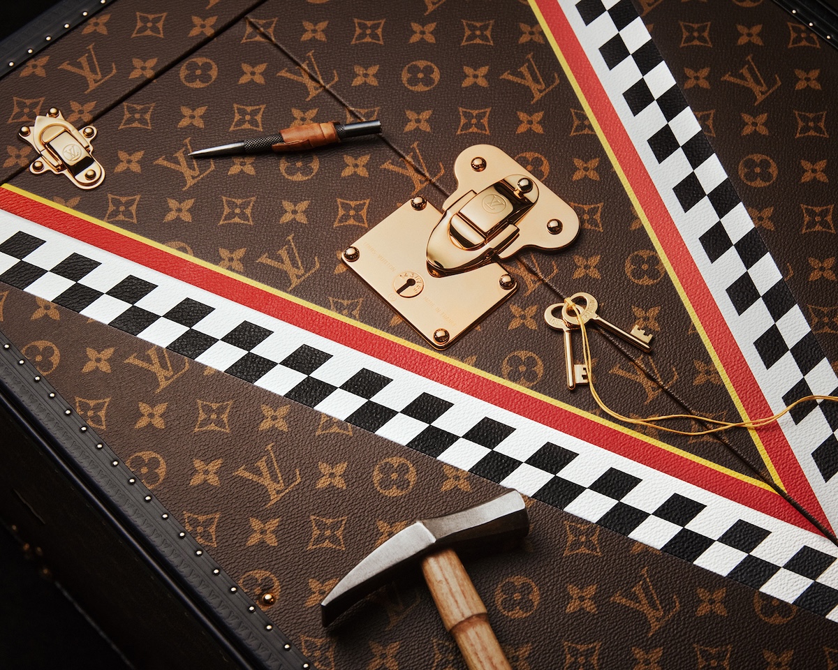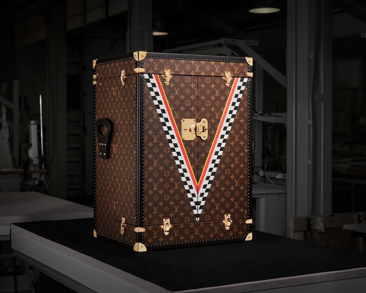 本トロフィートランクは、パリ郊外のアニエールに位置するメゾンのアトリエで、熟練の職人たちの手作業で製作。アイコニックなモノグラムキャンバスを基調に、“Victory”と “Vuitton“を意味する“Vモチーフ”を配置。“Vモチーフ”には、日本を象徴するホワイトとレッドに加え、フィニッシュラインを想起させるブラックとホワイトのダミエを取り入れた。