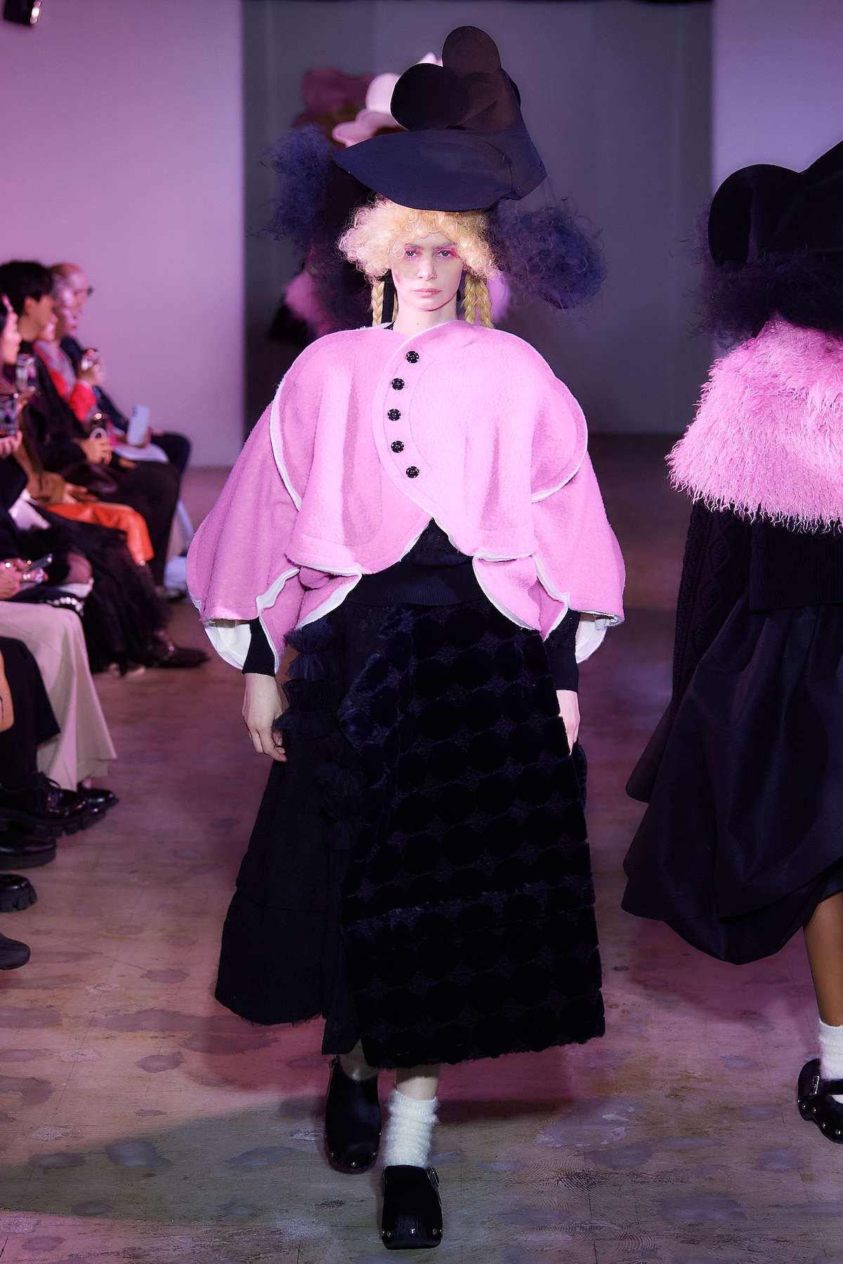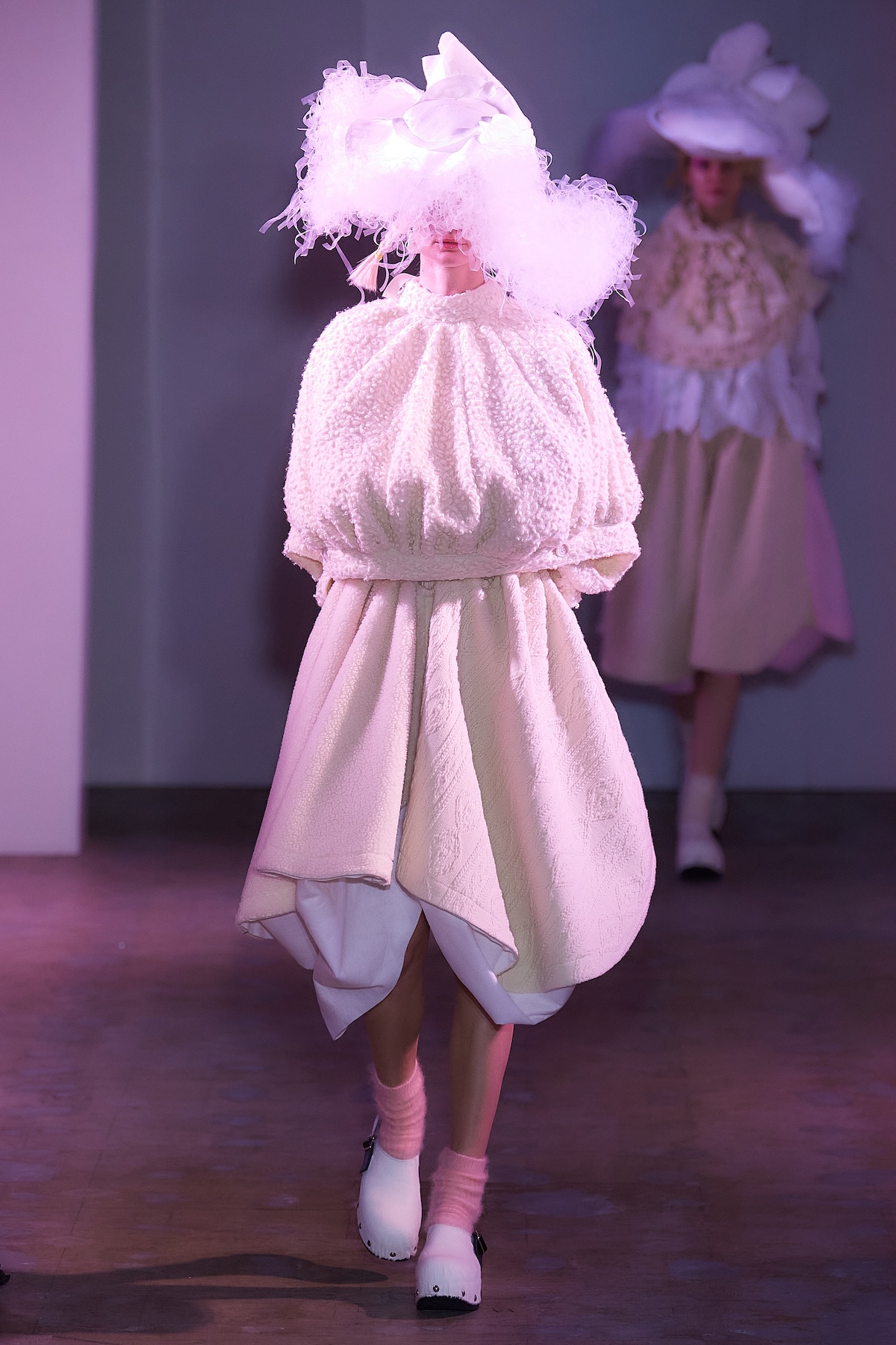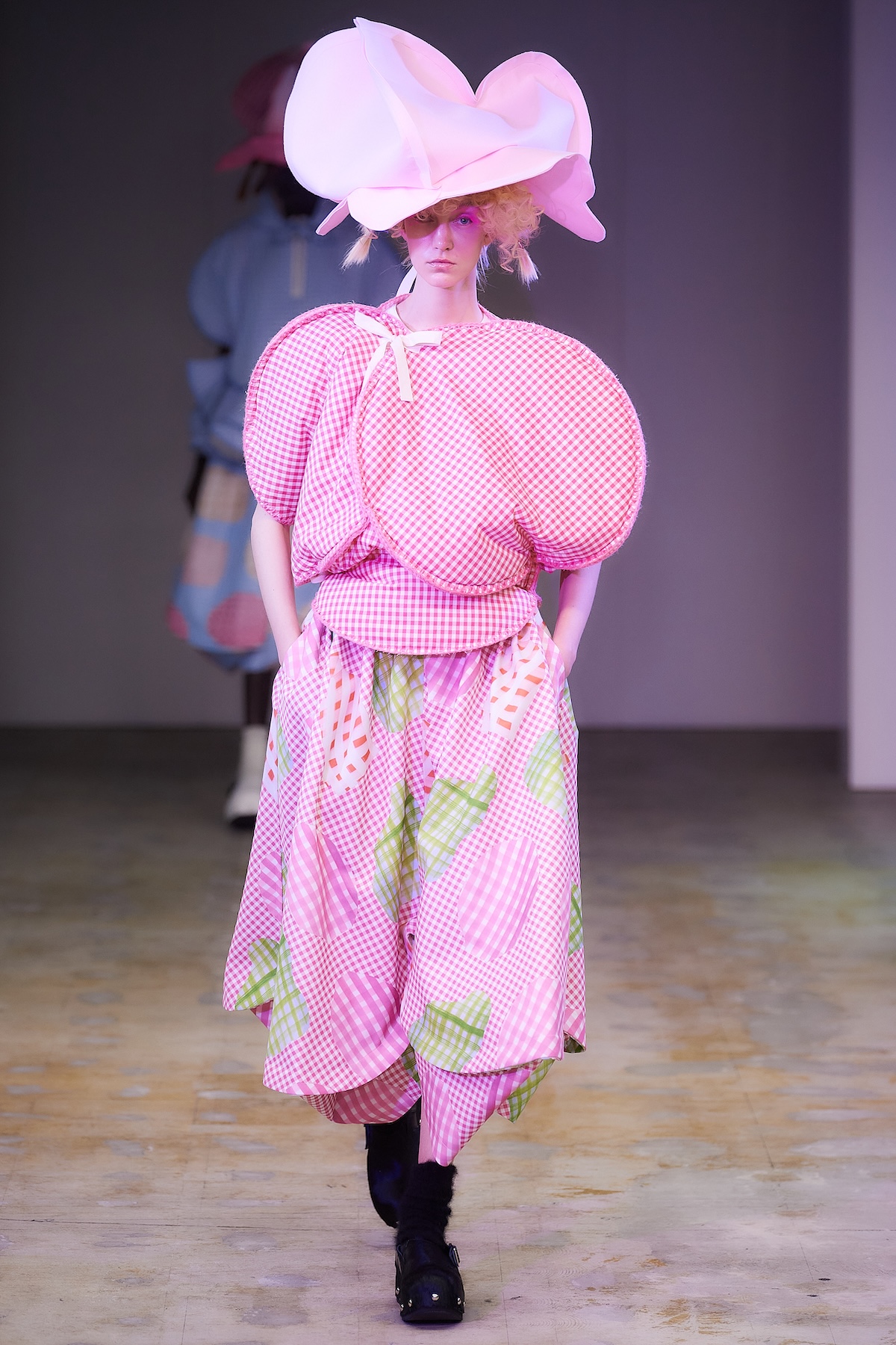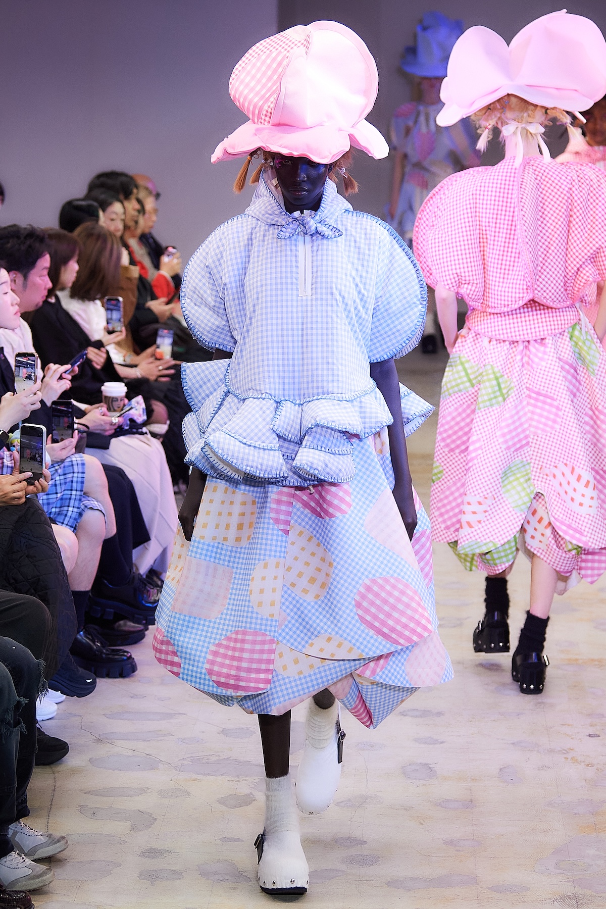 ショー中盤には、モノトーンのテーラードルックや、フリルをふんだんにあしらったブラウスとスカート、「タオ」らしいギンガムチェックのアンサンブルが登場。カラフルなスポットライトを凝縮したかのような幻想的なスカートも印象を残した。後半はビビッドなピンクの光に包まれ、エクリュのボアスカートやピンクのシャギーケープ、ネイビーのチュールスカートなどが続き、華やかさと幻想的な柔らかさが交錯するムードで幕を閉じた。