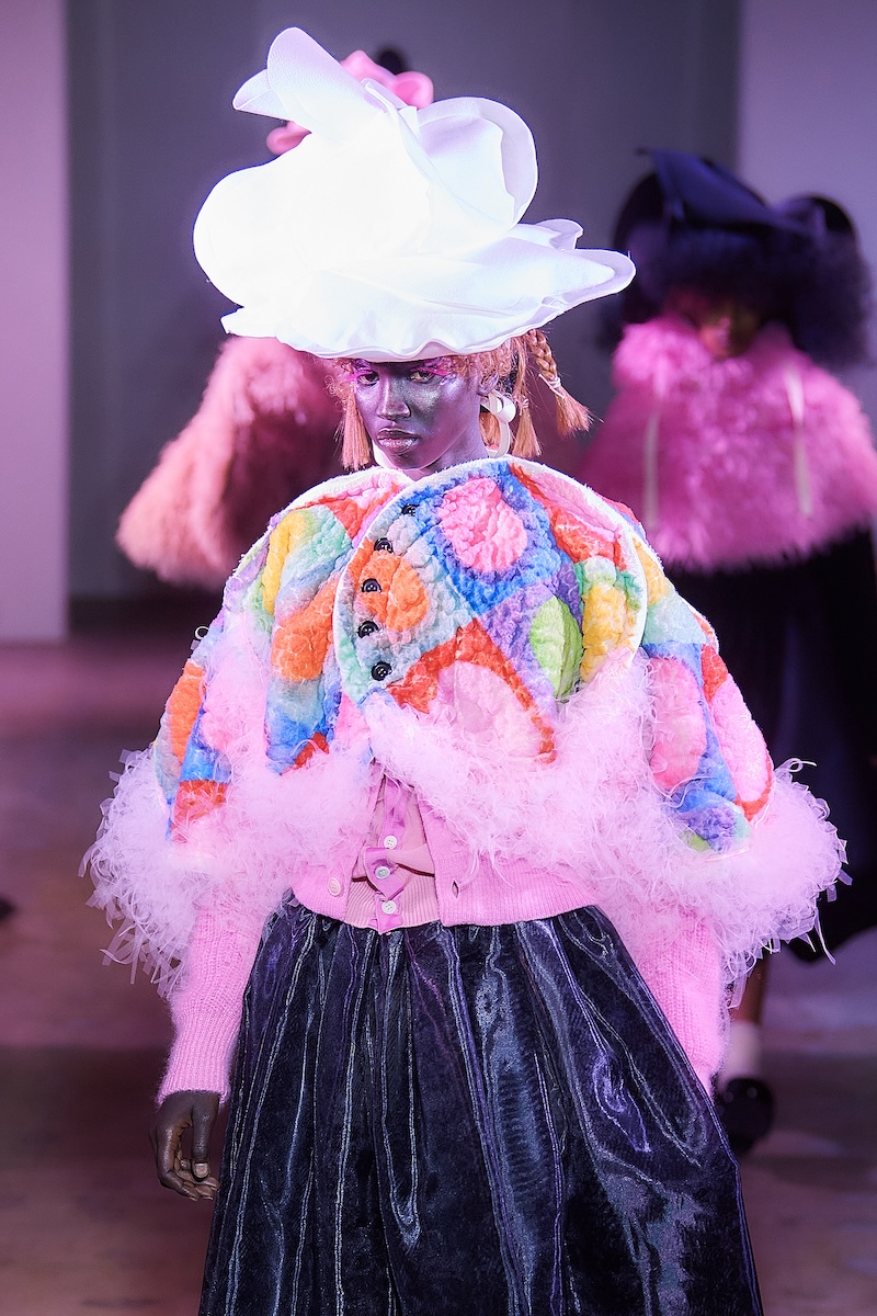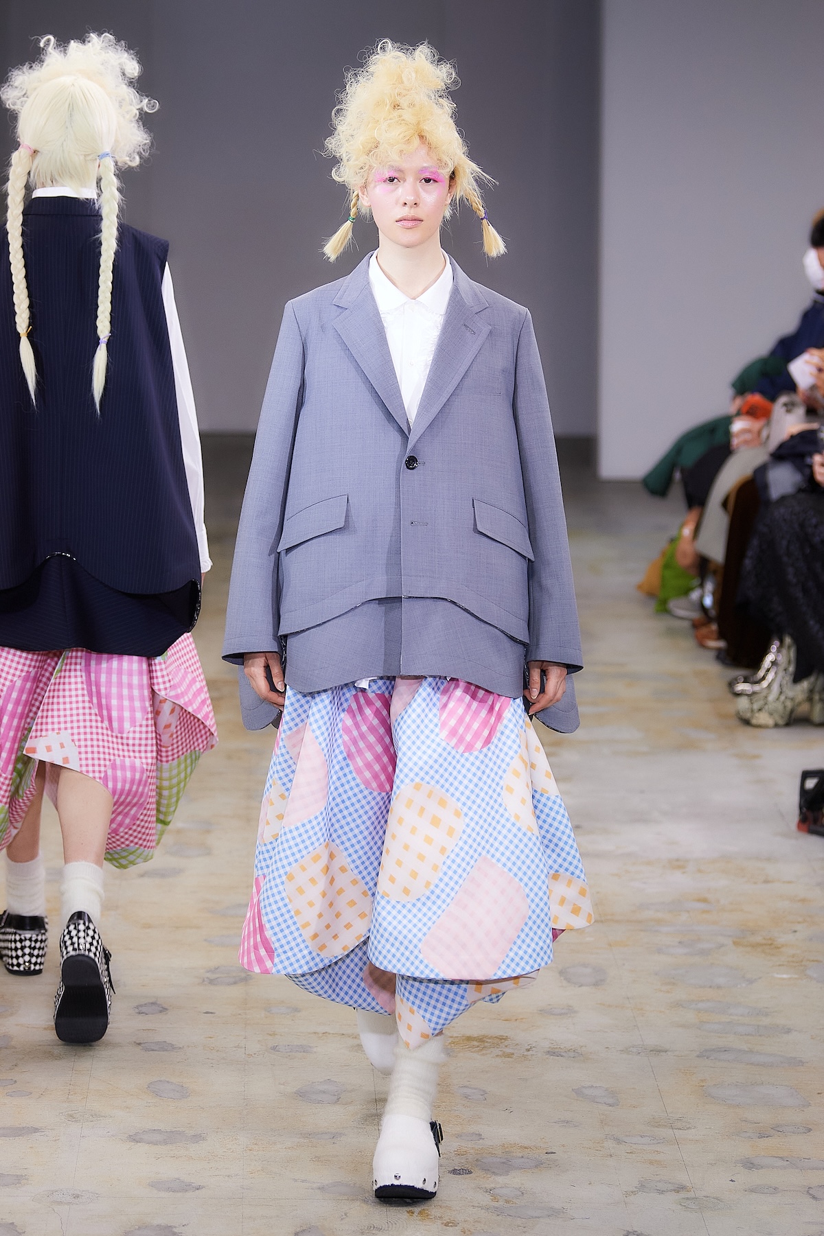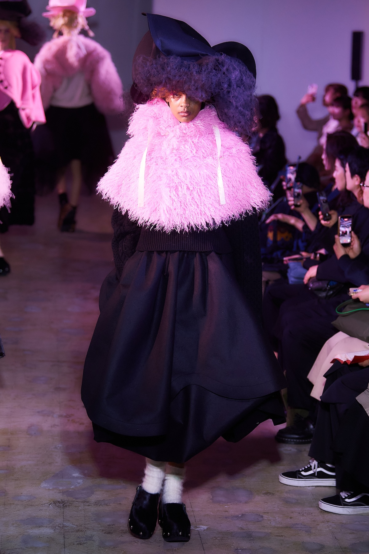 ショー中盤には、モノトーンのテーラードルックや、フリルをふんだんにあしらったブラウスとスカート、「タオ」らしいギンガムチェックのアンサンブルが登場。カラフルなスポットライトを凝縮したかのような幻想的なスカートも印象を残した。後半はビビッドなピンクの光に包まれ、エクリュのボアスカートやピンクのシャギーケープ、ネイビーのチュールスカートなどが続き、華やかさと幻想的な柔らかさが交錯するムードで幕を閉じた。