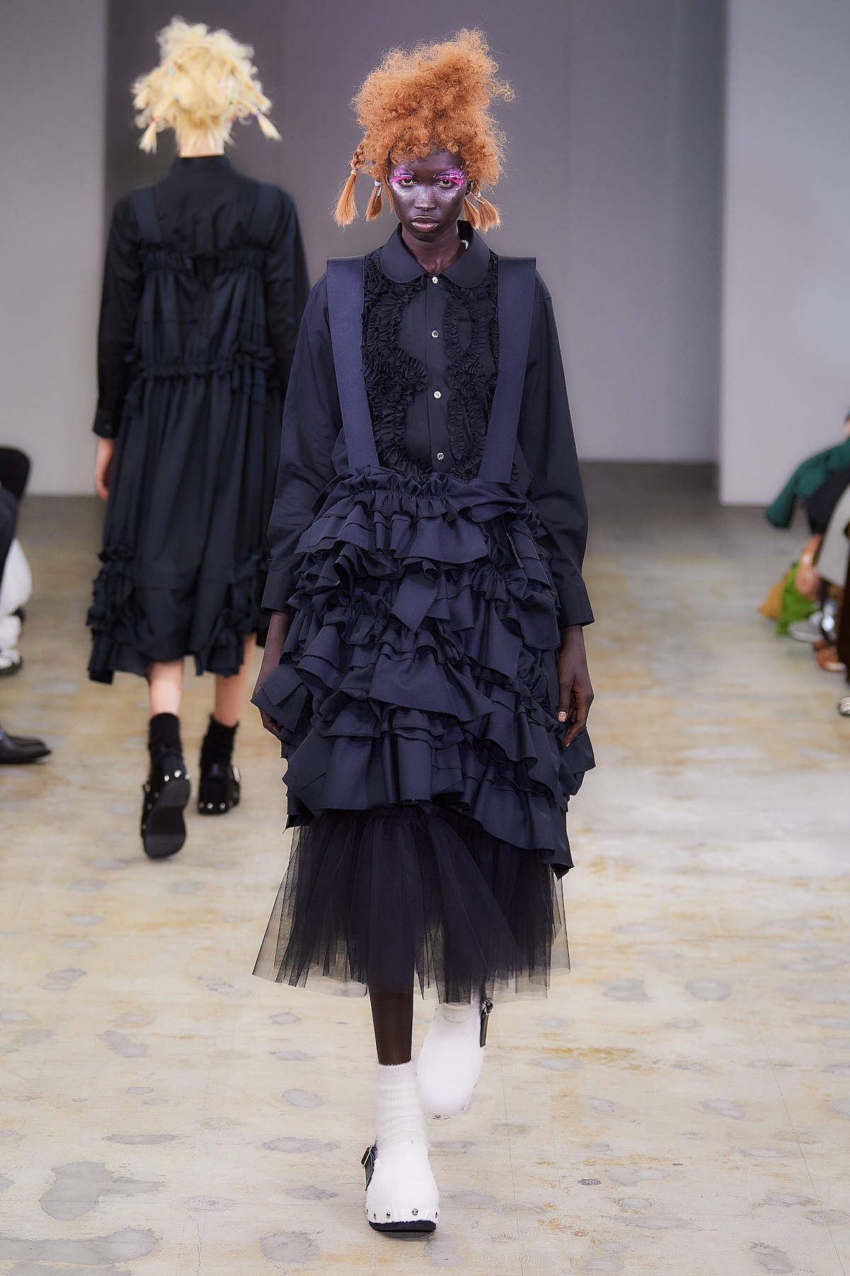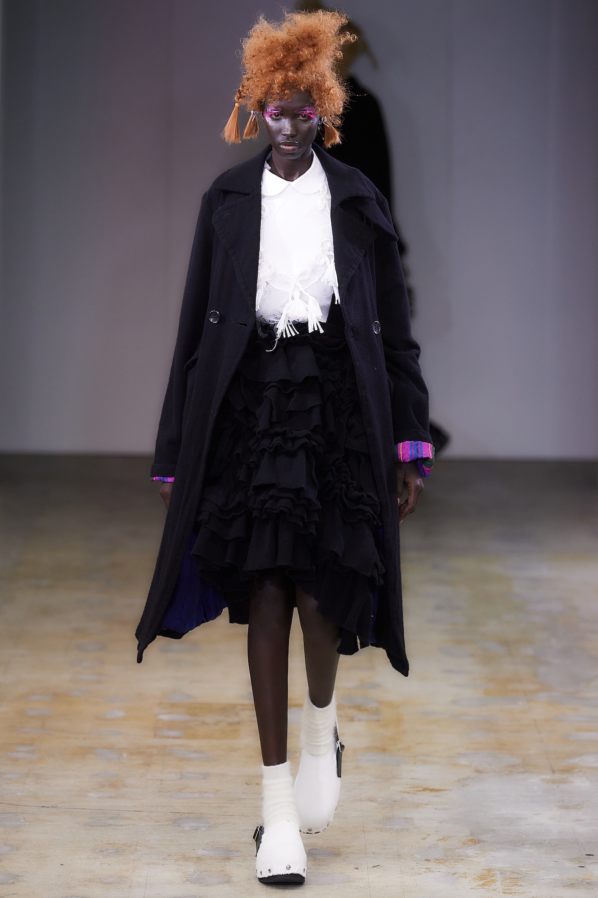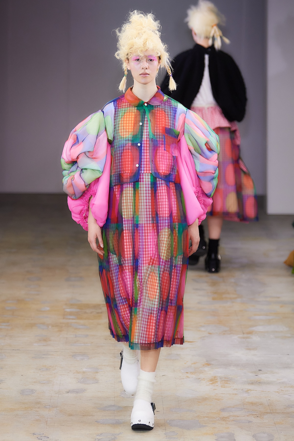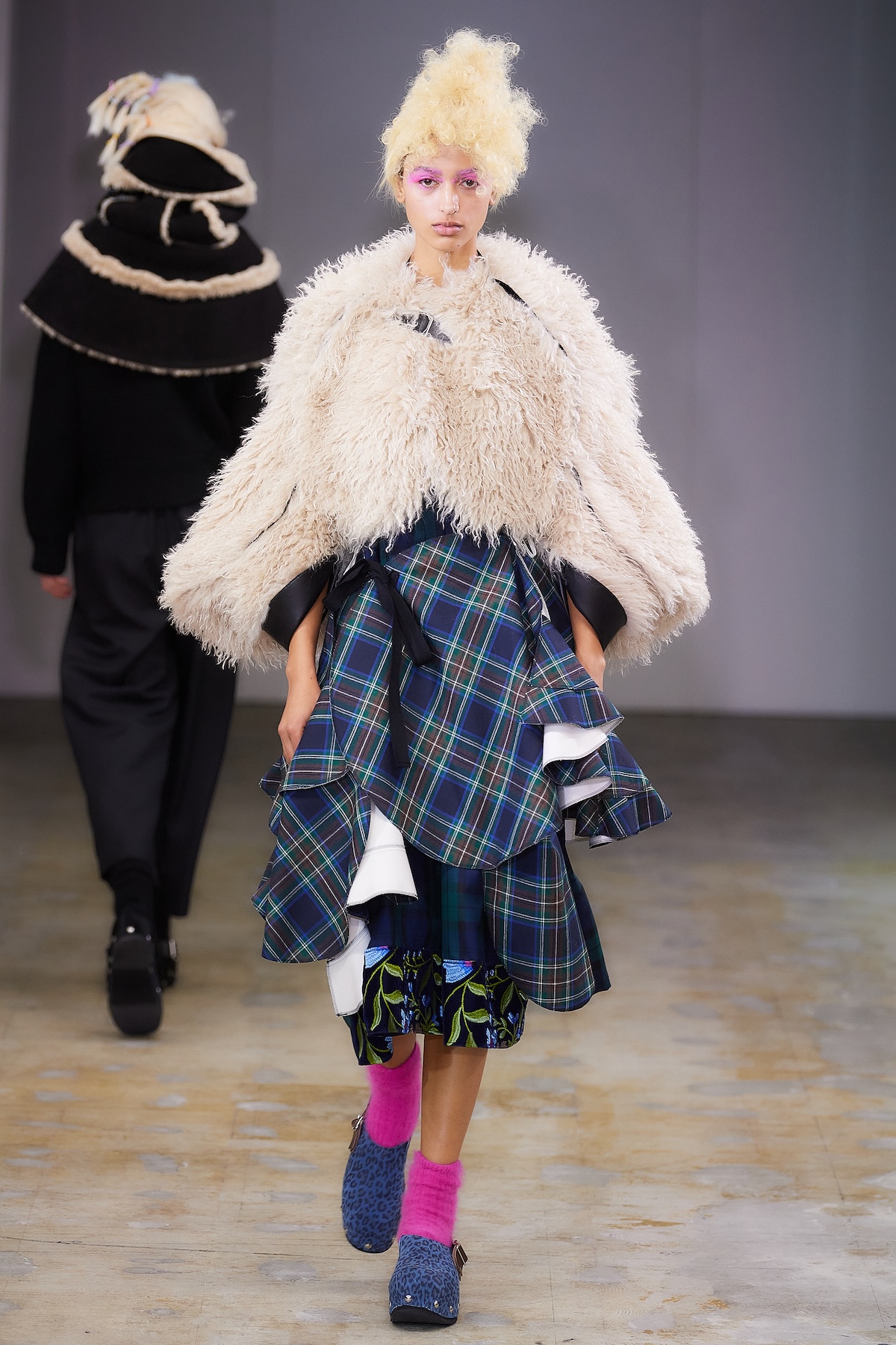 ショー中盤には、モノトーンのテーラードルックや、フリルをふんだんにあしらったブラウスとスカート、「タオ」らしいギンガムチェックのアンサンブルが登場。カラフルなスポットライトを凝縮したかのような幻想的なスカートも印象を残した。後半はビビッドなピンクの光に包まれ、エクリュのボアスカートやピンクのシャギーケープ、ネイビーのチュールスカートなどが続き、華やかさと幻想的な柔らかさが交錯するムードで幕を閉じた。