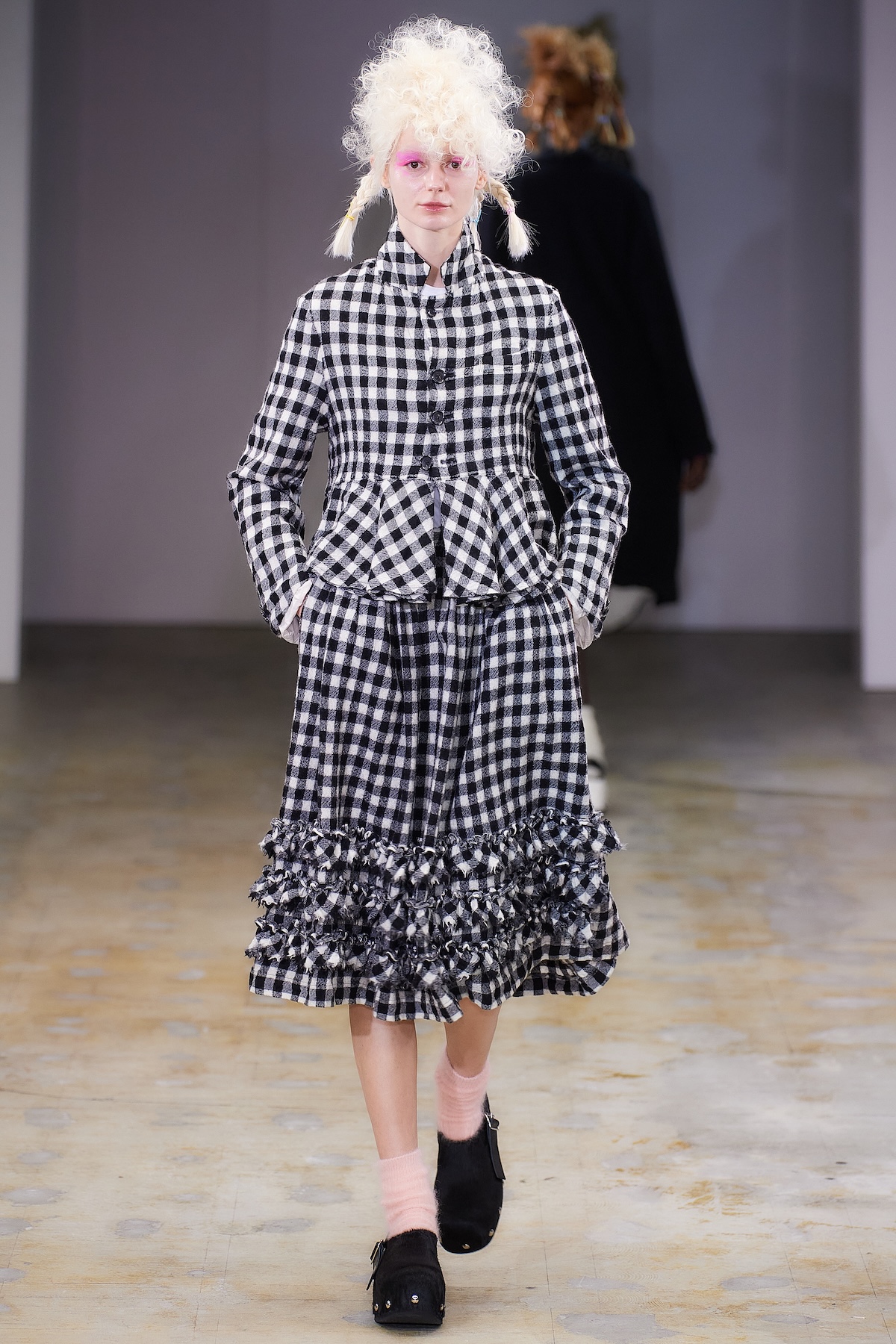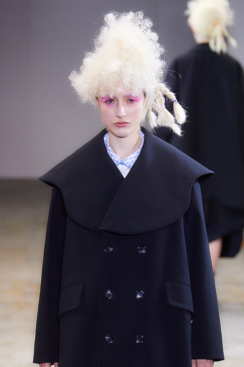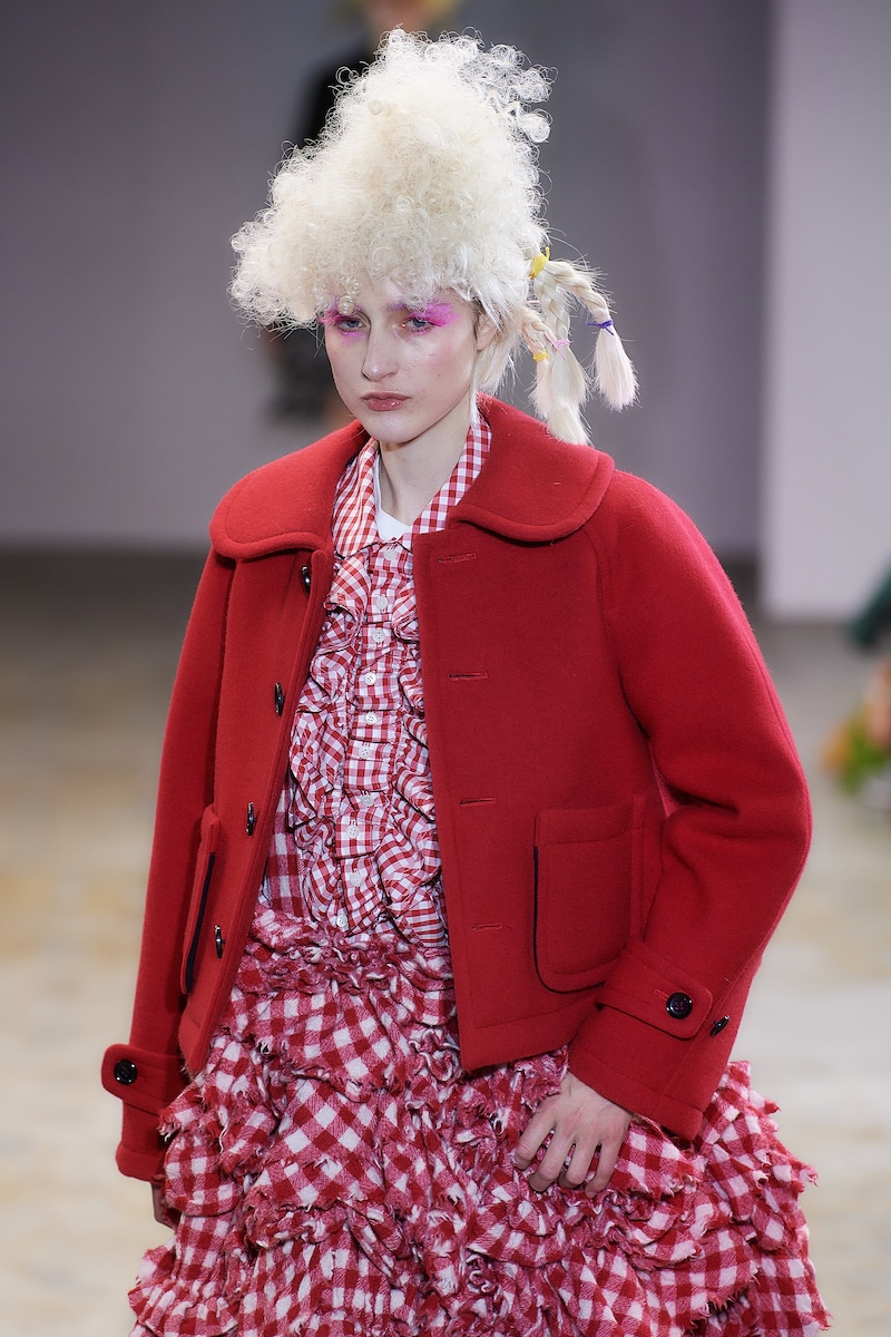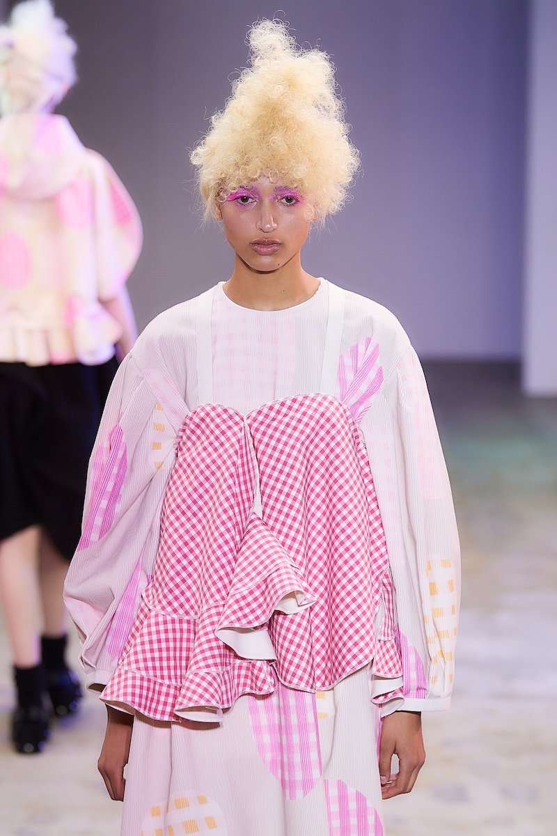 曲線の表現は、ギンガムチェックのハーフジップトップスの袖やウエストのフリル、ダブルブレストコートのビッグラペル、テーラードジャケットやパンツの丈や裾にも広がる。デザインステッチや裏地をあえて見せるトリミングによって、丸みがルック全体でさらに際立ち、独特の存在感を放った。