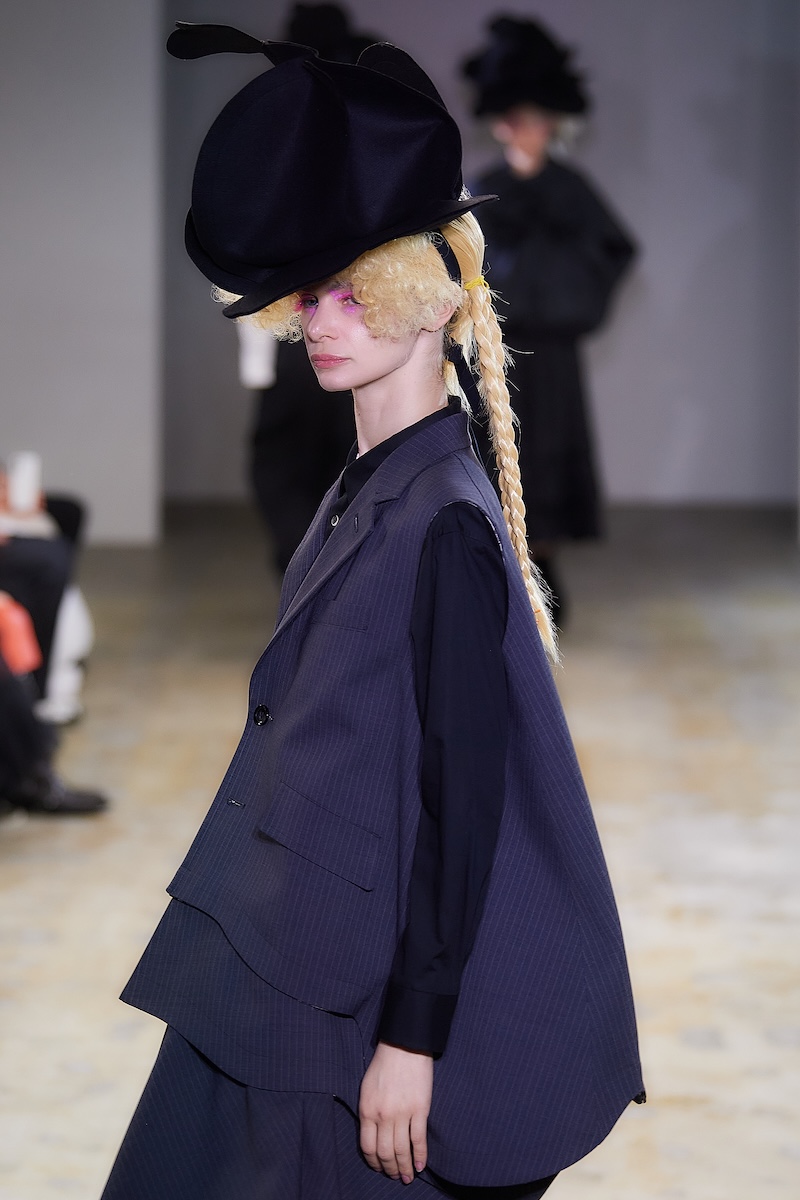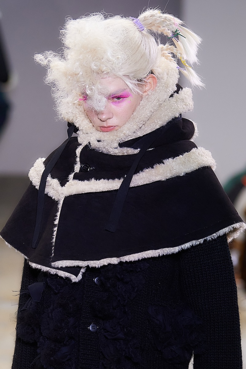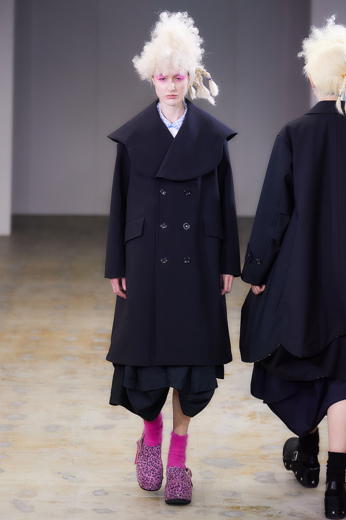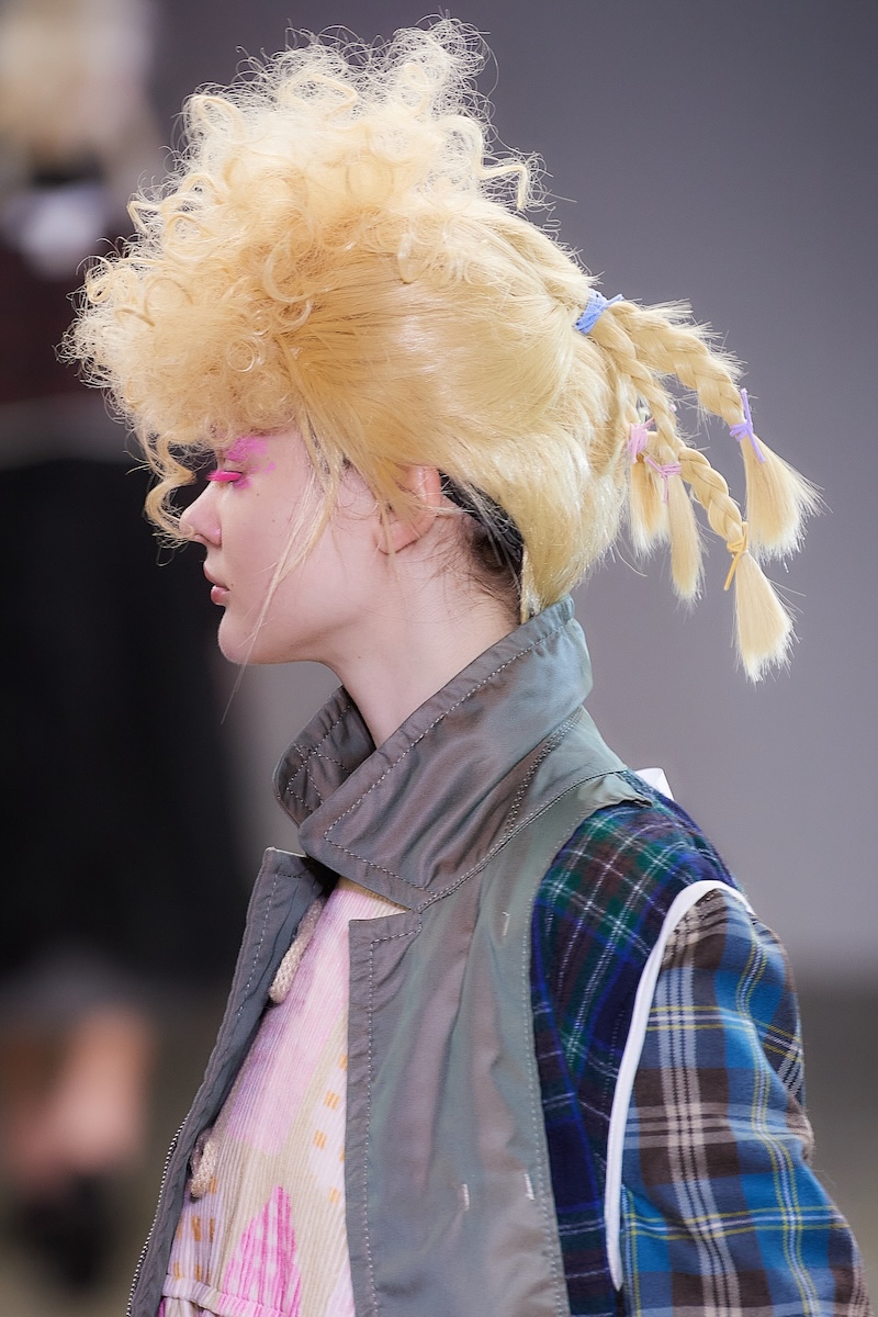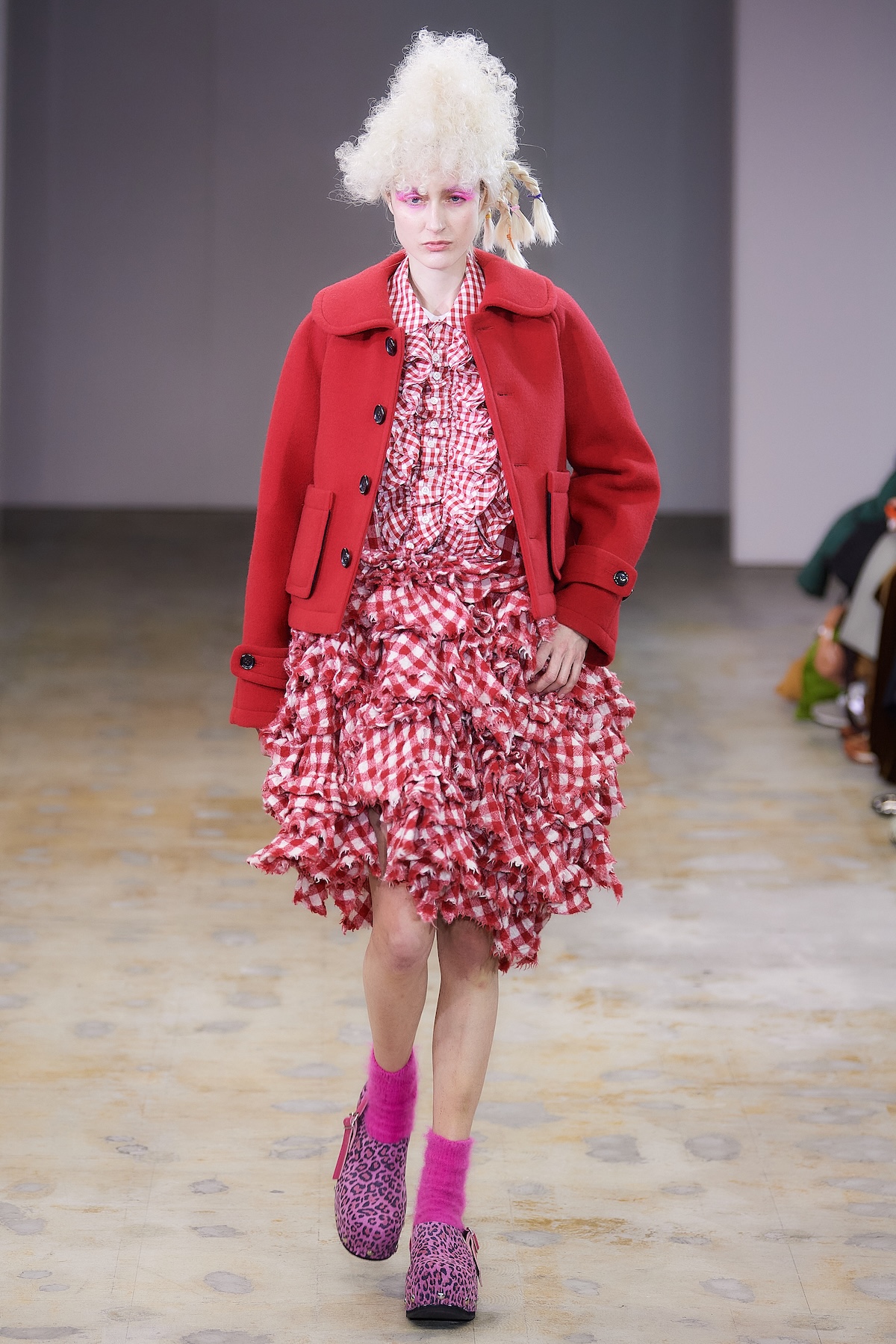 曲線の表現は、ギンガムチェックのハーフジップトップスの袖やウエストのフリル、ダブルブレストコートのビッグラペル、テーラードジャケットやパンツの丈や裾にも広がる。デザインステッチや裏地をあえて見せるトリミングによって、丸みがルック全体でさらに際立ち、独特の存在感を放った。