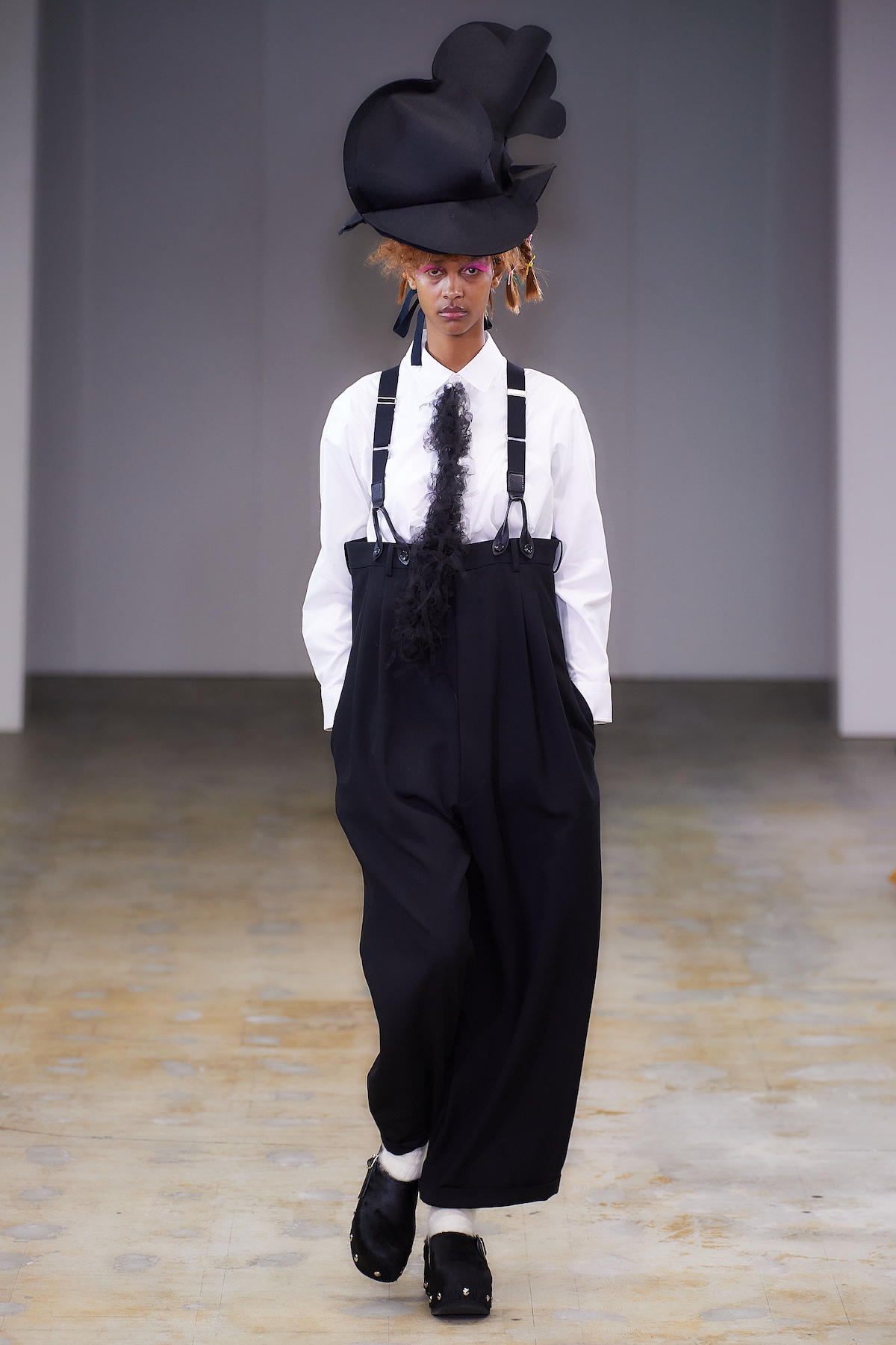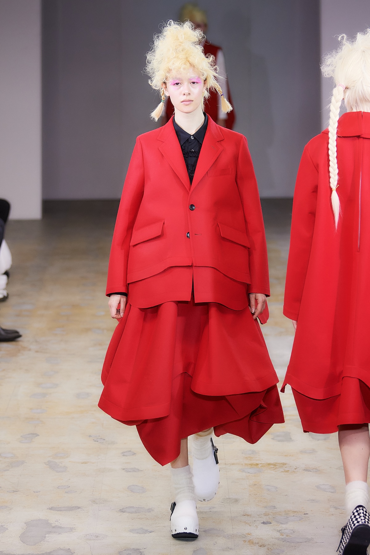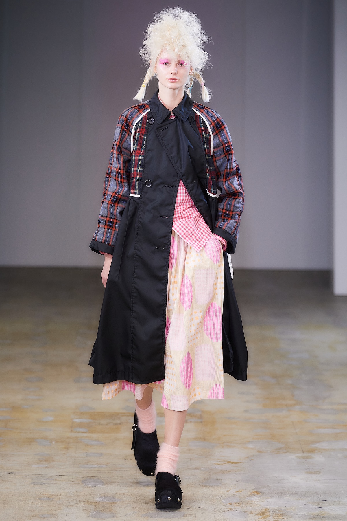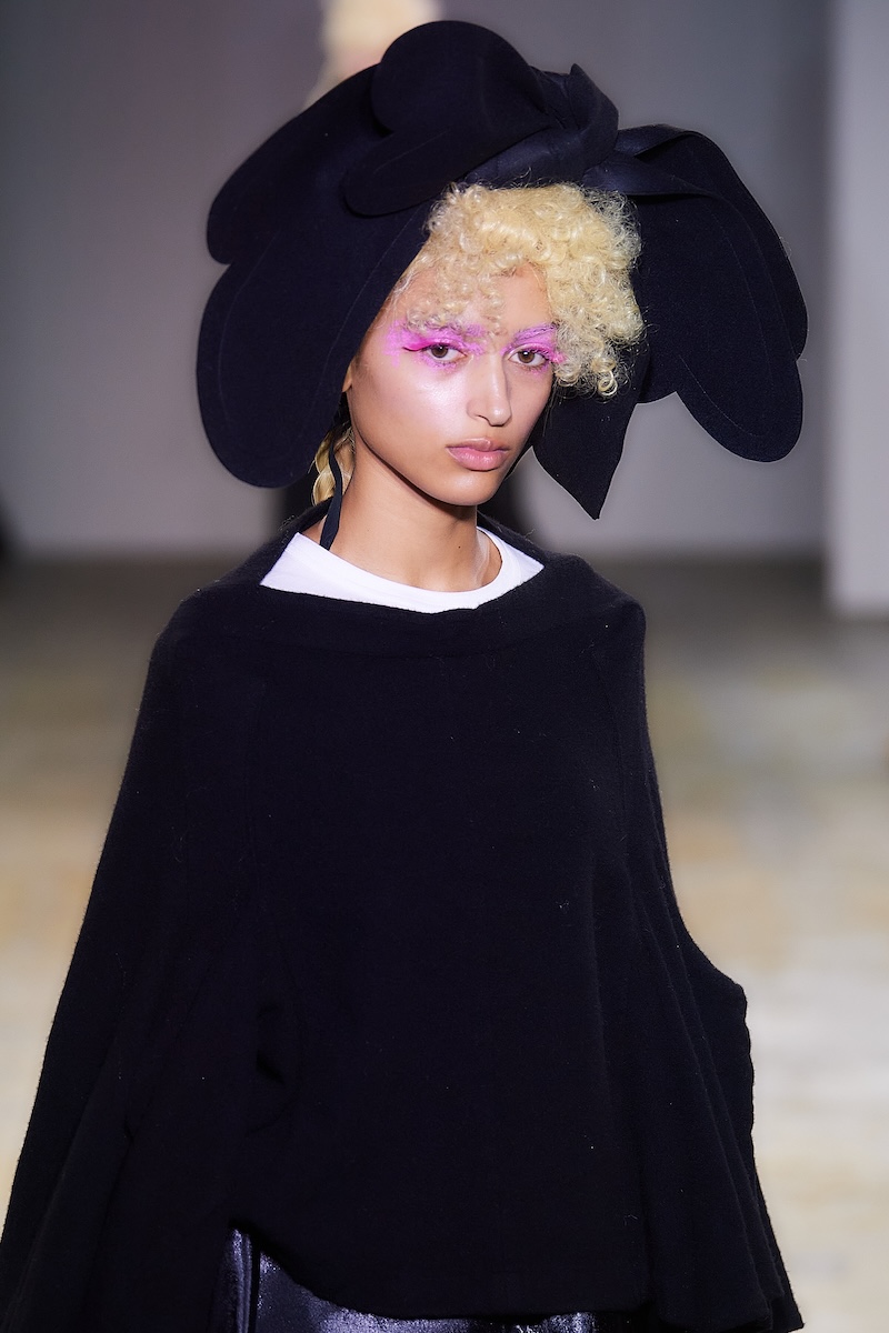 曲線の表現は、ギンガムチェックのハーフジップトップスの袖やウエストのフリル、ダブルブレストコートのビッグラペル、テーラードジャケットやパンツの丈や裾にも広がる。デザインステッチや裏地をあえて見せるトリミングによって、丸みがルック全体でさらに際立ち、独特の存在感を放った。