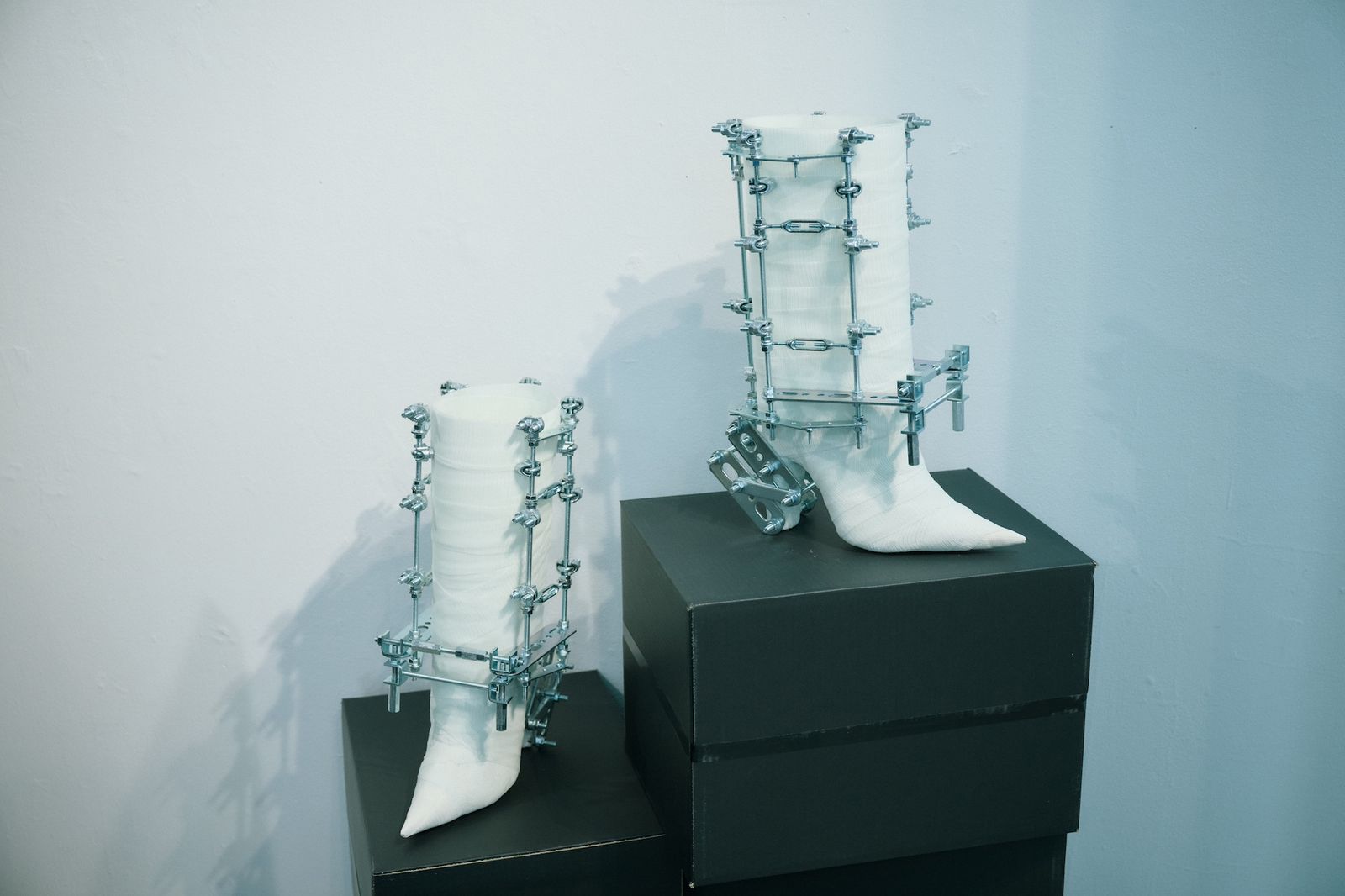 それを作品でどう表現するかと思った時に、ギプスが思いつきました。今回はハイヒールをベースに、そこにギプスを巻いて。靴は本来足を守るのが目的ですが、ハイヒールは装飾性を優先してった結果、(履いていると)指が変形してしまったりする。そういった守るべきものが、逆に悪くしてしまうというのを、戸田さんの作品と僕のポスターで表現しました。
