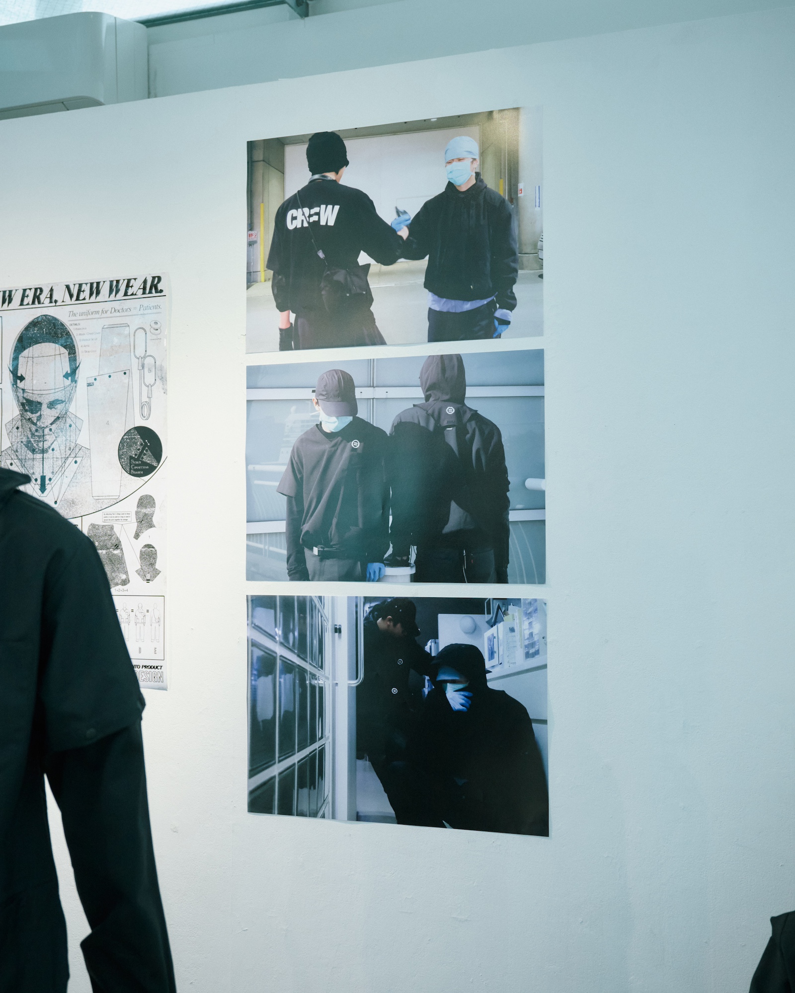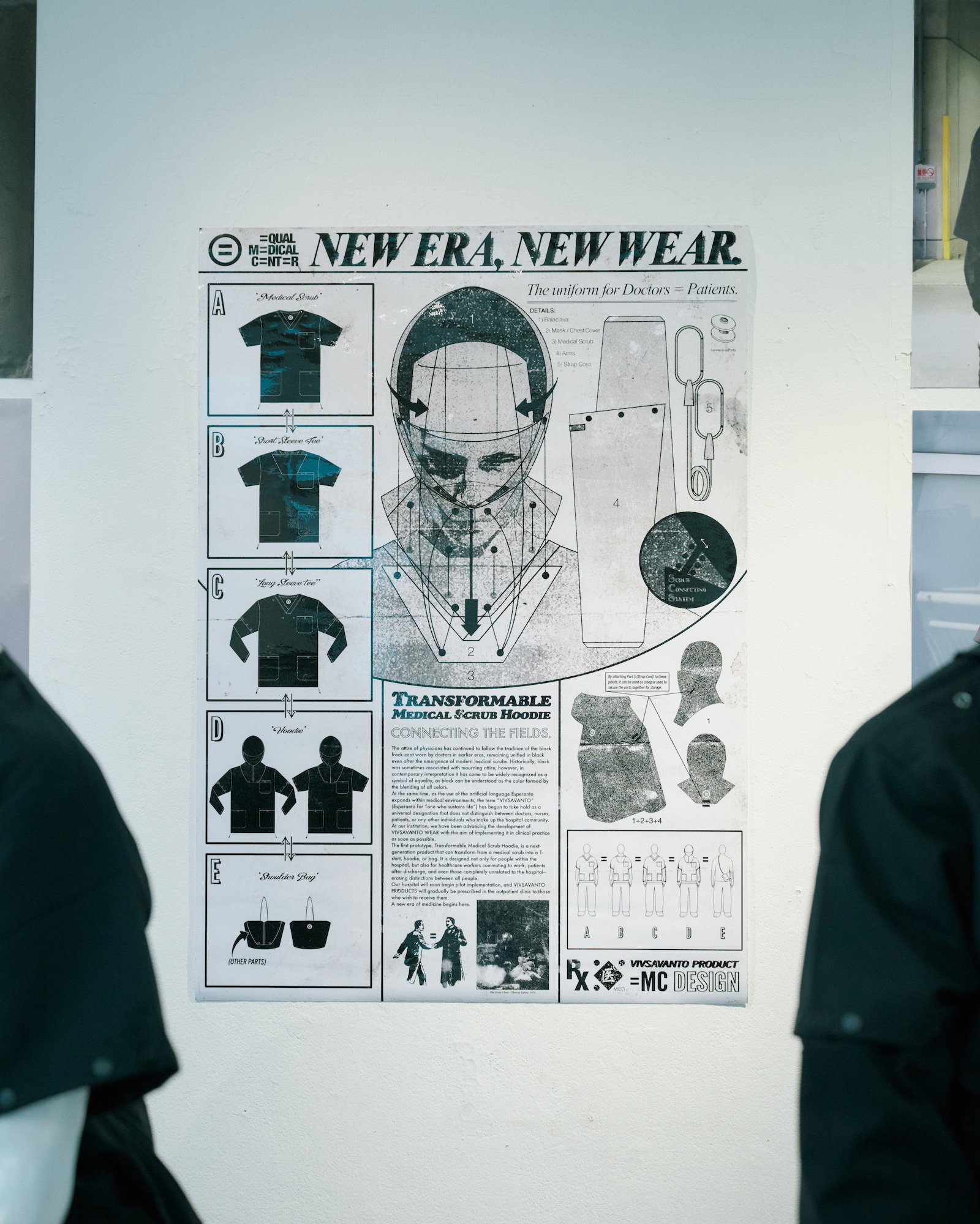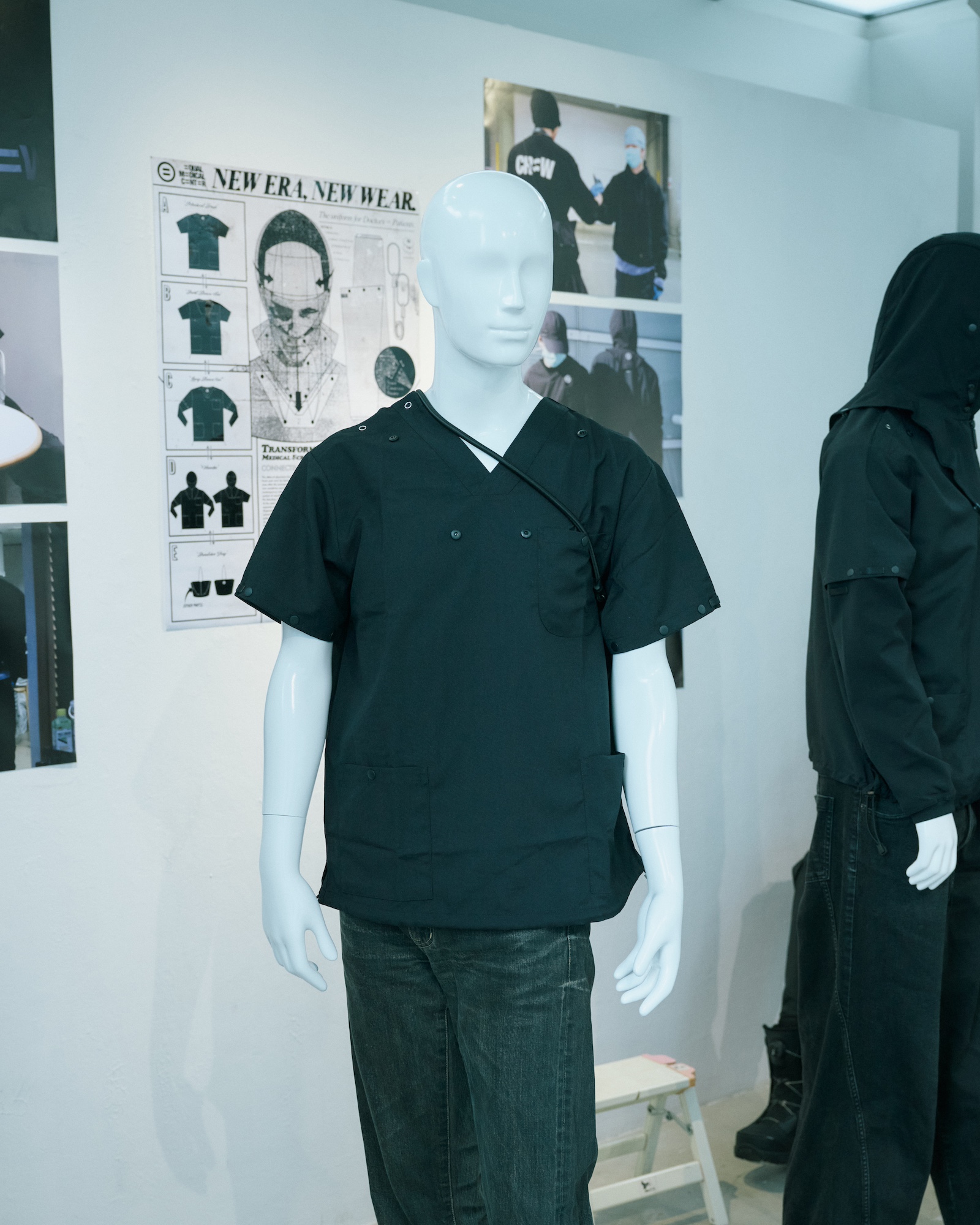 陣内:このパーカーやバッグにもなる変形スクラブです。ここ数年、衣服をグラフィックデザイン的に解釈しようとしていて、「スクラブがなぜ医者らしく見えるのか」って考えたら、理由もなくVネックになっているところと、半袖かなと思って。それで袖やフードをつけたら、医者に見えなくなるんじゃないかと考えました。そこから展示全体として、医療業界の固定観念を変えるをテーマに作品を作っていきました。