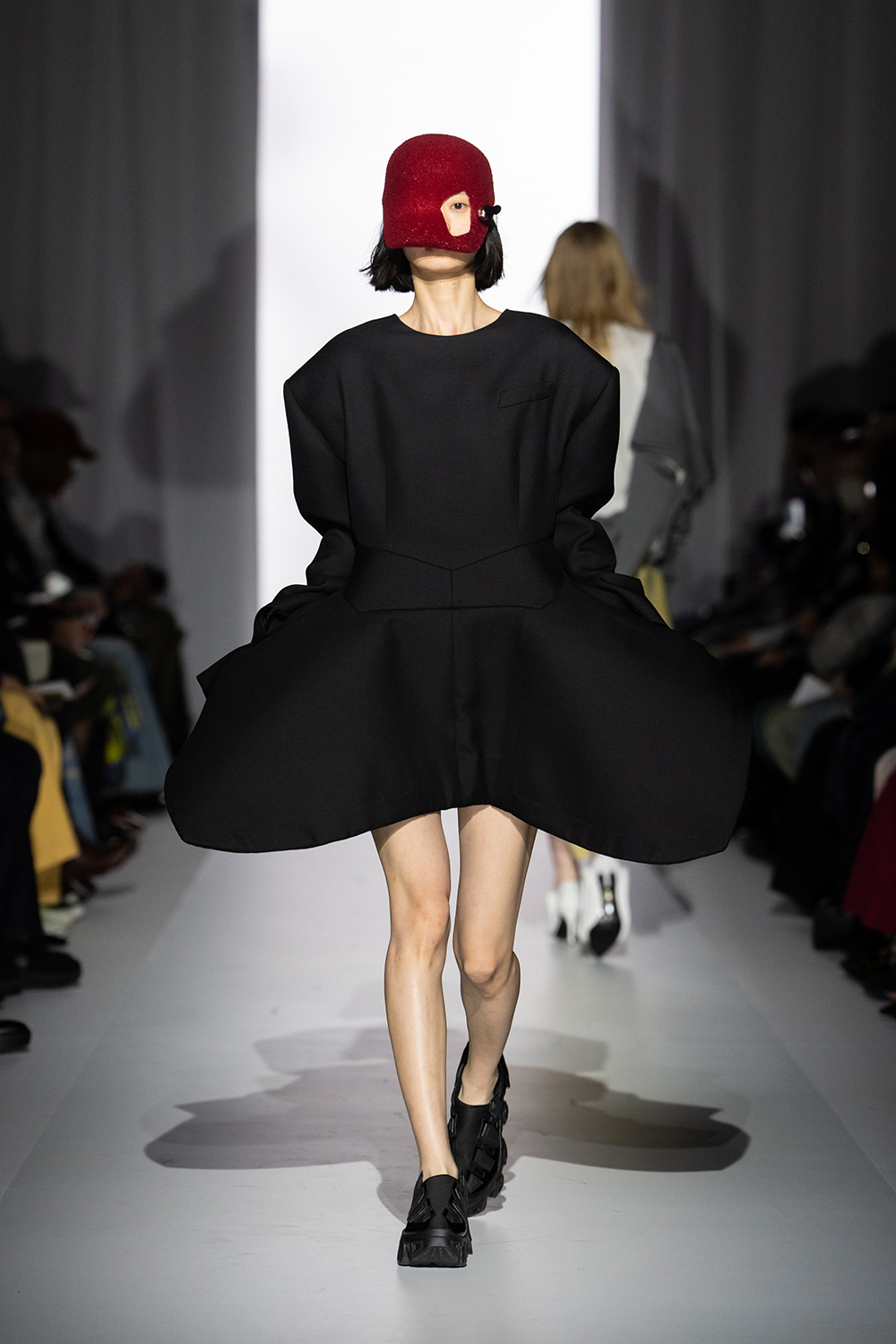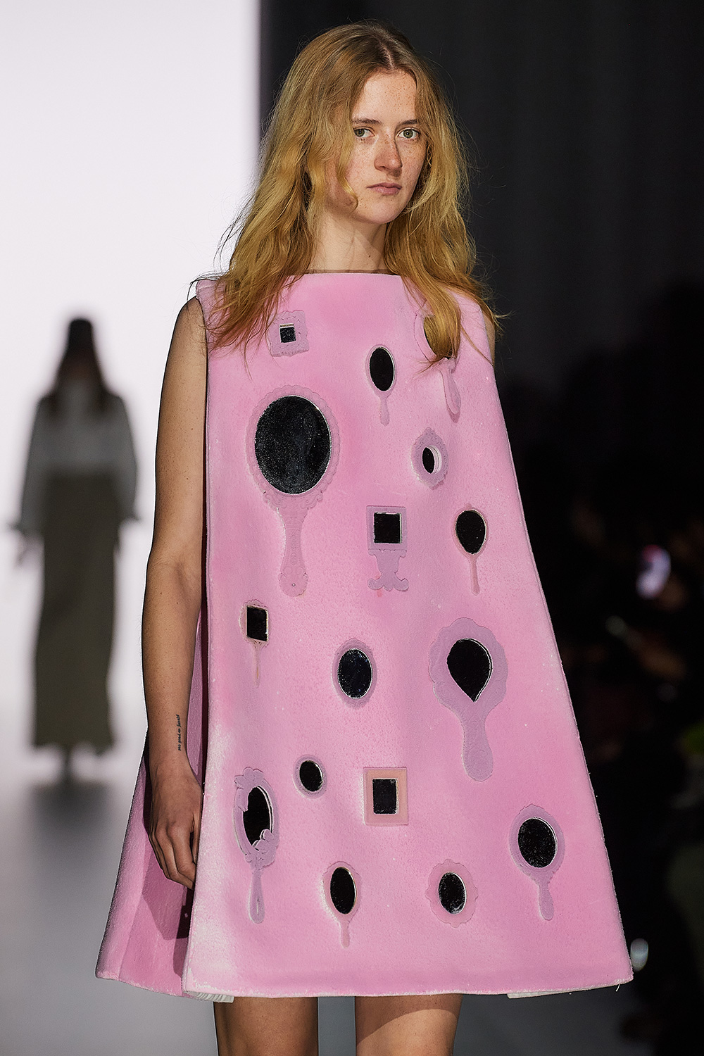 2年ぶりのショーは「Ideal Palace」をテーマに、核であるフォルムメイキングを打ち出した。さまざまな鏡を貼り付けたような四角いショート丈のワンピースや、裾を腰の部分で持ち上げたように全身にねじれを生んだコートなど、アトリエで生まれる発想をそのまま形にしたショーピースが登場。一方で、シャツやニット、ジャケットといったリアルクローズを交えた。片目に穴をあけたキャップやワイングラスをゆがめた指輪といった小物も違和感をもたらした。