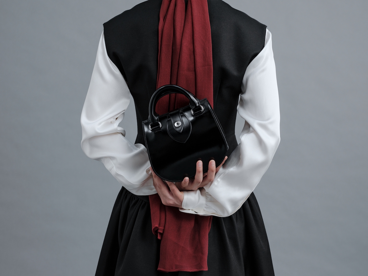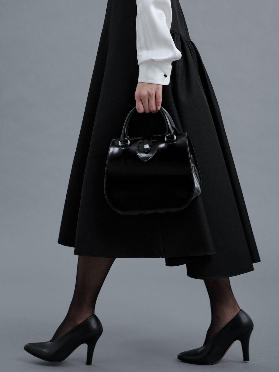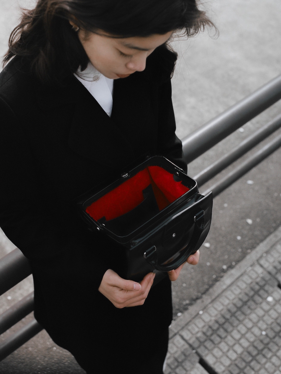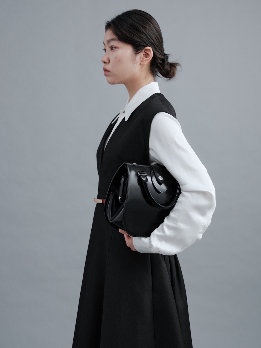 バスガールが憧れの職業だったことを表すように、所作を美しく見せるようにデザインした。ホックをディテールとして取り入れることで、「きちんと開け閉めする」というひと手間をあえて生んだ。バッグ本体にはグランドピアノのように艶やかなガラスレザーを、内装には優しい肌触りのピッグスエード(豚革)を採用した。バッグの内側に広がる鮮烈なレッドは、バスガールの襟元やスカーフに用いられたカラーのオマージュだ。