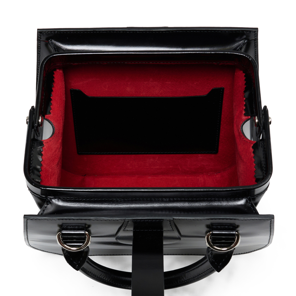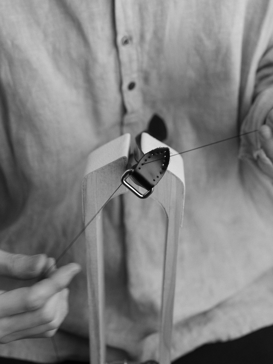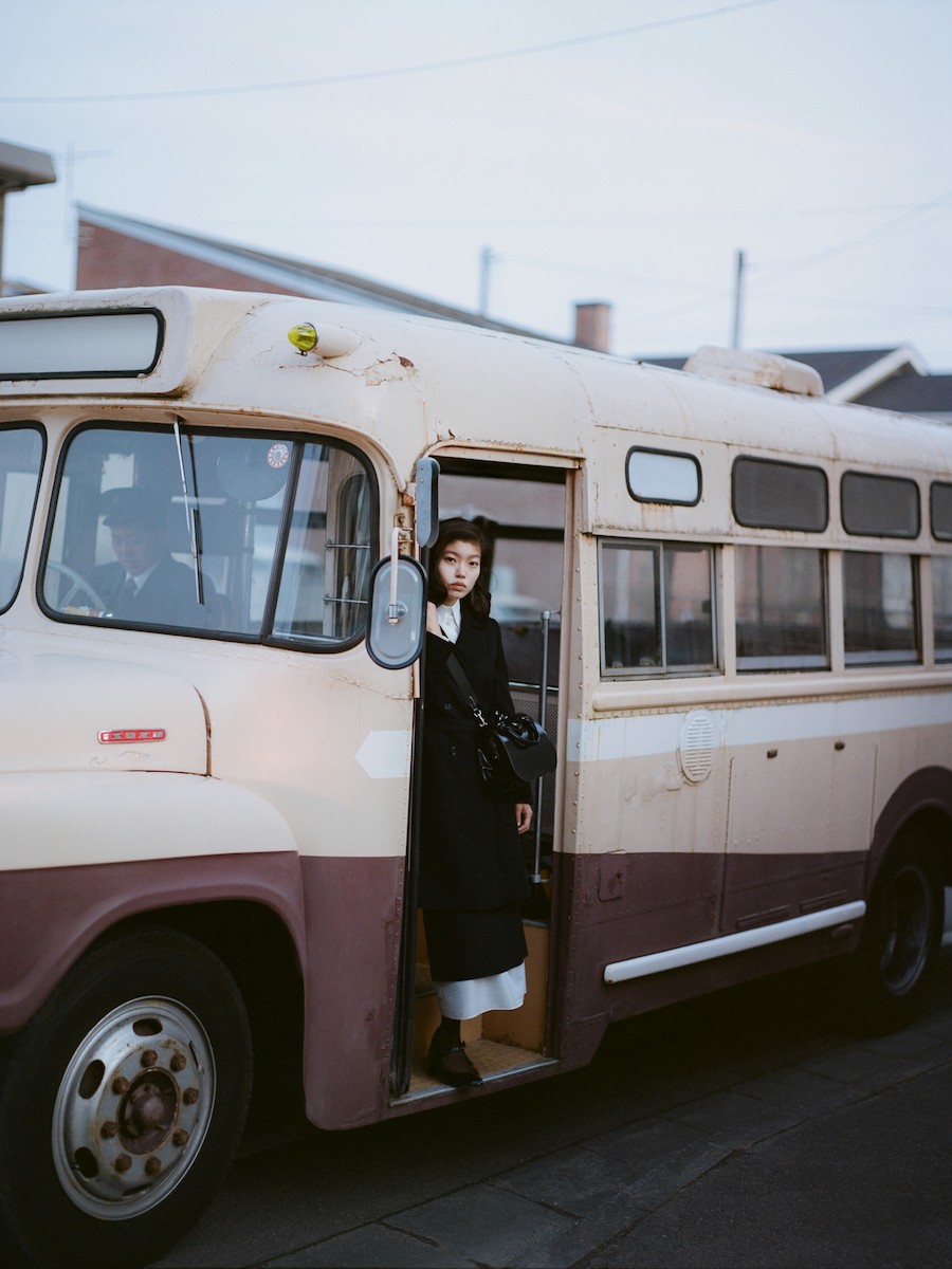 バスガールが憧れの職業だったことを表すように、所作を美しく見せるようにデザインした。ホックをディテールとして取り入れることで、「きちんと開け閉めする」というひと手間をあえて生んだ。バッグ本体にはグランドピアノのように艶やかなガラスレザーを、内装には優しい肌触りのピッグスエード(豚革)を採用した。バッグの内側に広がる鮮烈なレッドは、バスガールの襟元やスカーフに用いられたカラーのオマージュだ。