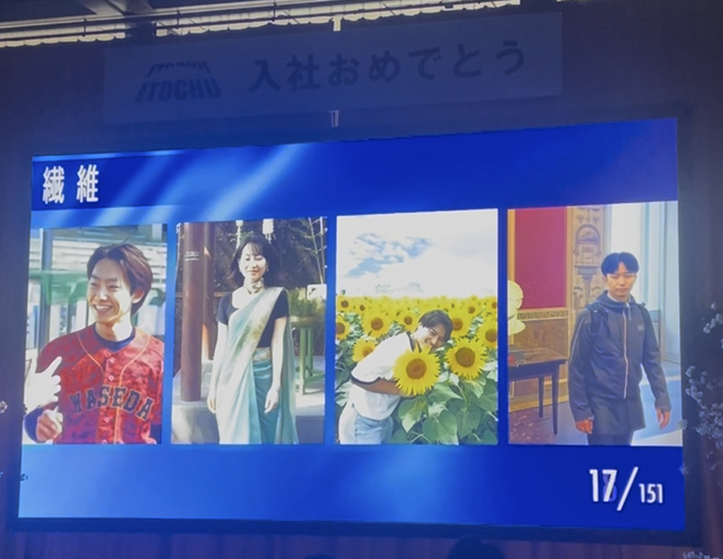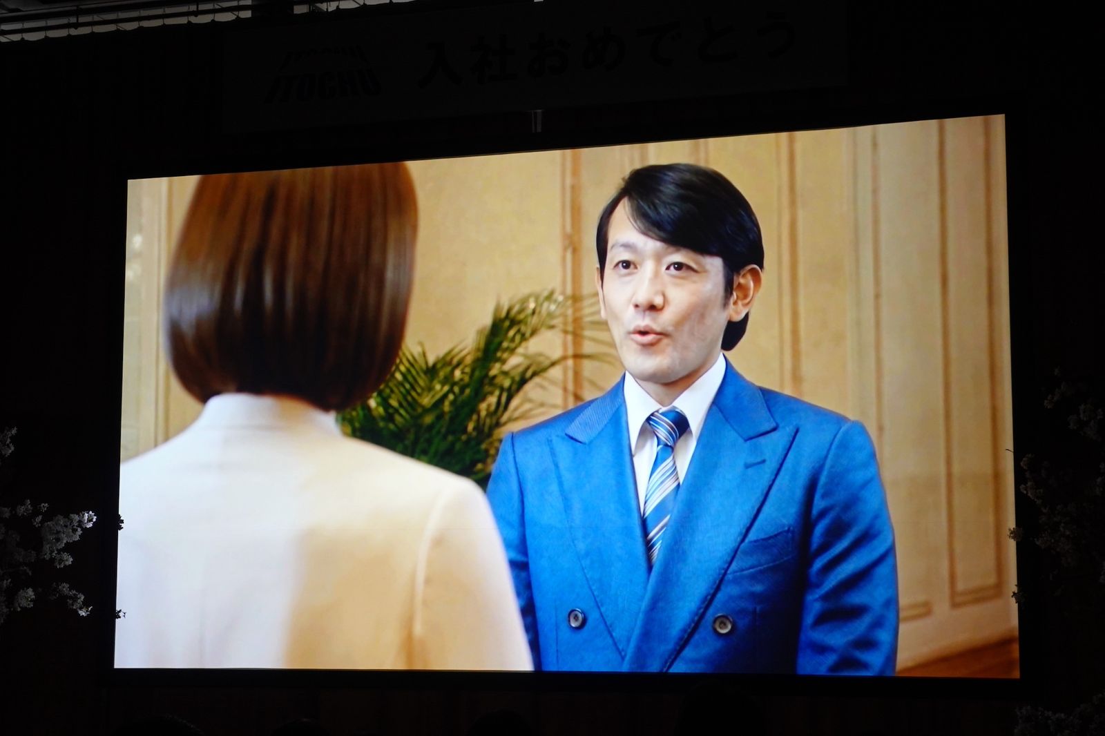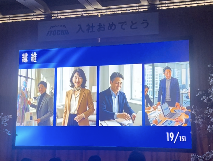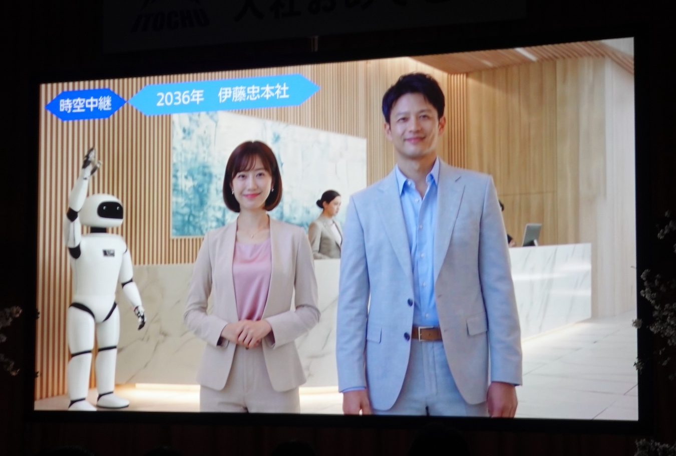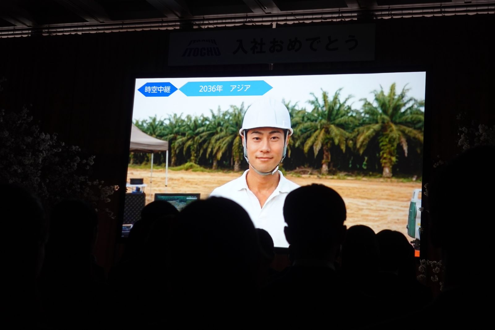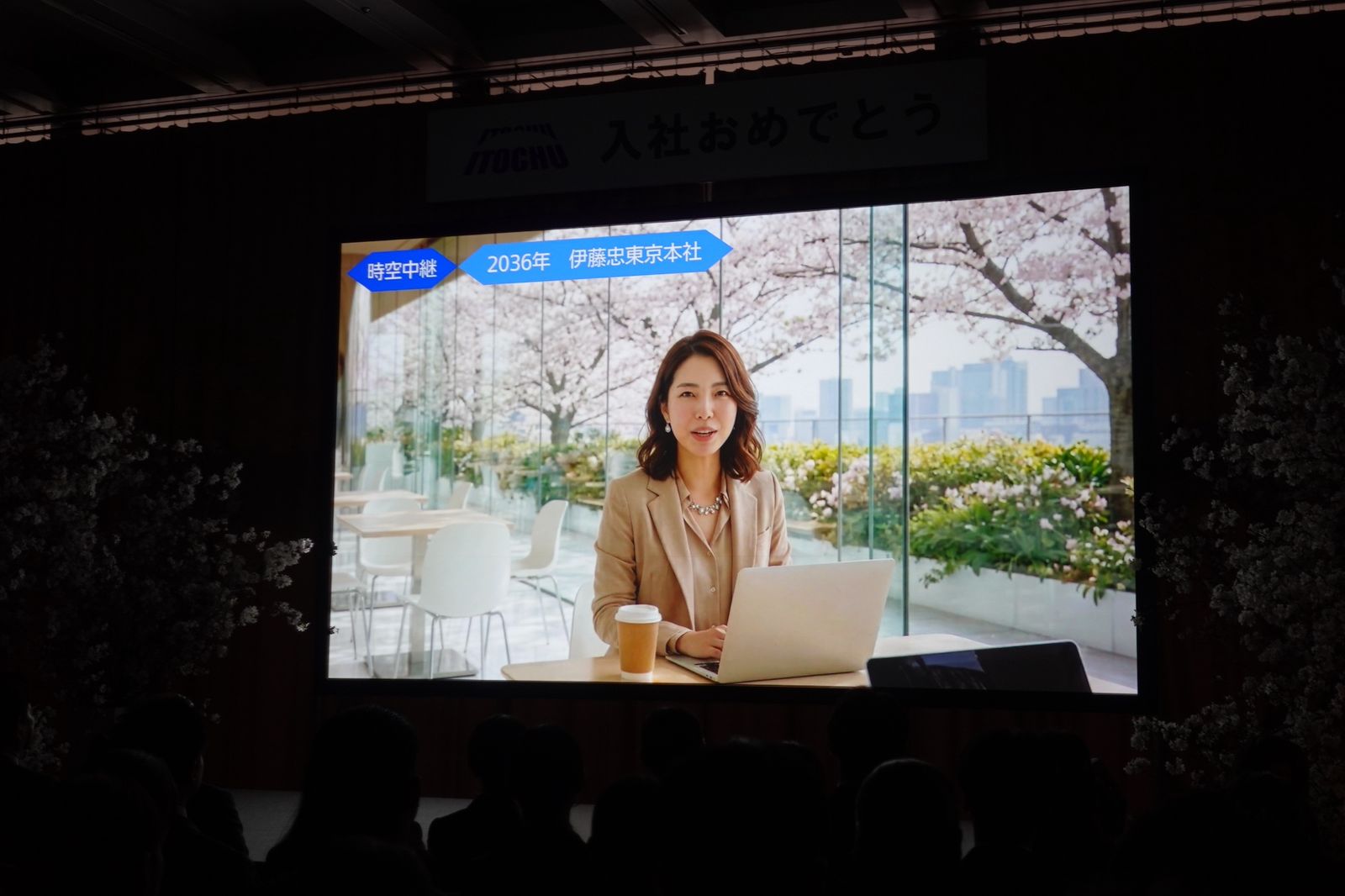 同社の入社式は、当日のオペレーションも含め、ほぼインハウスで行っている。生成AI動画も、グループの伊藤忠インタラクティブが制作。フィナーレでは新入社員全員の30年後の姿に成長させ、世界で活躍する姿をリアルに描いた。岡藤会長は「良かったやろー?私も感動した」とコメントした。