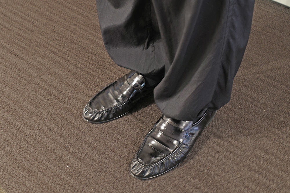 まずはPR界の優しき重鎮からスタート。普段はカジュアル派だが、最近髪を切ったことで「貫禄がなさすぎる」と感じたそう。以来、3足の革靴をローテーションして引き締めるのが近頃のブーム。