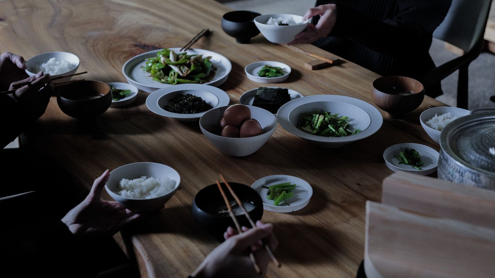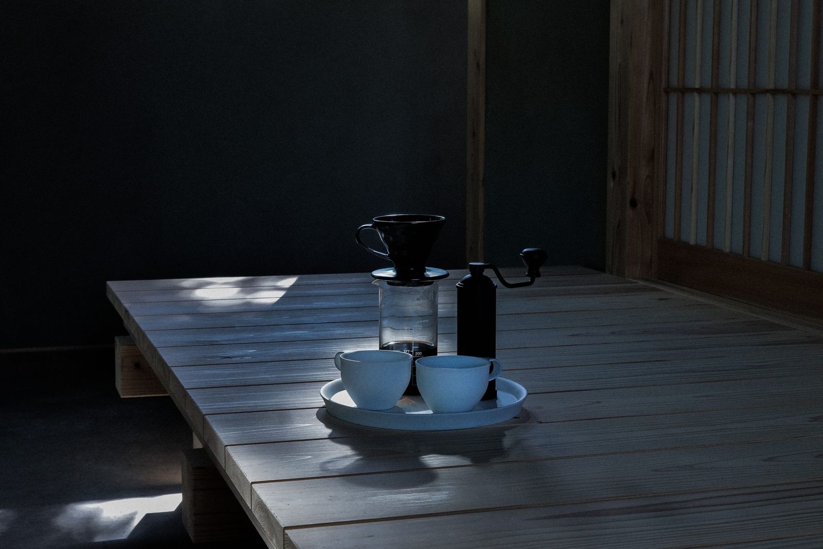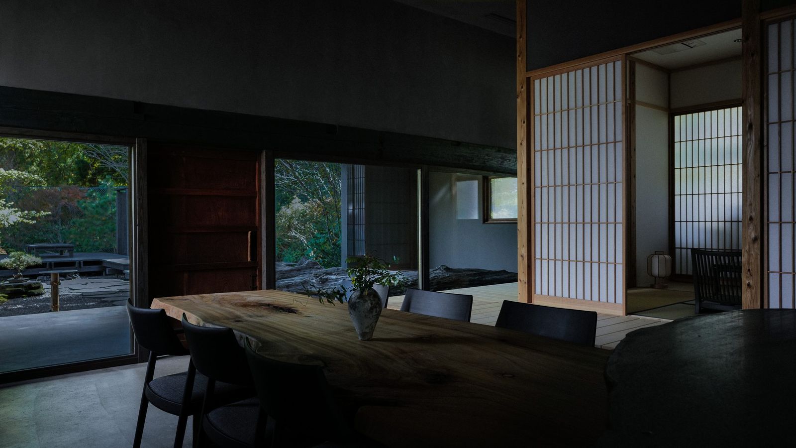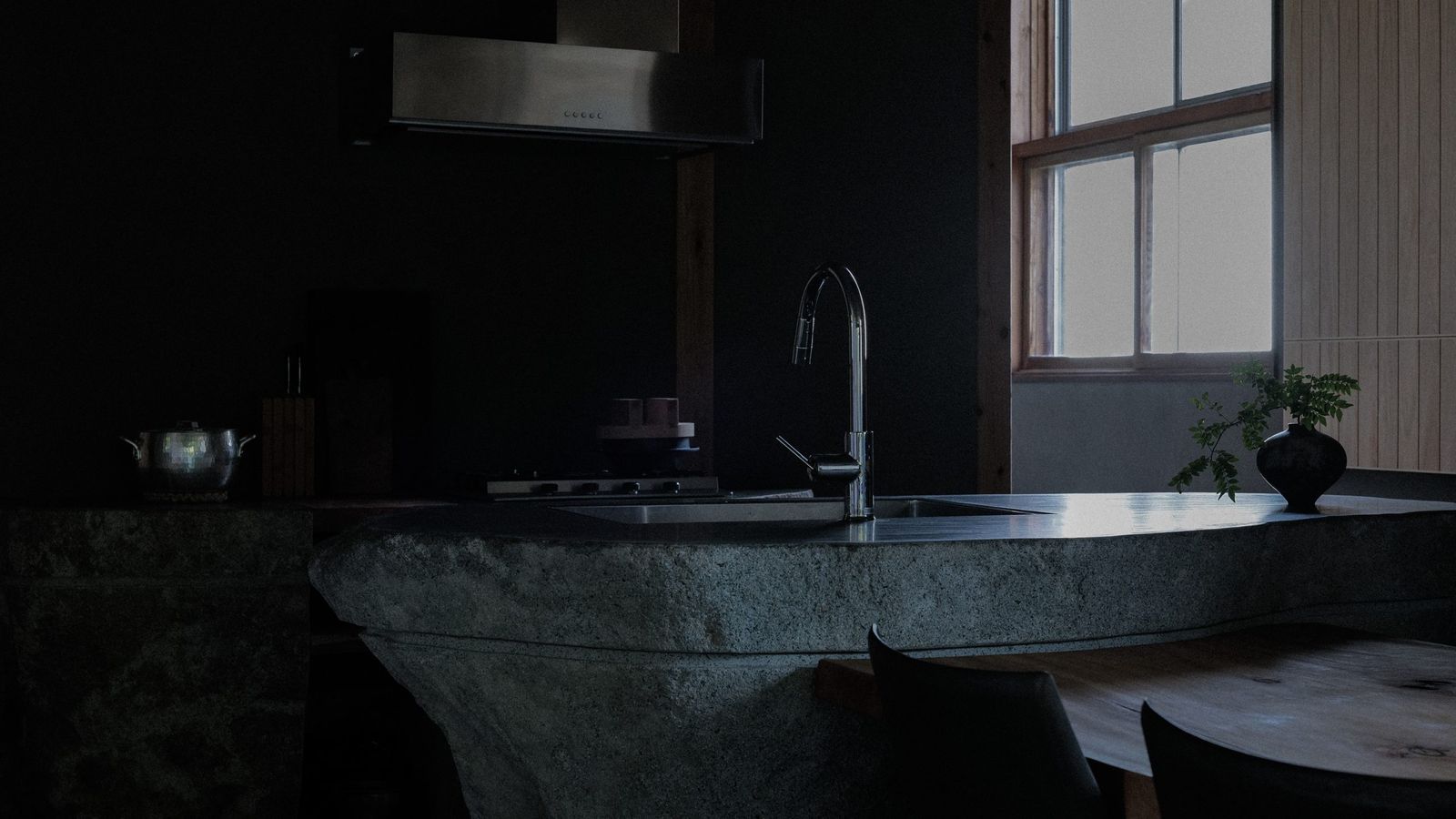 館内の中心となるのは、安山岩と御影石を用いたキッチン。150年以上前のクスノキを使用したダイニングテーブルとともに、素材そのものの存在感が際立つ。料理をする人、待つ人、語らう人の時間が交差し、滞在の軸を形成する設計だ。