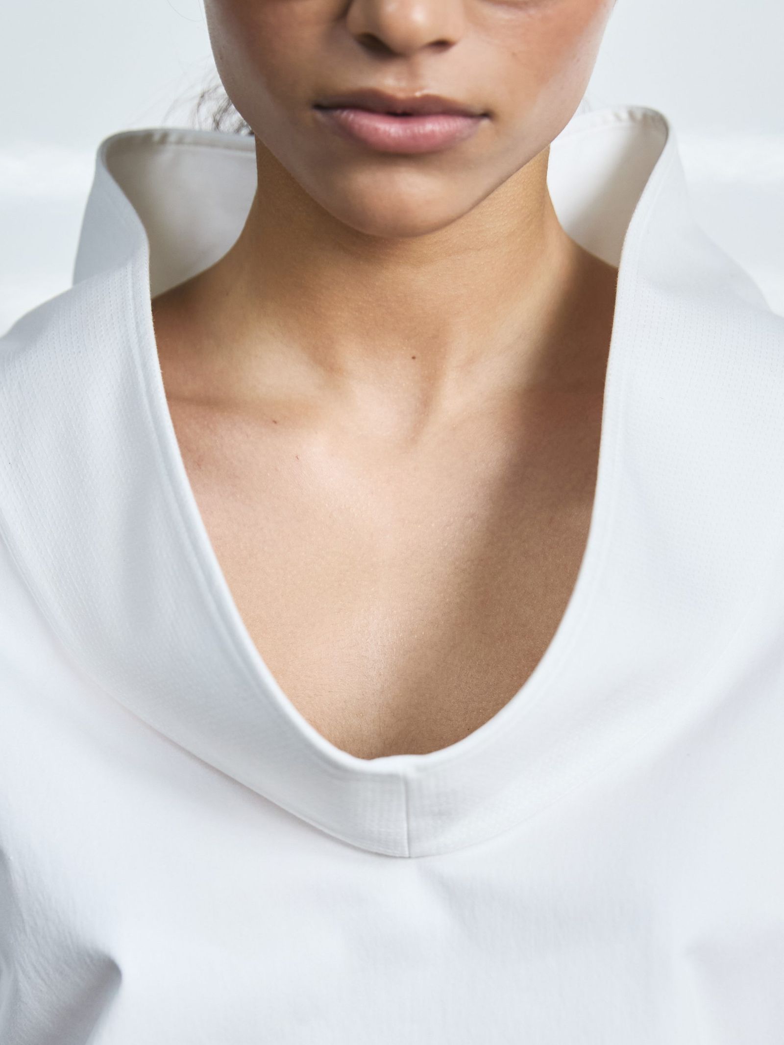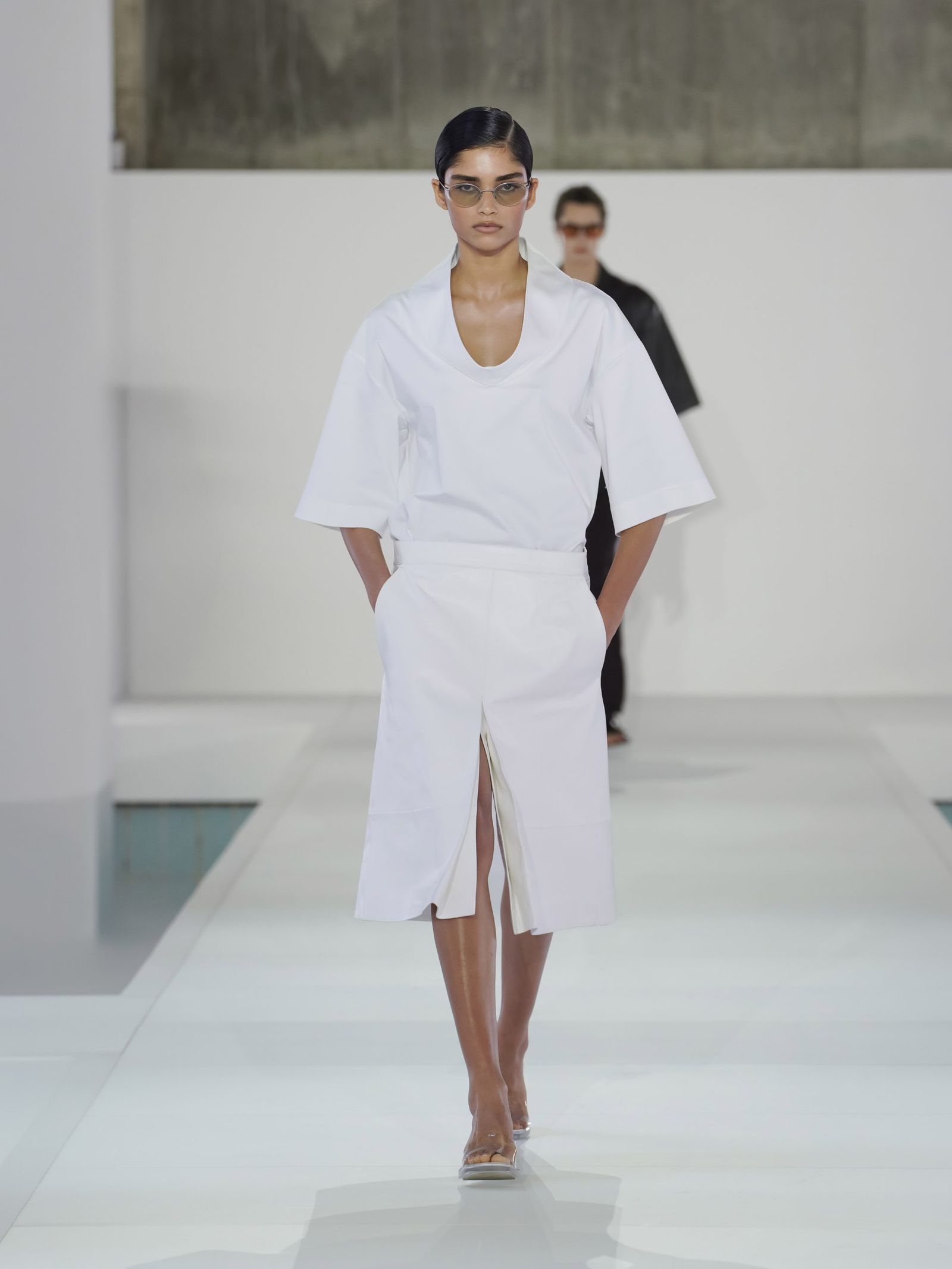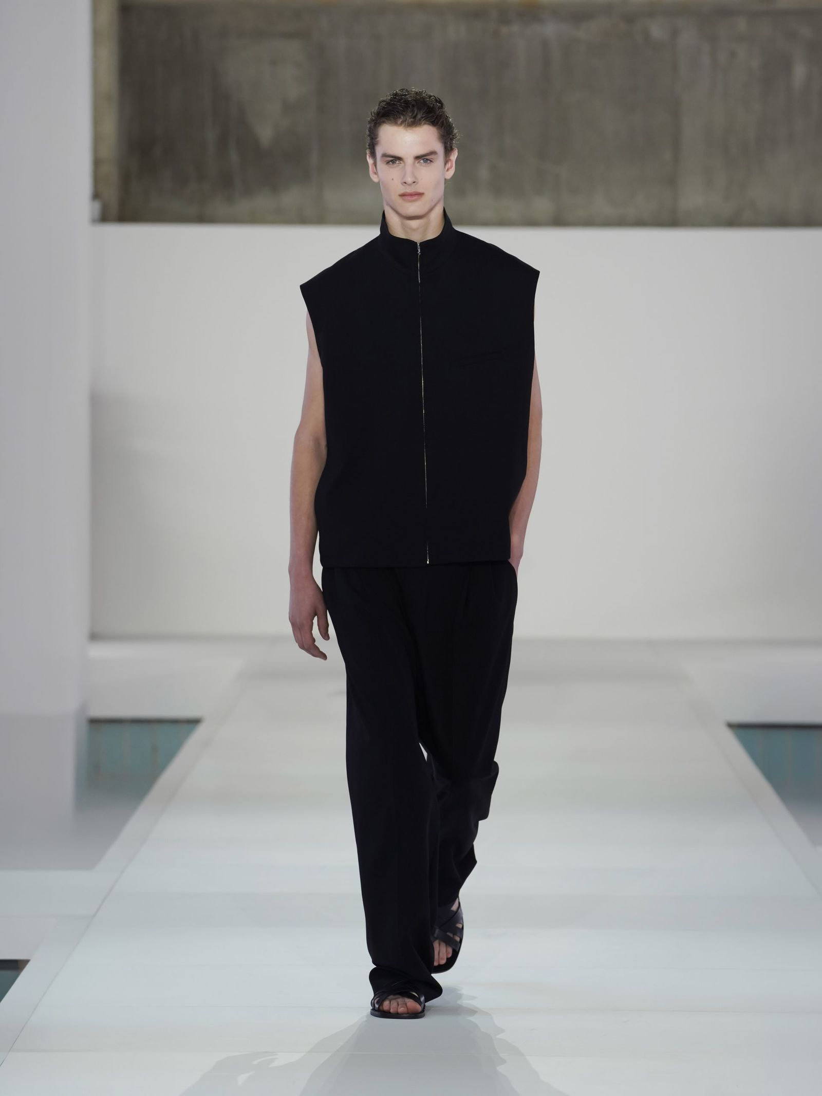 今回のショーは、ソウル郊外に位置するブルータリズム建築様式から着想を得た空間で行われた。使用されていなかったプールを再解釈し、空間とミニマルなルックが交差することで、シュルレアリスティックな雰囲気を生み出すことに焦点が当てられていた。