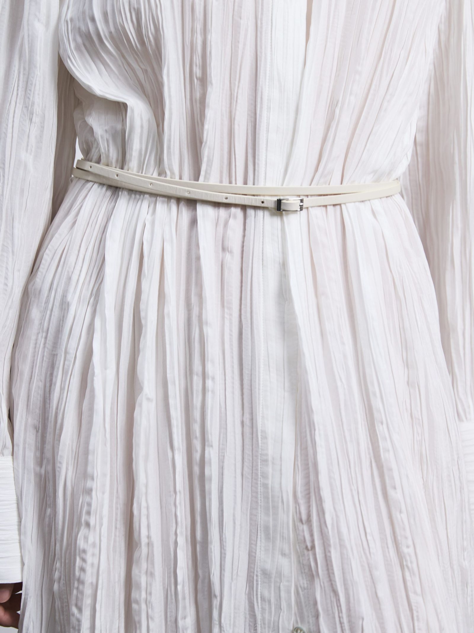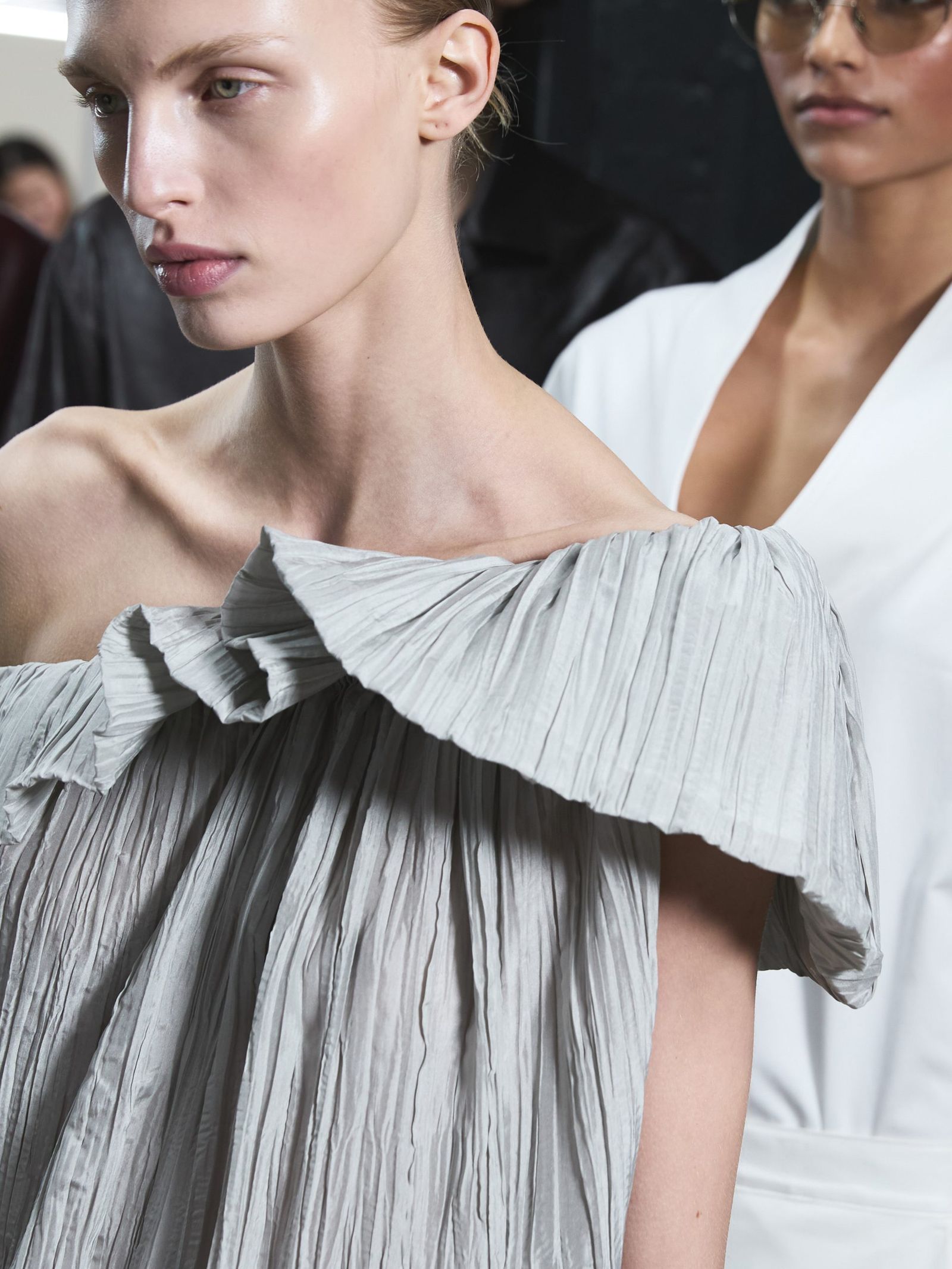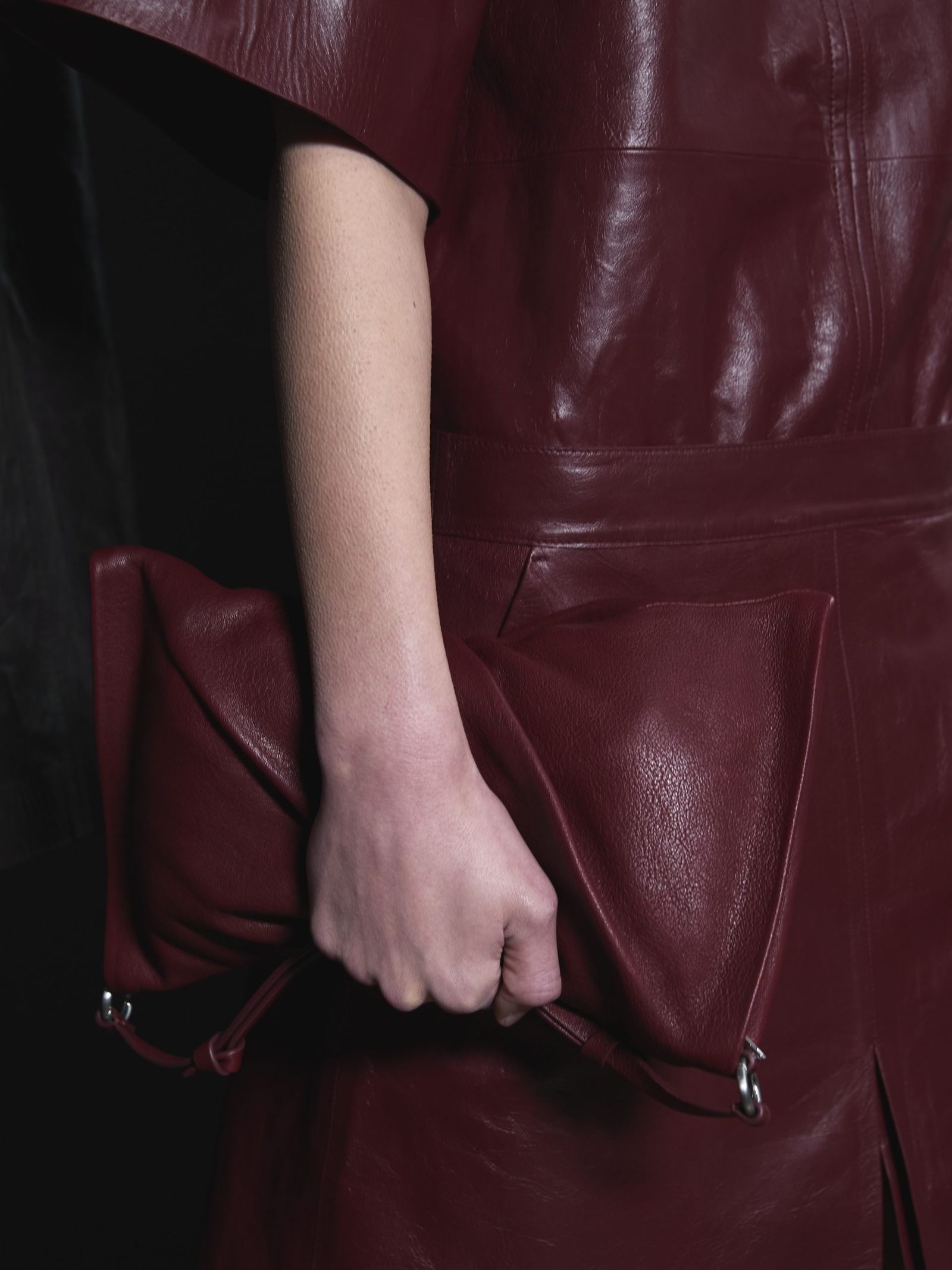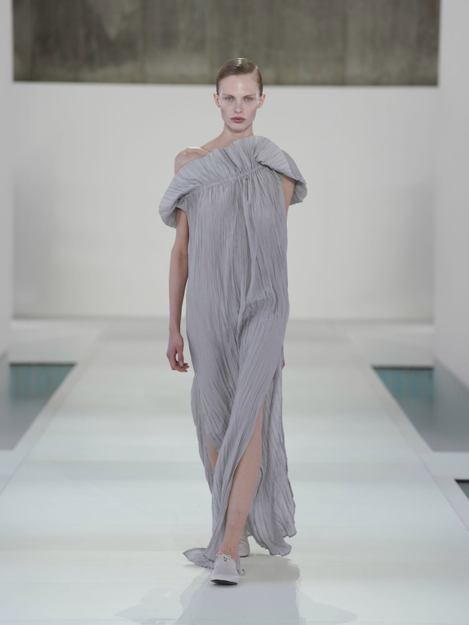 特に素材への探求が際立った今シーズンは、ほのかな光沢を放つレザーやテクニカル素材が、彫刻的なフォルムを強調していた。シワのディテールが印象的な紙のような質感から、奥行きのあるテクスチャーを持つリネンメランジ、そして動きに応じてシルエットが浮かび上がるシアー素材まで、エレガンスと洗練されたムードを際立たせたコレクションとなっている。