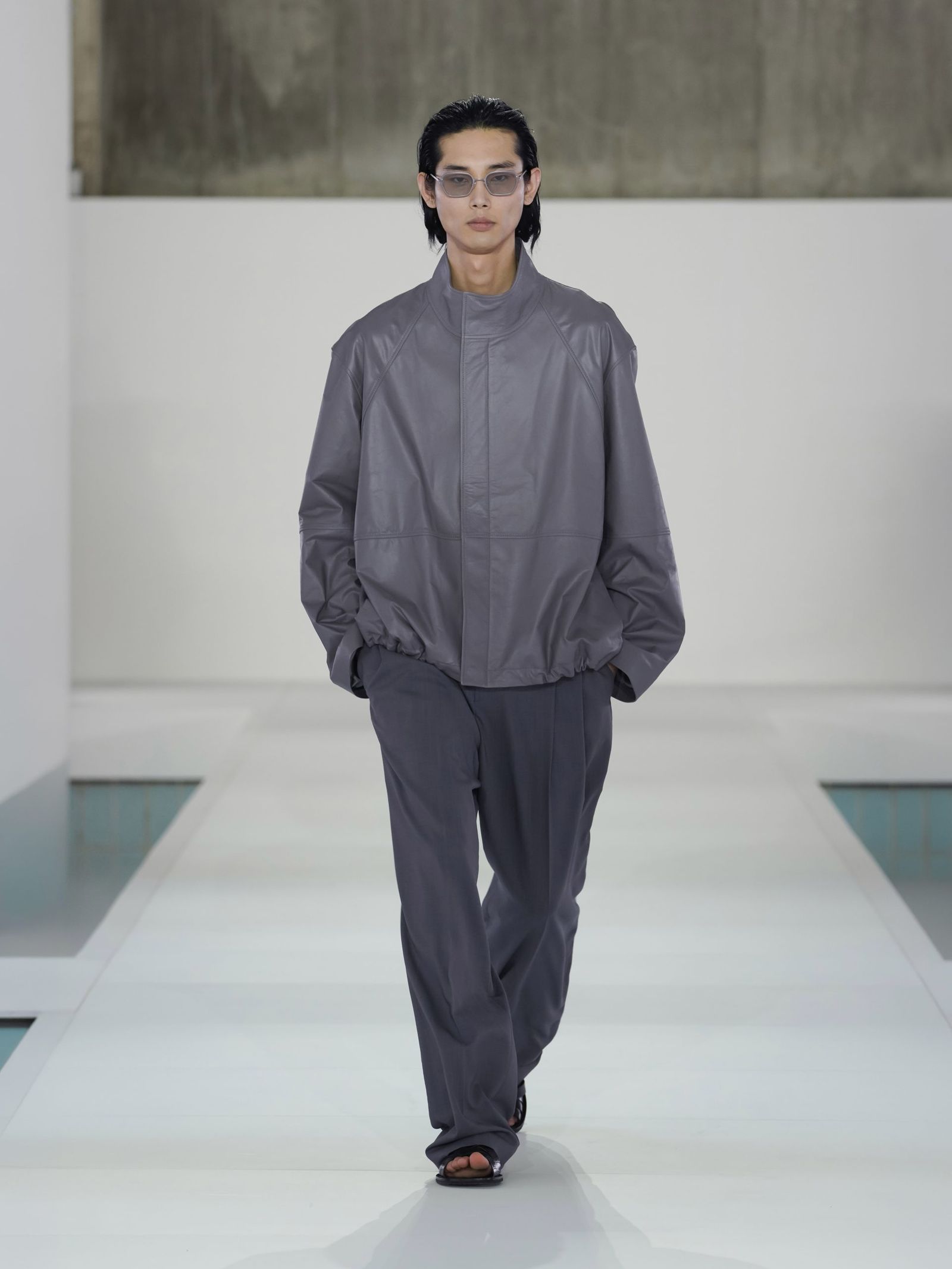 一つ挙げるなら、メンズではグレーのレザージャケットにテーラードパンツ、アイウエアを合わせたスタイルが今回のコレクションを象徴していると思います。ウィメンズでは、クリンクルレザーで仕立てたミニマルなドレスが印象的だと感じています。