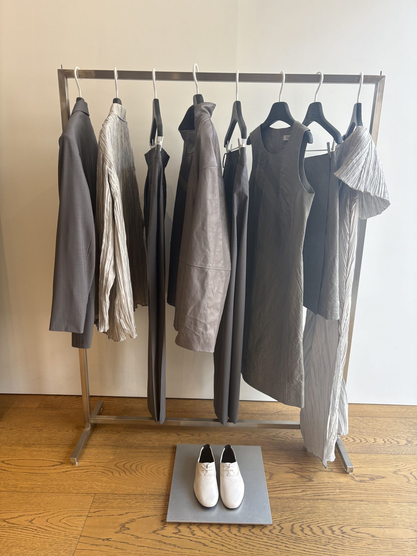 プロポーションと構築的なレングスで再解釈されたトランジショナルアウターは、クラシックとモダン、革新と芸術性のコントラストを生み出す。また、柔らかなレザーのプリムソールや構築的なヒールデザインが際立つミュール、異素材の調和によって仕立てられたバッグなど、「コス」ならではの視点で再解釈されたアイコニックなアイテムがルックを完成させた。